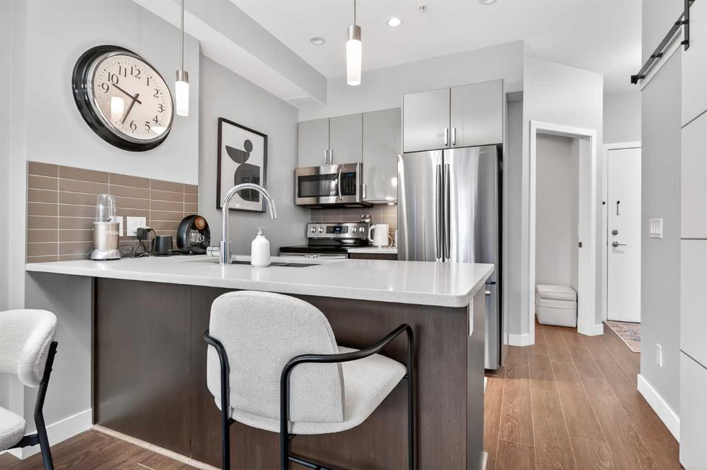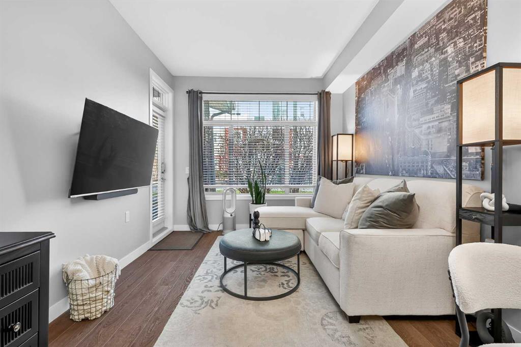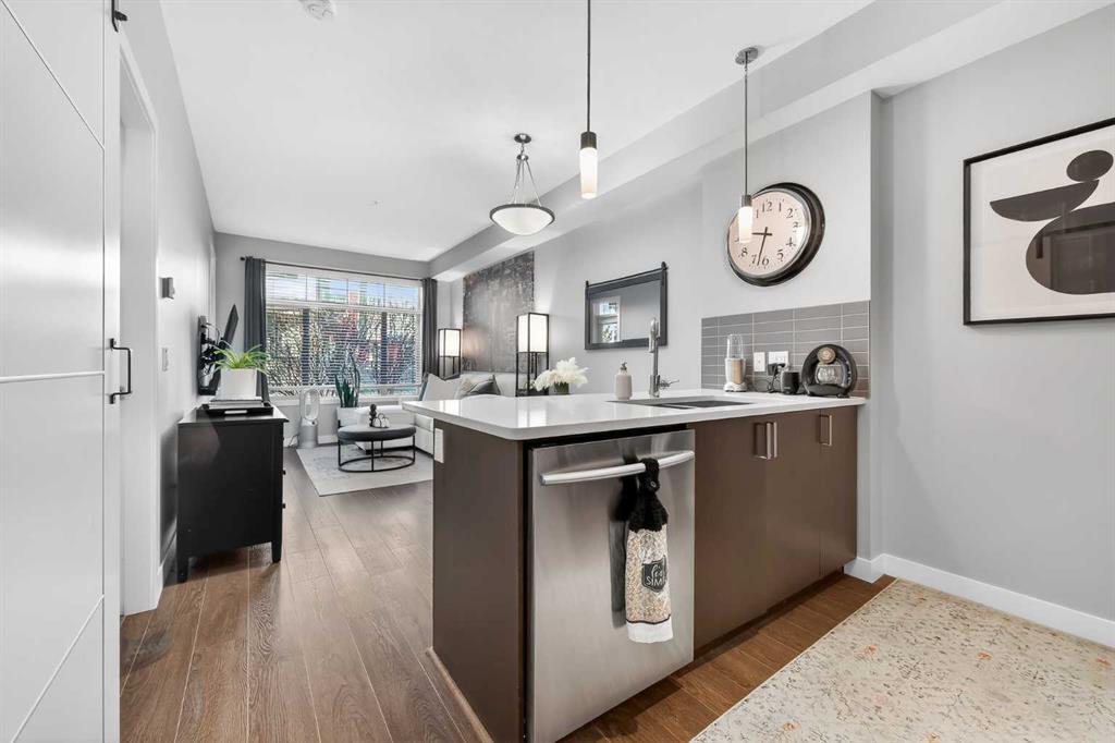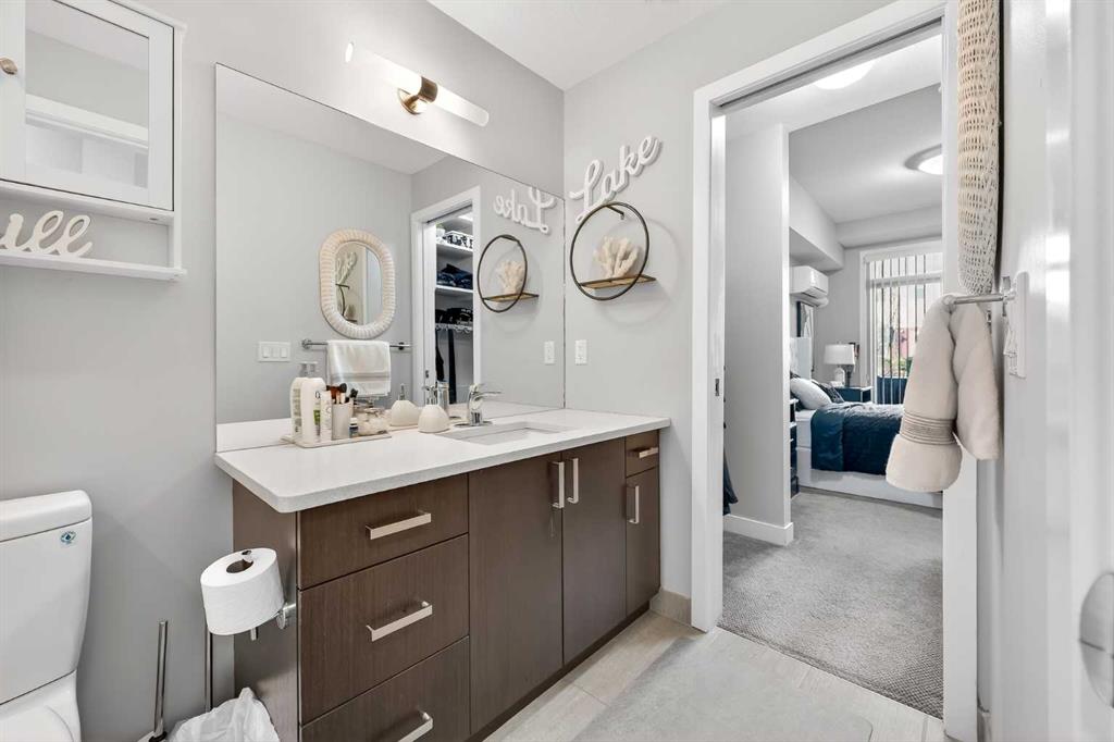 Pride of ownership shines in this fantastic ground floor condo in the premier lake community of Auburn Bay. This 1-bedroom plus den unit features an open concept layout with 9’ ceilings, fresh paint, and expansive windows. The modern kitchen is a standout, boasting quartz countertops, a large island, stainless steel appliances, and custom cabinetry. Step directly from your living room onto a massive private patio equipped with a gas BBQ line. The primary suite offers a walk-through closet and dual access to the 4-piece bath. Professional perks include infloor heating, a versatile den/office/storage space, underground parking, and a separate storage locker. Enjoy year-round lake access (skating, swimming, fishing, tennis) and walkability to the South Health Campus, YMCA, and Seton’s vibrant shopping district.