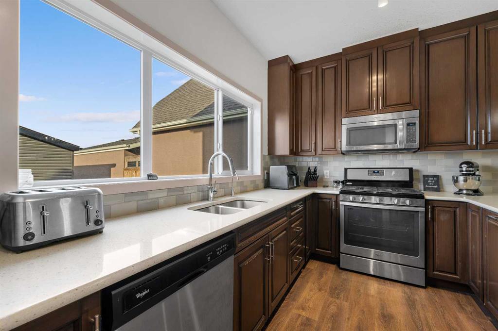 Welcome to the lifestyle you’ve been waiting for—where comfort, function, and community come together in perfect harmony. This beautifully maintained and thoughtfully upgraded home(2300+sqft) is nestled on a quiet, tree-lined street in the highly sought-after lake community of Mahogany. Surrounded by young families and just minutes from the wet lands, beach club, shopping, dining, schools, and parks, this is the kind of place where memories are made. From the moment you arrive, the curb appeal sets the tone—with a gorgeous landscape framing the front yard and a charming front elevation that welcomes you in. Step inside to discover a sunny, open-concept main floor with 9 feet ceilings designed for everyday living and easy entertaining. The front living room is bright and spacious, featuring oversized windows and a cozy electric fireplace framed by an exceptional media console—a perfect spot to gather and unwind. Centrally located, the dining room can comfortably fit a large table and sits beneath a modern light fixture, seamlessly connecting the living room to the heart of the home: the U-Shaped Gourmet kitchen. With dark brown cabinetry, white quartz countertops, a stylish mini brick subway backsplash, stainless steel appliances, and a sleek microwave hood fan, this kitchen checks all the boxes. LED lights and rich LVP floors run throughout the main floor, adding warmth and elegance. Tucked away just off the stairs, you’ll find a smart and efficient pocket office—the ideal space for a home office, study area, or creative studio—providing flexibility for today’s work-from-home lifestyle. Upstairs, the primary bedroom is a peaceful retreat with a generous walk-in closet, and a spa-inspired ensuite featuring a soaker tub and a walk-in shower. Two additional bedrooms overlook the nicely landscaped backyard and are serviced by a full bathroom and a convenient upper floor laundry room. Downstairs, the professionally developed, fully legal basement suite offers incredible flexibility with a separate entrance, two bedrooms plus an additional den, a modern kitchen, private laundry, and a full bathroom—ideal for multigenerational living, guests, or income potential. Step outside and enjoy a two-tiered backyard experience: a raised deck for BBQs and lounging, and a lower fully fenced and landscaped yard ideal for evening fires or summer dinners under the stars. Additional outdoor features include an oversized double detached garage with storage trusses above, giving you even more benefits. This home offers a functional floor plan with features that blend timeless style & modern convenience. Whether it’s the prime location close to the lake, schools & all amenities, the mature street setting, or the cozy, inviting interiors—this one is truly special. It’s the perfect blend of luxury, lifestyle, & investment potential—all in one of Calgary’s most prestigious lake communities. Don’t miss the chance to make it yours