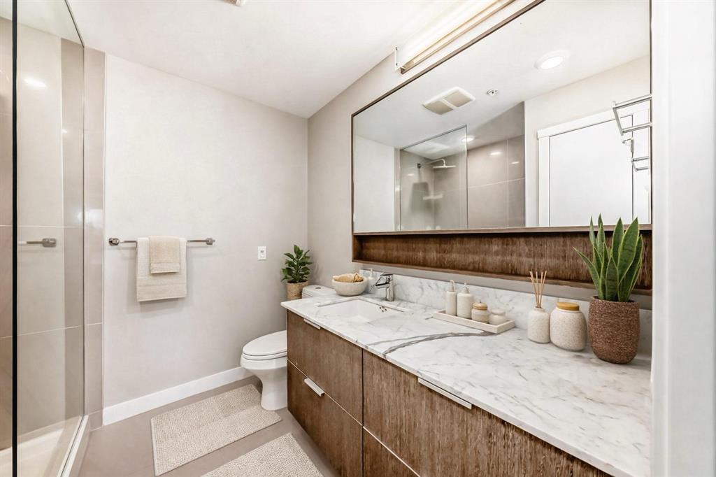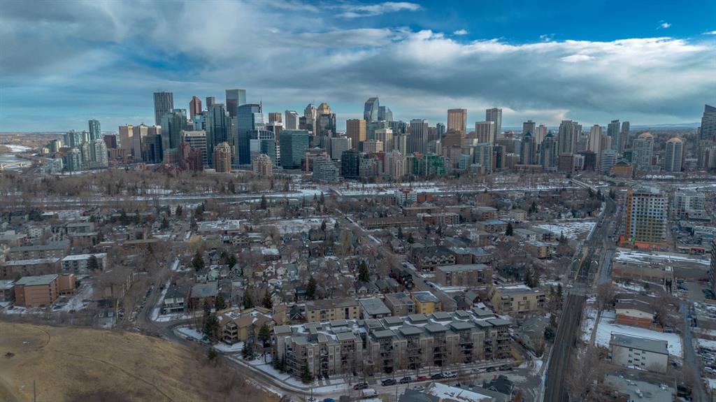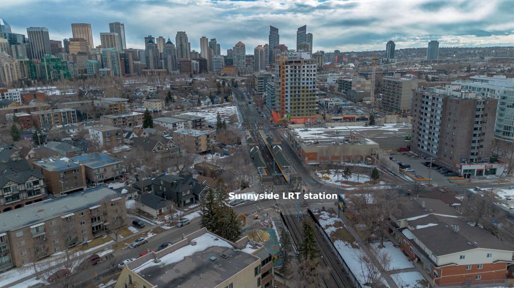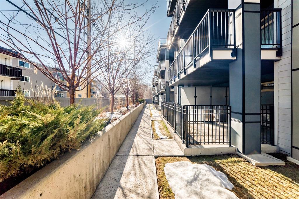 Welcome to the Ven in Kensignton a modern and well built residence in the heart of Sunnyside, featuring this stunning and impeccably maintained 1 bedroom plus den/bedroom condo in one of Calgary’s most vibrant, walkable, and desirable inner city neighbourhoods. Built in 2015 and proudly owned by the original owner, this spacious main floor unit blends modern style with everyday functionality, offering soaring 9’ ceilings, brand new laminate flooring, fresh paint, a bright open layout, and two full bathrooms. The sleek contemporary kitchen is a true showstopper, complete with a gas range, stainless steel appliances, quartz countertops, breakfast bar and rich cabinetry, perfect for entertaining or daily living. The generously sized primary bedroom features a tray ceiling, ceiling fan, a walk-through closet and a beautifully finished ensuite with marble counters and a large tiled shower. The second bathroom includes a tub/shower combination with matching marble counters. The versatile den works perfectly as a home office, guest room, or creative space. The inviting living room opens onto a spacious, extra private SE facing patio with a gas BBQ hook-up and direct access to a quiet residents only walkway, ideal for pet owners and outdoor enthusiasts. Additional highlights include in suite laundry, one titled underground parking stall, a separate storage locker, bike storage, a residents only underground wash bay, and a dedicated workbench room for tuning skis or snowboards. Located directly across from an off-leash dog park and playground, and just steps from the Sunnyside CTrain Station, a short walk downtown and the boutique shops, cafés, and restaurants of the lively Kensington district and the SAIT campus adjacent to the Jubilee Auditorium. This home offers the best of urban living in a serene, tucked away setting beside a peaceful hillside. You’ll love where you live! **some photos are virtually staged**