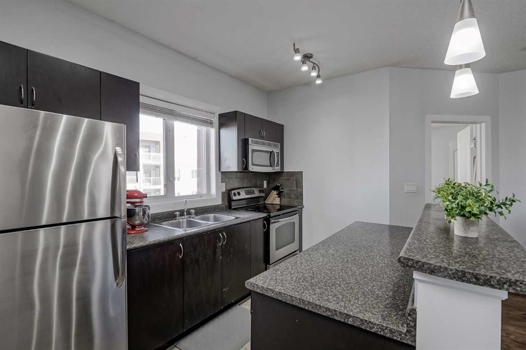 Open House Saturday Feb 21st 1pm-3pm. Welcome to this well-maintained, spacious corner unit condo with 9 foot ceilings offering over 900 sq. ft. of comfortable living space. Located in a highly desirable, family-friendly community, this home is perfect for small families, first-time buyers, or those looking to downsize without compromising on quality or space. Step inside to find an airy, open-concept layout centered around kitchen island, perfect for gathering with loved ones or cooking a family meal. The layout flows seamlessly onto an oversized balcony, ideal for morning coffee or evening unwinding. This unit boasts two generously sized bedrooms, including a primary suite with a large walk-in closet and a private ensuite bathroom. A second full bathroom adds extra convenience for guests or family. Additional highlights include 2 underground parking stalls (rare tandem parking), a Pet-friendly building and reasonable condo fees. You also have easy access to nearby Genesis Place, a premier community facility featuring a fitness center, pool, arenas, gymnasium, and more. Don't miss your chance to own this bright, spacious condo in a vibrant, amenity-rich community. Book your viewing today!