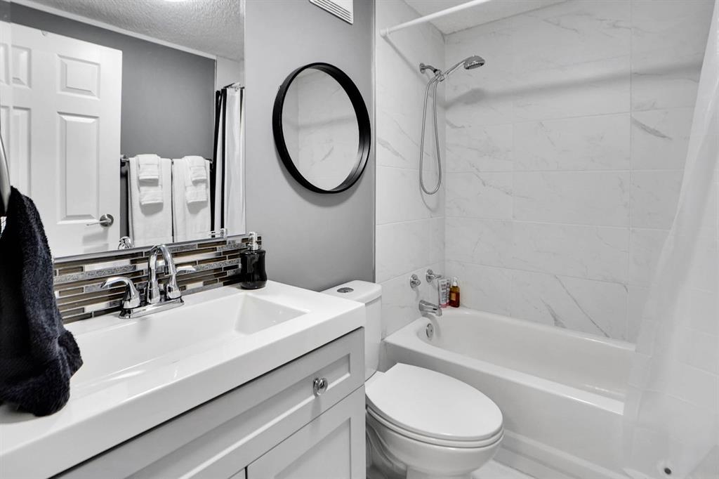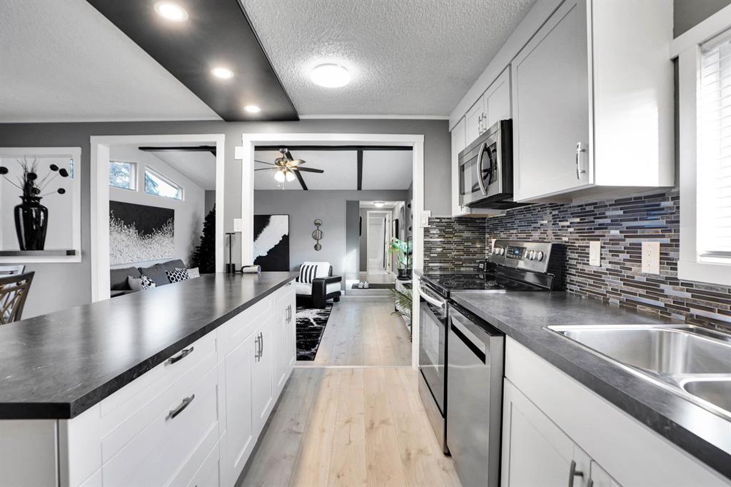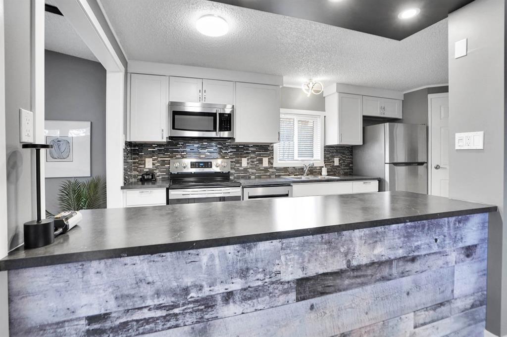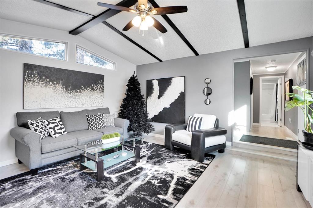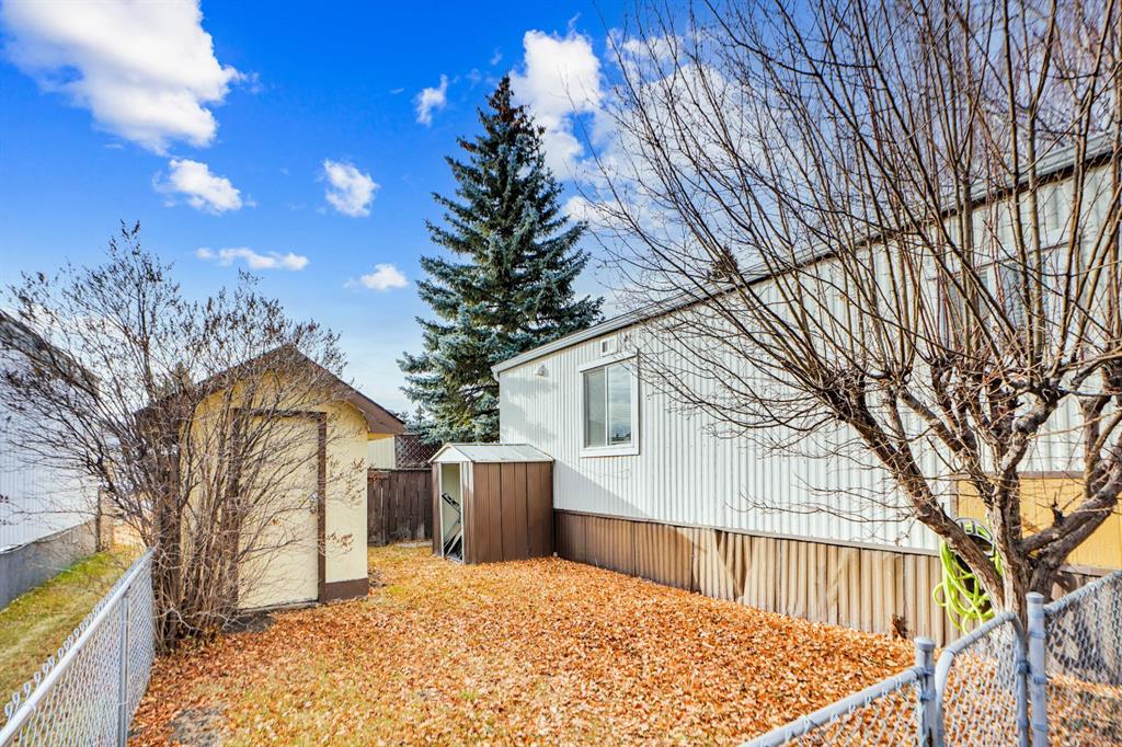 Welcome to Greenwood Village. Beautiful, completely renovated in 2021, 3 bed, 2 bath, 1160 sf mobile home in this NW amenities-rich community. This immaculately maintained home that shows like new is truly move-in ready. Laminate flooring throughout, white shaker-style kitchen cupboards, tiled backsplash, stainless steel appliances, coffee bar, and corner pantry, large kitchen island with pot lights, and a good size eating nook complete the kitchen area. Also in 2021 NEW WINDOWS, NEW FURNACE, All POLY B replaced with PEX, and newer roof. Electrical Panel – 2021 Baseboard and casing - 2021. 4 PCE ENSUITE has walk-in shower with tiled seat and awesome massage shower system. This great home has a huge sunken living room with black accent beams in the vaulted ceiling, and a step up to the kitchen and eating area. Separate laundry and furnace room can be found at the rear exit. The large master bedroom could easily fit a king bed, has a wall to wall closet with glass doors, and a black metal siding door that leads to the huge, fully tiled ensuite with a double sink vanity and walk in shower. Newer lighting, painted throughout in a modern palette, with a bright and airy feel. At the opposite end of the home are two additional bedrooms, the full bathroom, a nice entry with coat closet all makes this a great, functional floorplan. Add a carport, parking for two cars, a fenced backyard and a shed are all value-added items that round out this home to be terrific value! Located next to Greenwich Village, home of the famous Farmers Market West. This home is ideally located near Stoney Trail Ring Road for effortless citywide travel, and Highway 1 for a weekend getaway to Banff or Bragg Creek. Lease fee of $1375 monthly includes water, sewer, garbage pick up & snow removal. Calgary Transit and a school bus offers service through the park. Lease approval required, pets allowed.