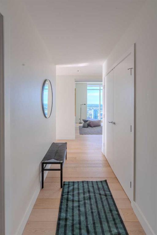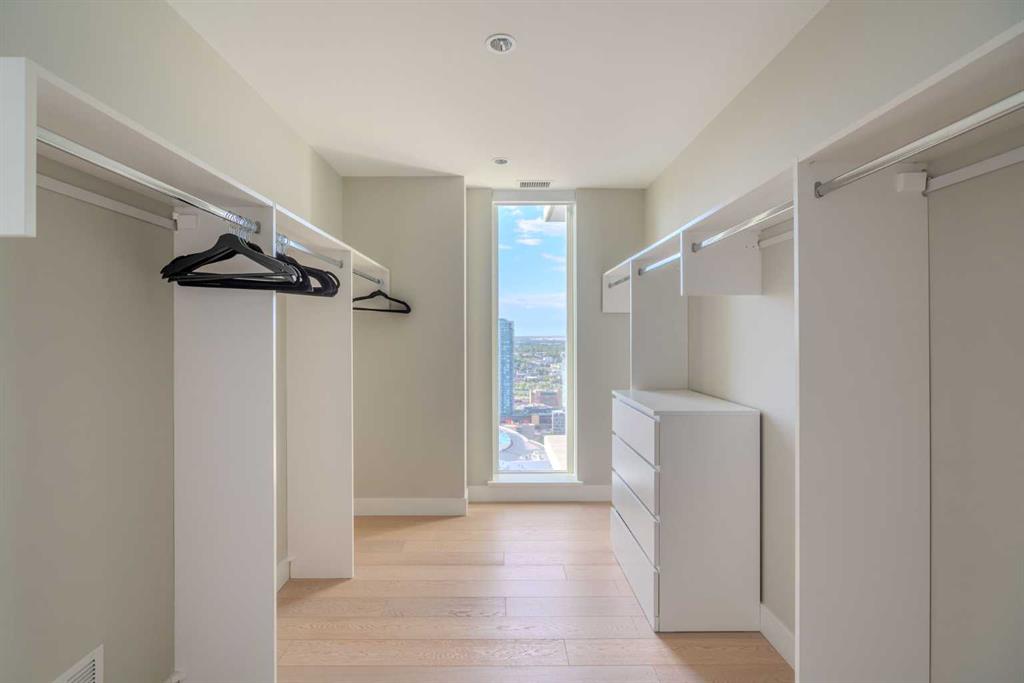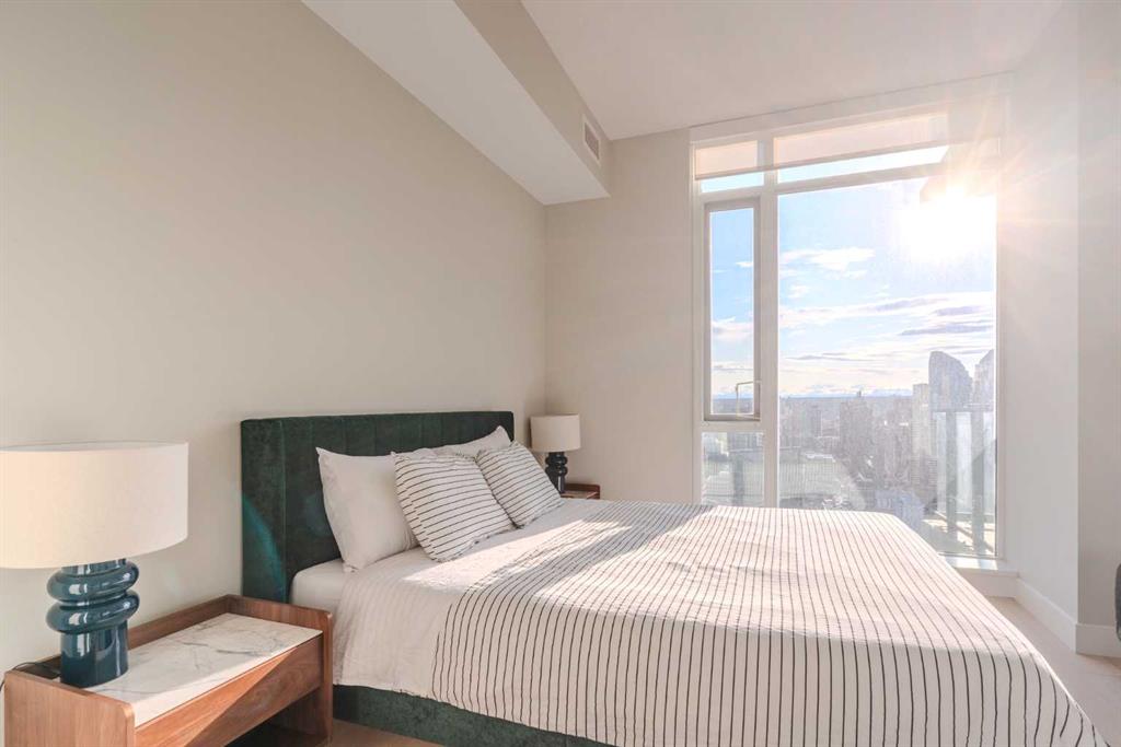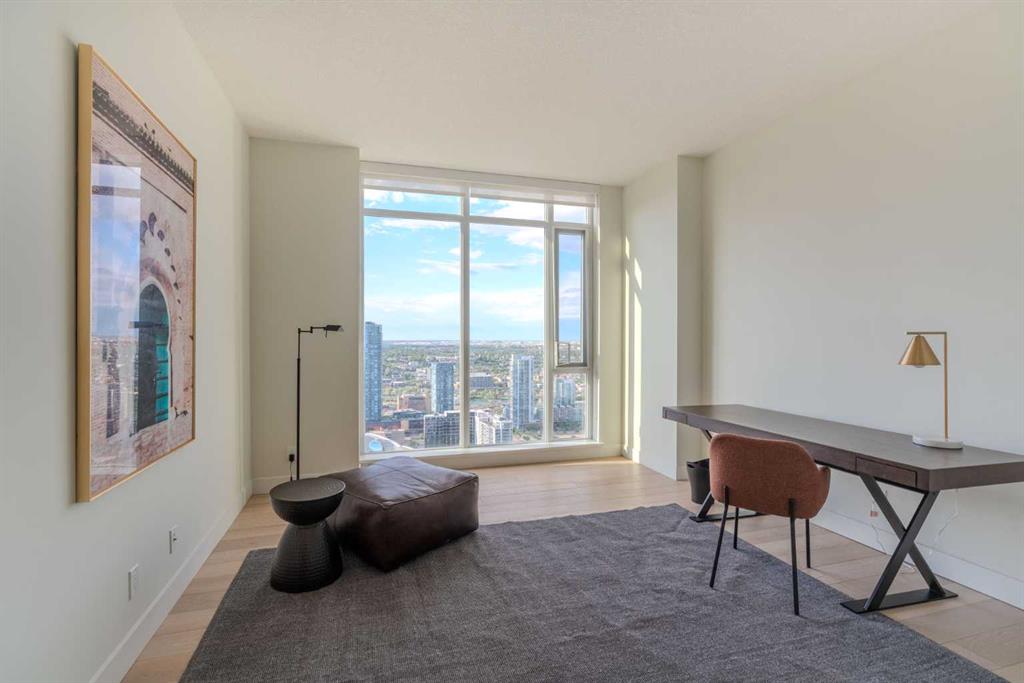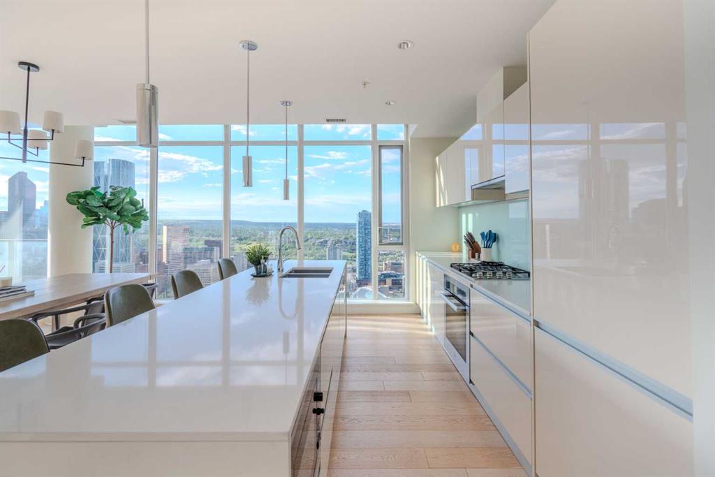 Welcome to The Guardian, Calgary’s prestigious and tallest residential tower. This remarkable, triple-mint condition 40th-floor residence offers an exclusive opportunity to experience luxury living high above the city. Featuring 1,739sq.ft., 2 bedrooms + den, 2.5 bathrooms, and soaring 9’6” ceilings, this sub-penthouse home showcases exceptional quality and design. Enjoy unobstructed, panoramic views of both the downtown skyline and the majestic Rocky Mountains through floor-to-ceiling windows that flood the home with natural light. The north-west exposure is completely un-obstructed corner to corner, ensuring privacy and an incredible backdrop to every room. A expansive wraparound balcony comes complete with natural gas connection. The sleek, modern kitchen is equipped with Miele appliances and premium Armony Cucine cabinetry from Italy, complete with a sophisticated silent-close system found throughout the kitchen and both ensuites. The versatile den offers the perfect space for a home office or additional living area. Each ensuite is beautifully appointed with travertine tile, a rain shower, hand-shower bar, and a soaker tub for ultimate relaxation. The Guardian’s premium amenities elevate your lifestyle: a state-of-the-art fitness centre and workshop on the 6th floor, plus an expansive social lounge on the 7th floor that opens to a large outdoor terrace. Additional titled underground parking stalls are also available for purchase. Convenience is unmatched with ZCREW Café on the main level and the nearby community space featuring sport courts, an off-leash dog park, and EV charging stations. You’re just steps from dining, entertainment, bike paths, the Stampede grounds, and the upcoming new event centre—placing you at the centre of it all. Be sure to explore the virtual tour to fully appreciate the craftsmanship and breathtaking views. Book your private showing today and experience the luxury and elegance of this remarkable unit.