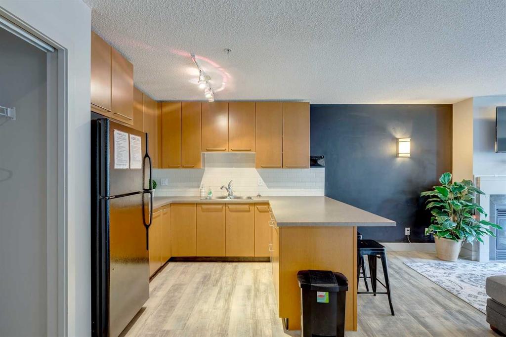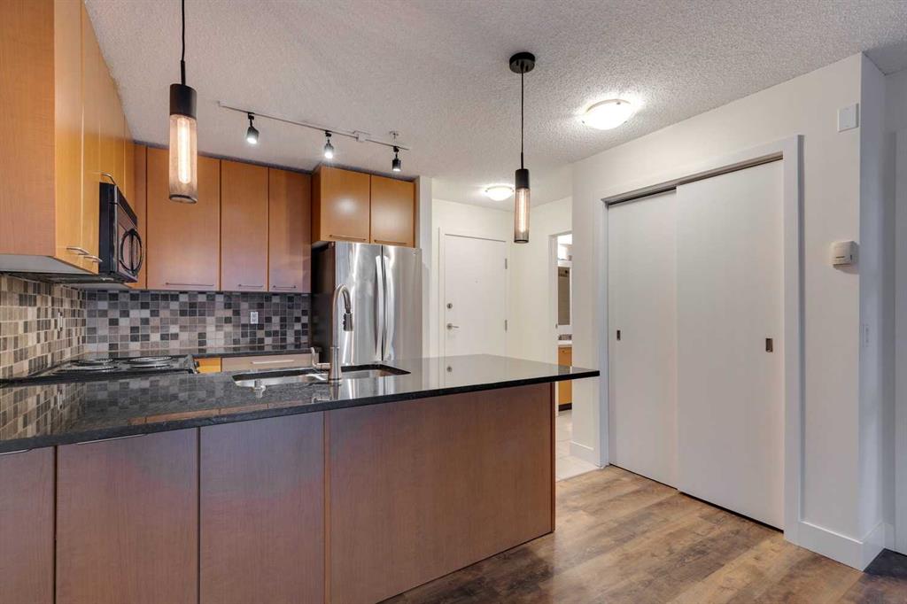 OPEN HOUSE Sat. Mar. 21 from 12-3pm!! This value-priced, updated 1-bedroom ground-floor suite offers walk-out convenience to quiet green space—ideal for unwinding after work or stepping out with your dog without dealing with stairs or elevators. The efficient, well-designed kitchen features full-size appliances, generous cabinetry, and durable black granite countertops—built for everyday use without fuss. New luxury vinyl plank flooring (installed 2023) adds a clean, modern look, while the gas fireplace provides a warm, low-maintenance focal point. French doors lead to a private primary retreat with views of your patio and surrounding green space. The layout is practical and smart, offering a 4-piece bathroom with cheater ensuite access, in-suite laundry, titled underground parking, and a separate storage locker—everything in its place. This unit also offers cool comfort in the summer with newly installed A/C. Located in The Morgan, the building delivers on amenities that matter: a fitness room, two guest suites for visitors, secure underground guest parking, and a large party room when you need more space. Outside, enjoy well-kept grounds with a gazebo, plus the convenience of grabbing a coffee or tea at Tim Hortons just a 2 minute walk. An excellent option for first-time buyers, downsizers, or students looking for comfort, function, and strong value in a well-run building.