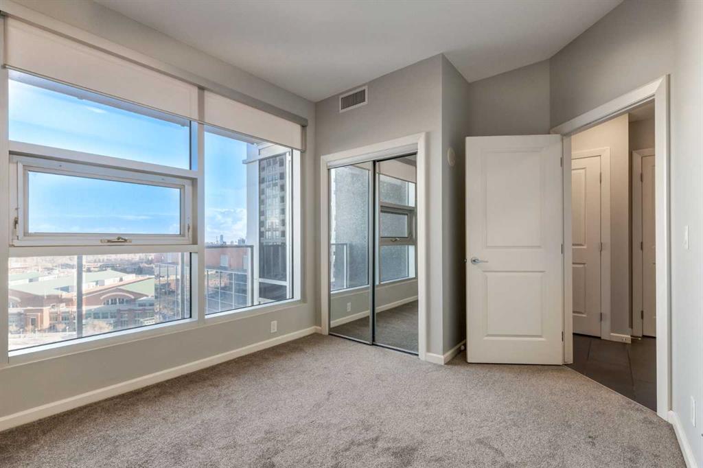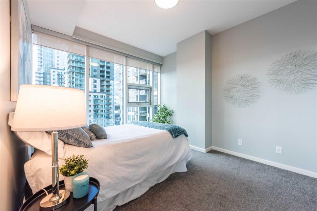Modern open 2 bedroom corner suite with huge floor to ceiling windows, new paint, new carpet and featuring the matching all stone countertop package throughout. Nuera offers you all the convenience your busy lifestyle demands. With on-site security/concierge, bike storage room, fitness facility with yoga studio & an owners lounge, let Nuera take you to new heights! This immaculate CORNER suite offers a split bedroom floor plan, perfect for a roommate or for when guests are over, tons of natural daylight, 2 bdrms & 2 full baths, gorgeous kitchen with dark mocha cabinets, stainless steel appliances and a huge centre island are perfect for entertaining. (can't wait for the Stampede fireworks next July!). The master bedroom has walk-through closets and a full ensuite bath and there's a second bedroom & 2nd full bath, insuite laundry and a HUGE 15 ft wide titled underground parking stall. Don't forget the central air conditioning, granite counters in both baths & the assigned storage locker. Nuera is an 18+ adult building and it has a terrific exercise facility and is located just a block to the LRT, close to downtown, entertainment venues, great restaurants, Sunterra Market, shops & boutiques - all yours to discover. Nuera Condos in Calgary's Beltline neighborhood has an exceptionally high walk score of 96/100, classifying it as a "Walker’s Paradise". It is also highly rated for biking (93/100) and transit (82/100). Call today for your viewing!