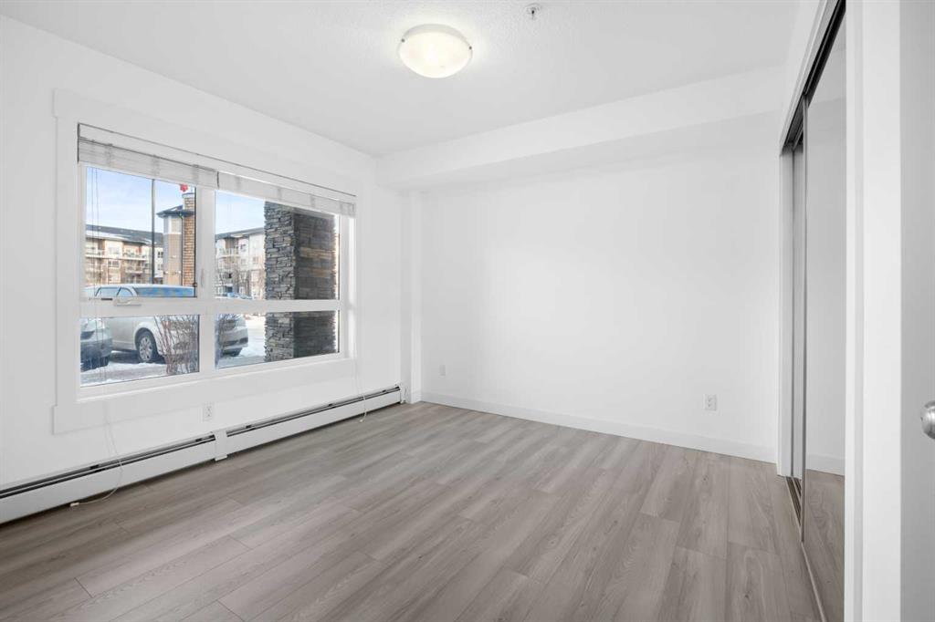 Welcome to this bright ground-floor apartment in the heart of Skyview Ranch, ideally located across from Public and Catholic schools. This well-designed 2-bedroom, 1-bathroom unit features an open-concept floor plan with approximately 630 sq. ft. of total area space, perfect for first-time buyers, downsizers, or investors. The kitchen offers granite countertops, stainless steel appliances, and a functional island that comfortably seats three bar stools, flowing seamlessly into the dining and living areas. The spacious living room opens through glass-panel patio door to an exposed concrete patio with a gas line, ideal for BBQ season. Both bedrooms are well-sized, with the primary bedroom offering generous space and dual closets. Enjoy the convenience of in-suite laundry with extra storage, along with titled surface parking. Situated in a well-managed complex with easy access to public transit, shopping, playgrounds, and close proximity to CrossIron Mills and major roadways. Book your private showing today—this one won’t last!