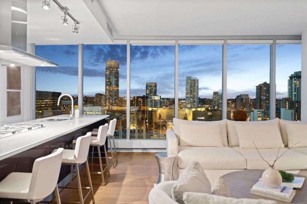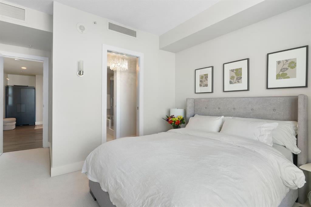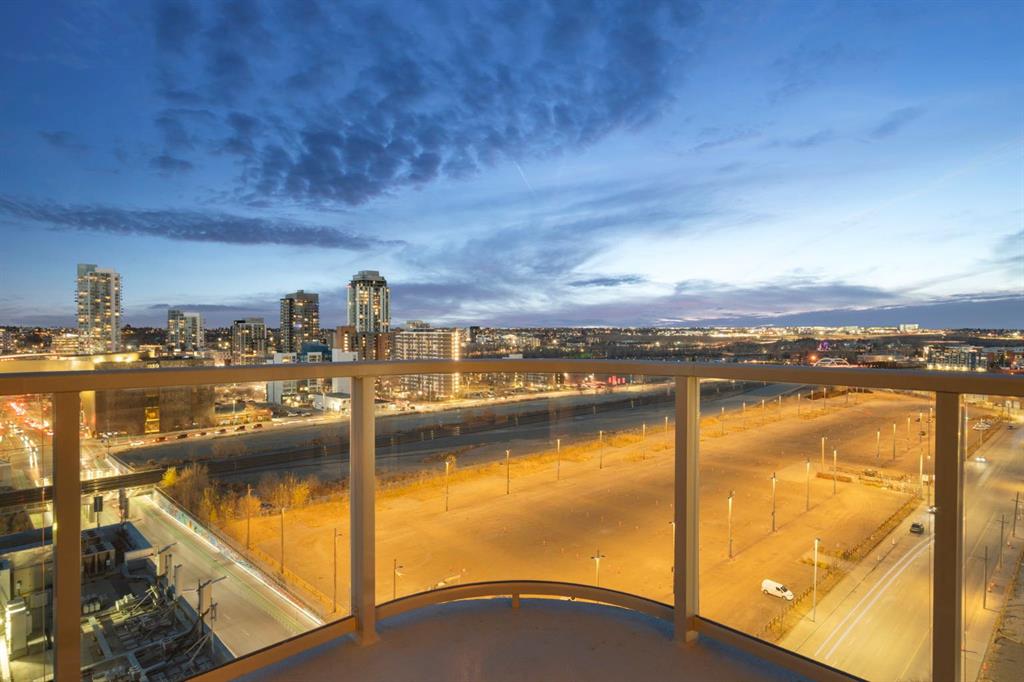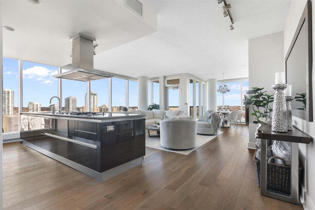 Experience elevated downtown living in this stunning 16th-floor residence at the iconic Arriva Tower. Spanning 1,367 sq. ft., this bright and airy corner unit offers 2 bedrooms, 2 bathrooms, and uninterrupted east facing views through floor to ceiling windows that capture the morning light and stretch across the city skyline and Bow River valley. The orientation provides an incredible sense of privacy and tranquility, paired with sweeping, ever changing vistas. The contemporary kitchen is a showpiece, featuring a full Miele appliance package, gas cooktop, sleek cabinetry, and an expansive island that anchors the open concept layout. Stunning engineered hardwood floors flow throughout the main living spaces, creating warmth and sophistication against the modern design. The spacious living and dining areas are perfect for entertaining or simply relaxing while taking in the panoramic views. The primary suite is a true retreat, complete with a walk-through closet and spa-inspired ensuite featuring a deep soaker tub and glass-enclosed shower. A generous second bedroom and full bathroom offer flexibility for guests or a home office. This home includes two titled underground parking stalls, an assigned storage locker, central air conditioning, and high speed elevators for quick, private access. Known for its luxury living and exceptional service, the Arriva Tower offers a full time concierge who also accepts parcel deliveries, a convenient bonus for residents. Additional building features include 24-hour security, two guest suites, an owner’s lounge and event room, and a beautifully maintained fourth floor courtyard terrace with BBQ area for outdoor relaxation. Located in the vibrant Beltline, steps from the Stampede Grounds, future Event Centre, C-Train access, and Calgary’s best restaurants and entertainment.