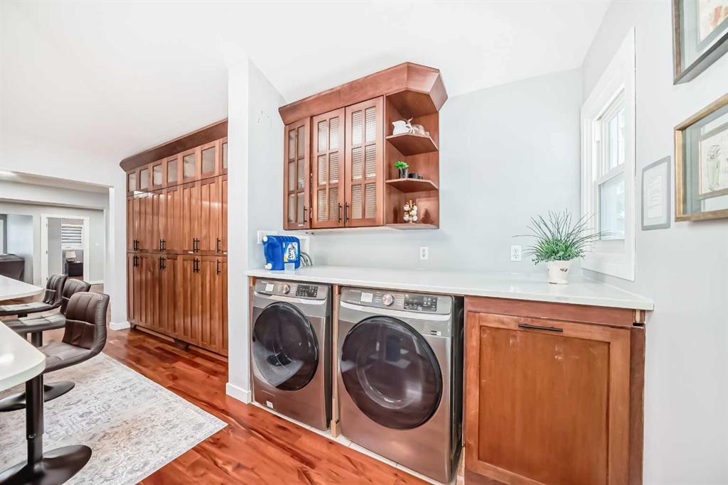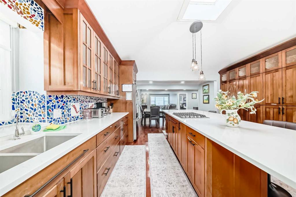 Welcome to this beautifully maintained bungalow situated on a desirable corner lot. The main floor offers a bright and functional layout featuring three spacious bedrooms and two full bathrooms, including a generously sized primary bedroom. The fully developed basement provides three additional bedrooms, two full bathrooms, and expansive living and recreation spaces—ideal for extended family or guests. The home showcases a renovated kitchen with custom cabinetry, quality finishes, ample counter space, and a large central island, seamlessly connecting to the dining and living areas. Large windows and a skylight fill the home with natural light, while hardwood flooring enhances the warm and inviting atmosphere throughout the main living spaces. Outside, enjoy a low-maintenance yard complete with maintenance-free fencing, a maintenance-free deck, and new landscaping, perfect for relaxing or entertaining. Additional highlights include two detached garages, providing excellent parking and storage options. A well-appointed property offering space, functionality, and pride of ownership in a sought-after location.