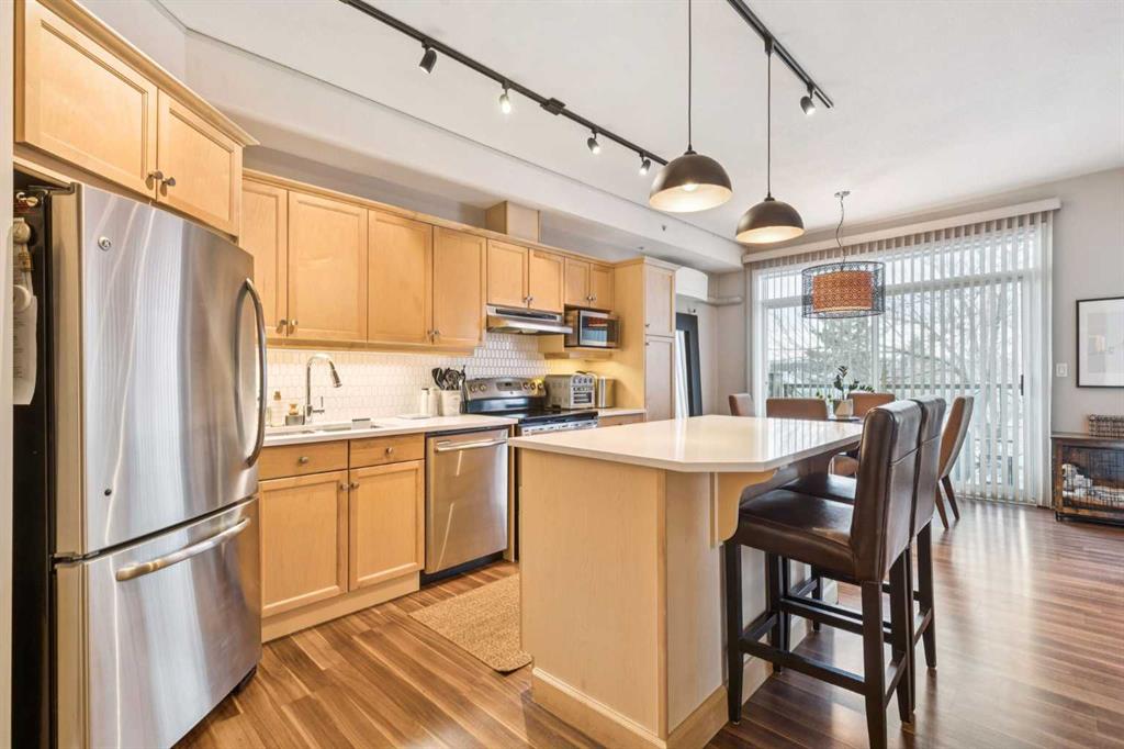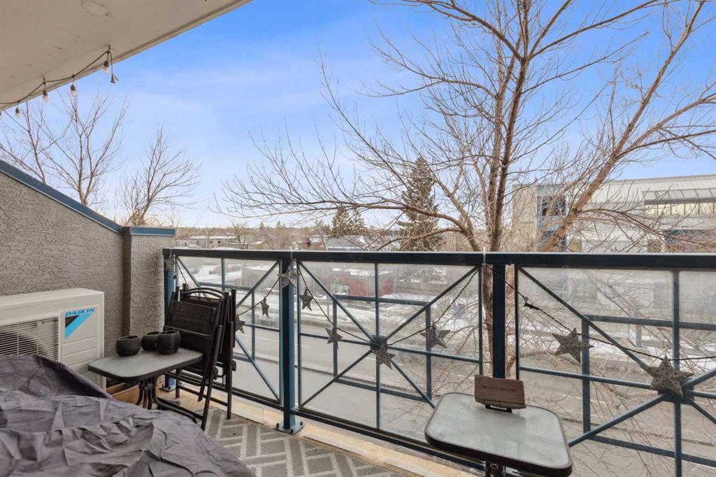 Welcome to Kensington living at its finest. Beautifully updated 2-bedroom, 1-bath condo located in the heart of Hillhurst, just minutes to downtown and steps from Kensington’s shops, cafés, transit, and river pathways. Professionally renovated in 2021, this home features an open-concept layout with quartzite countertops, Shaker-style maple cabinetry, stainless steel appliances, laminate flooring, ceramic tile, and a cozy gas fireplace. The kitchen is well designed with ample storage and functional counter space. Bright living and dining areas open onto a west-facing balcony with natural gas BBQ hookup, ideal for enjoying afternoon and evening sun. Additional highlights include central air conditioning installed in 2024, new bedroom carpet (2025), in-suite laundry, and underground heated titled parking with visitor parking. Residents enjoy an array of building amenities including elevator access, fitness center, party room, secured parking, storage, and visitor parking. Well-managed building in one of Calgary’s most walkable inner-city communities. A move-in-ready home offering excellent value and lifestyle. A must see to be truly appreciated!