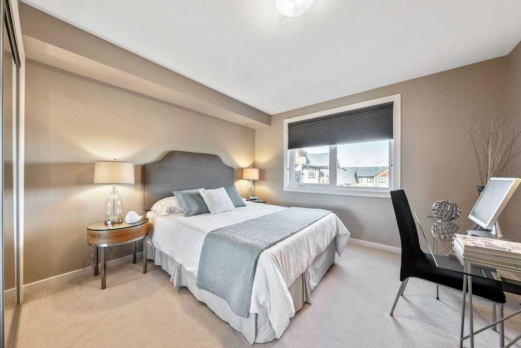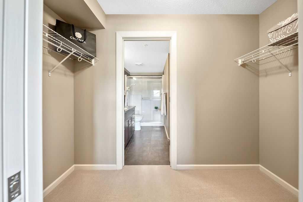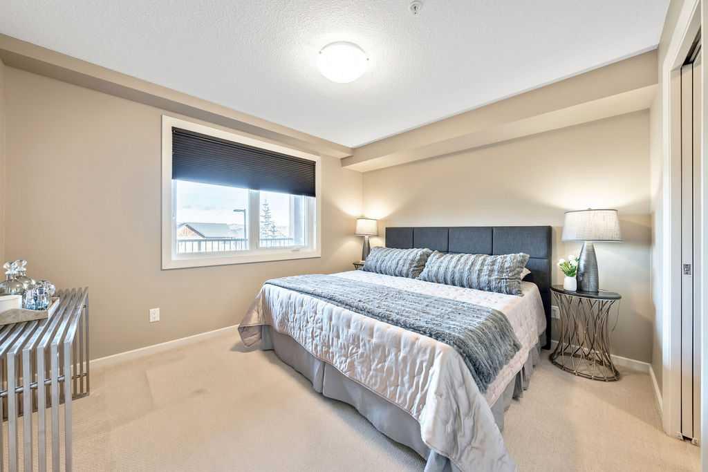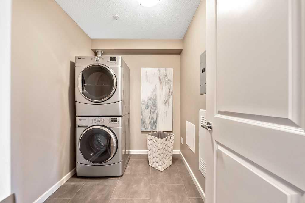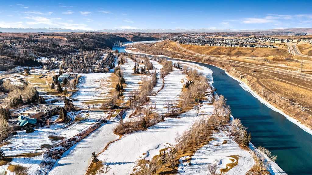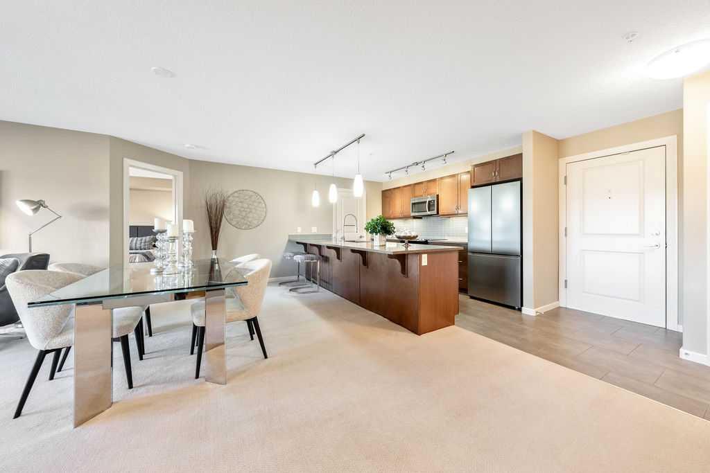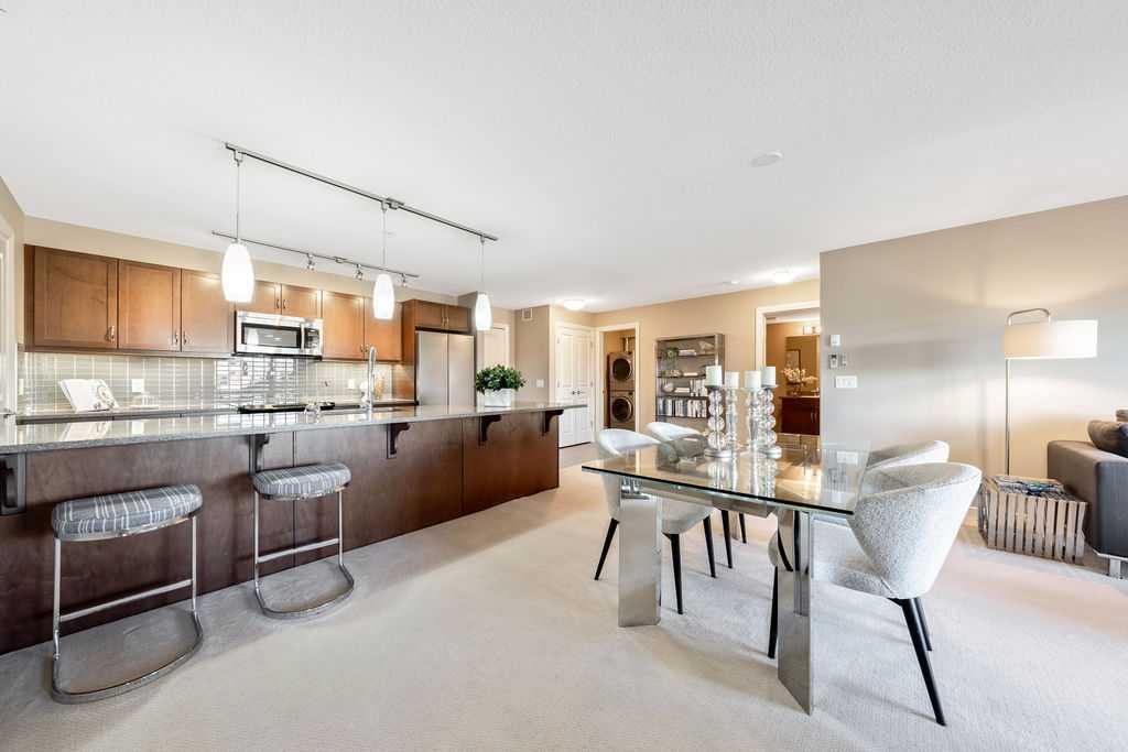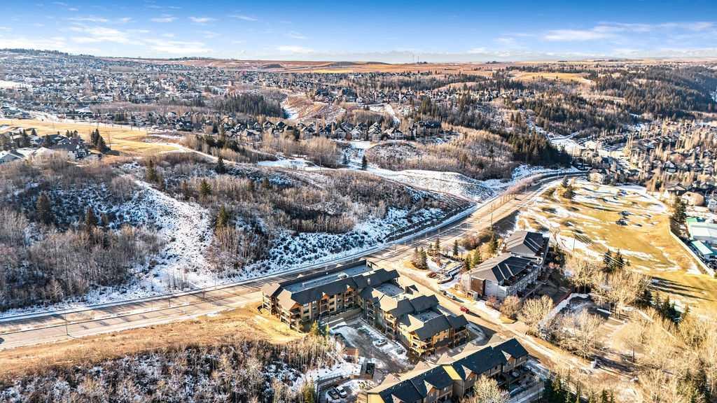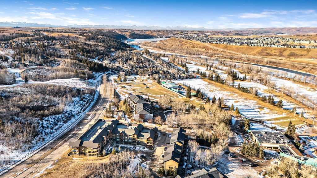 This beautifully maintained third-floor residence offers a rare blend of serenity, space, and thoughtful design within an intimate, adult-oriented (18+) building known for its strong governance and exceptional reserve fund. Inside, natural light pours through expansive windows, illuminating a well-considered floor plan that balances openness with privacy. The kitchen is both elegant and functional, anchored by stone countertops, stainless steel appliances (including a brand-new refrigerator), an oversized breakfast bar, under-cabinet lighting, a reverse-osmosis water system, and a generously sized pantry. It flows seamlessly into a dining area designed to comfortably host gatherings both casual and refined. The living room is spacious and inviting, and gives direct access to the balcony, an outdoor extension large enough for a BBQ and lounge seating, where peaceful nature views and visiting wildlife become part of daily life. The primary suite offers a calm and restorative escape, complete with a walk-through double-sided closet and a private ensuite with additional linen storage. A well-proportioned second bedroom and a substantial four-piece main bath, also featuring extra storage, provide flexibility for guests, hobbies, or a home office. Completing the interior is a massive in-unit laundry room, a rare and highly practical feature. Comfort is elevated year-round with air conditioning, while convenience is enhanced by two titled parking stalls (one underground, one surface) and a titled storage locker located on the same floor as the unit. Beyond the home, residents enjoy a beautifully appointed lobby and vibrant community amenities including a gazebo with outdoor gathering area - often the backdrop for weekly happy hours and social gatherings. Moments from the river pathways, Valley Ridge Golf Course, COP, and with effortless access to Stoney Trail and the mountains, this is a lifestyle defined by ease, connection, and quiet sophistication. Private, peaceful, and impeccably cared for, this is Valley Ridge living at its finest.