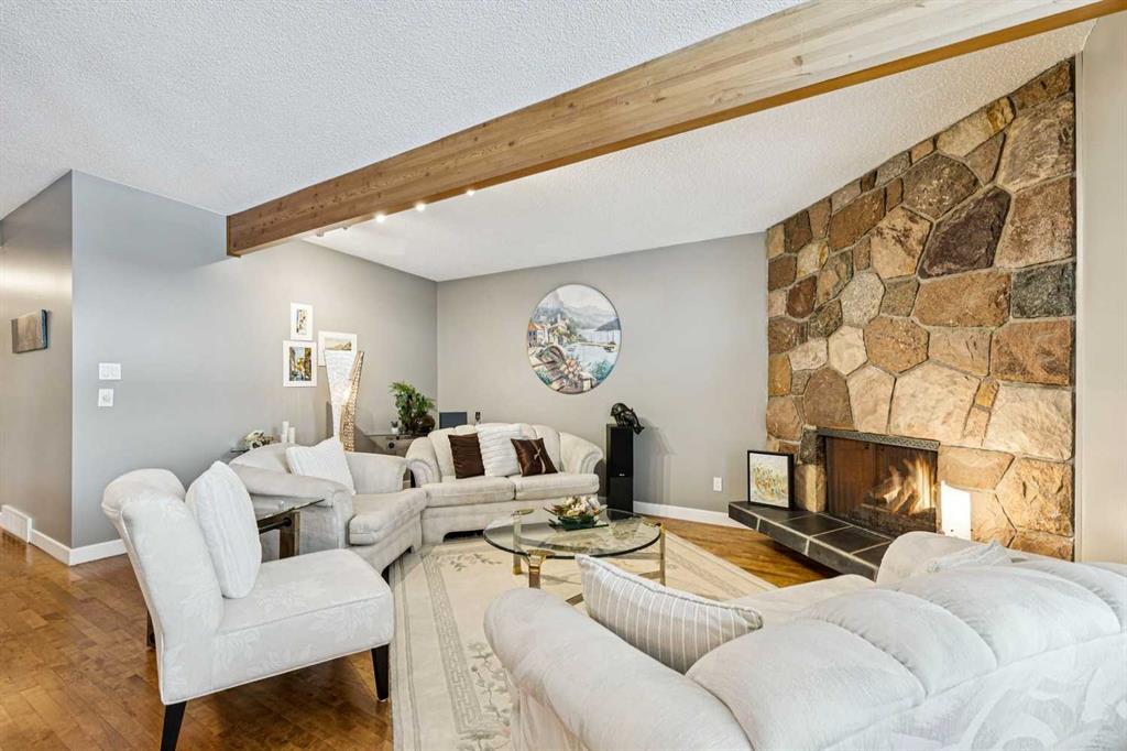 Perfectly positioned on a quiet cul-de-sac in Varsity Village, this exceptional raised bungalow offers a rare blend of privacy, openness, and connectivity. The home faces a large open green space and soccer fields adjacent to École Terre des Jeunes, creating an expansive and unobstructed outlook, while the school grounds begin several yards to the west. The rear of the property backs onto the neighbourhood pathway system—ideal for walking, cycling, and easy access to surrounding green spaces. Extensively renovated, the home features a stunning custom kitchen designed for both daily living and entertaining. Solid wood cabinetry, granite countertops, and premium appliances include a Fisher & Paykel gas cooktop, Bosch double ovens, Miele dishwasher, oversized KitchenAid refrigerator, and a full-size bar fridge. Natural gas hookups to both decks further enhance outdoor entertaining. Two expansive decks extend the living space outdoors. The front deck offers vinyl flooring with glass railing and open views across the green space, while the walk-out rear cedar deck provides privacy, a wind screen, and views of the landscaped yard and pathway beyond. Mature trees and shrubs contribute to the home’s established character. Inside, large windows and exposed wood beams create a bright, welcoming atmosphere and highlight the home’s architectural character. Hardwood flooring on the main level, updated lighting with dimmer controls, generous closets, and multiple living spaces support both comfort and functionality. Two natural gas fireplaces add warmth, while built-in speakers, custom cabinetry, and office desks enhance everyday living. The primary suite features a walk-in closet, blackout blinds, a soaker tub, separate shower, and heated floors. Additional highlights include air conditioning, water softener, humidifier, two forced-air furnaces, a heated oversized double garage with ample storage, and a large storage area beneath the rear deck. Located in Varsity Village, residents enjoy generous lot sizes, excellent schools at all levels, proximity to the University of Calgary, Market Mall, University District amenities—without the density—and convenient west-side access to downtown and the mountains. Welcome home!