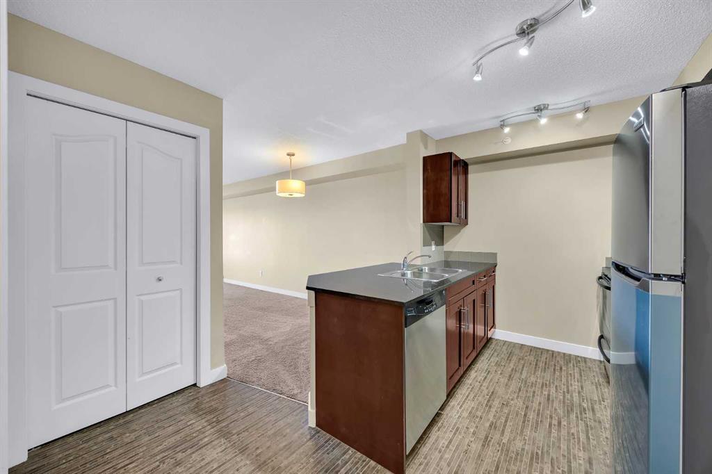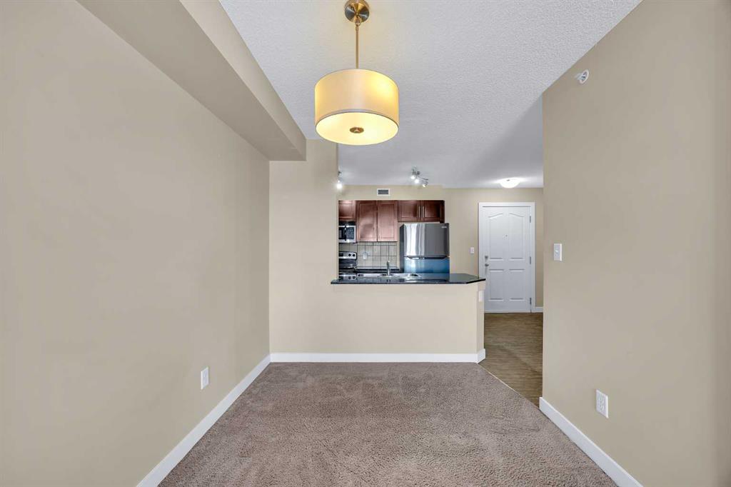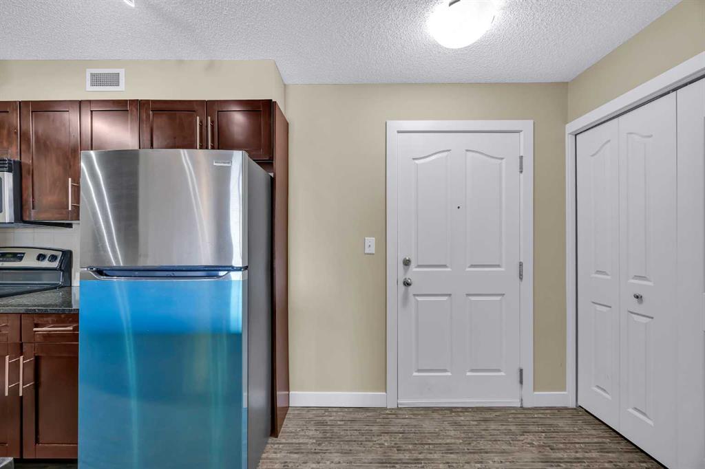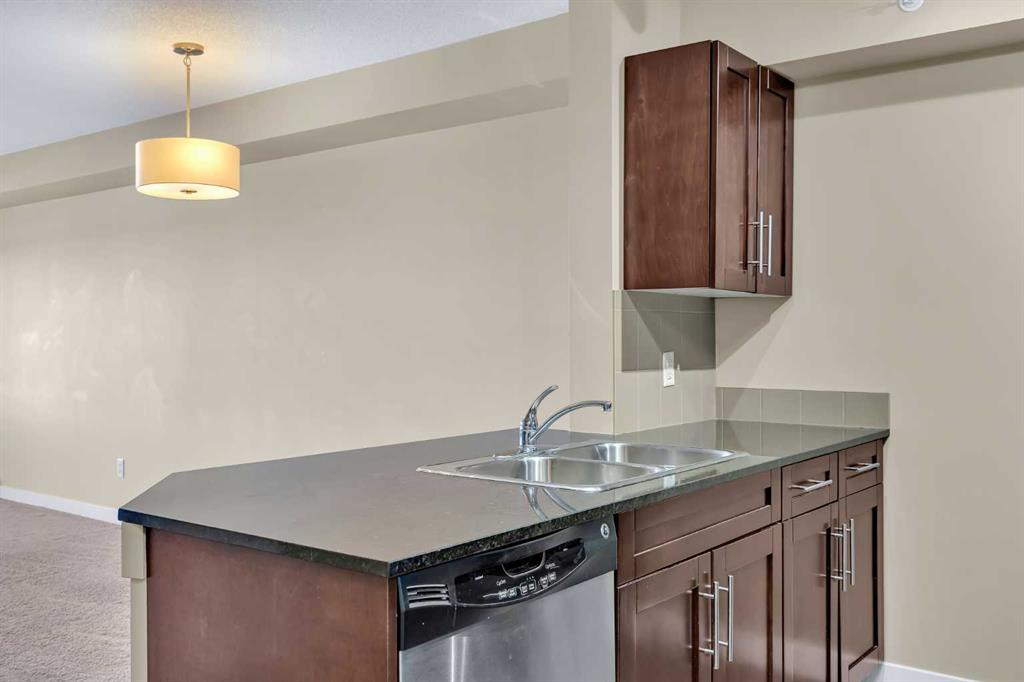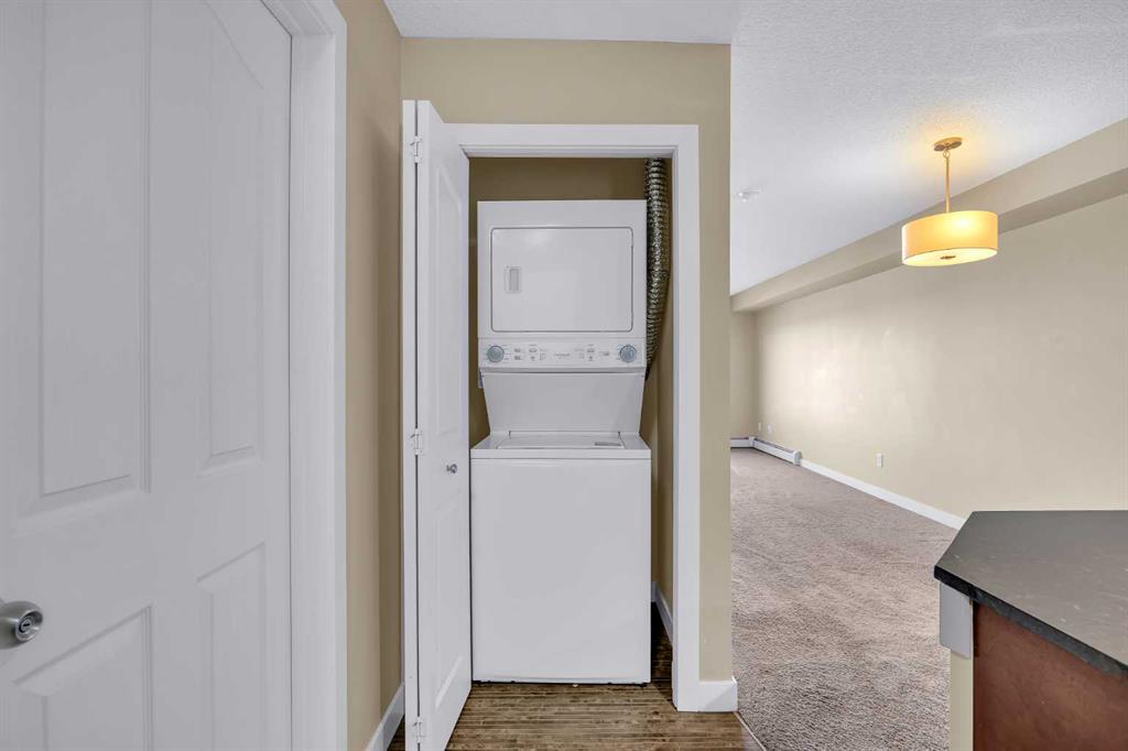 This bright top 4th-floor condo offers 507 sq. ft. of functional living space, conveniently located close to the elevator. The unit features a carpeted bedroom (8’11” × 11’4”) that fits a double size bed with side tables, a spacious living room, and a four-piece bathroom with a granite countertop sink. The kitchen boasts a granite breakfast countertop, double sink, stove, microwave, dishwasher, and a brand new fridge,. Additional highlights include a brand new in-suite washer and dryer and one titled underground parking stall (#463). Residents enjoy excellent convenience with a bus stop right outside, Tim Horton's, a gas station, and a strip mall including groceries just across the street. Genesis Centre, YMCA, and Saddletowne LRT are all within walking distance. Easy access to the airport, Stoney Trail, CrossIron Mills Mall, and Balzac make this location ideal for commuting and shopping.
