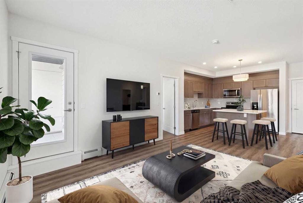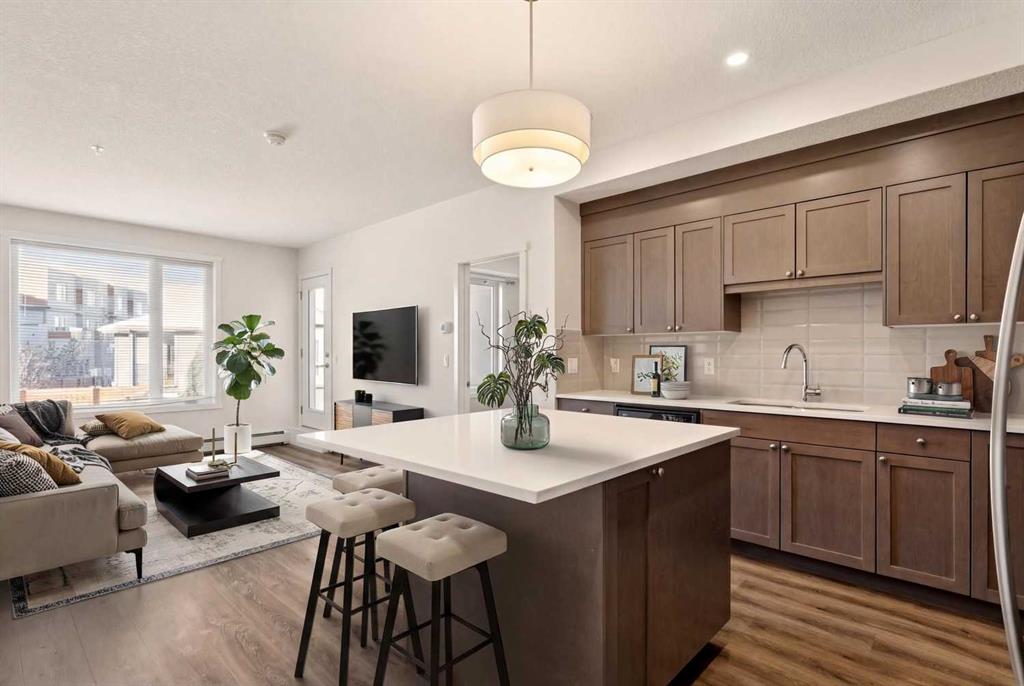 Exceptional new price and a rare opportunity for easy main-level entry, and lock-and-leave living in Fish Creek Exchange. Welcome to this beautifully maintained 2-bedroom, 2-bathroom condo, ideally located in the heart of Shawnee Slopes. With nearly 800 sq. ft. of thoughtfully designed living space, this move-in-ready home blends modern comfort with one of Calgary’s most desirable natural settings. Step outside and you’re just moments from Fish Creek Park, offering endless trails, green space, and year-round recreation. Commuting is equally effortless with the Fish Creek–Lacombe LRT Station within walking distance, providing quick access downtown and beyond. Inside, the open-concept layout creates a warm and welcoming flow between the kitchen, dining, and living areas—perfect for everyday living or entertaining. The modern kitchen is fully upgraded with stainless steel appliances, quartz countertops, soft-close cabinetry, an undermount sink, and a generous island that anchors the space. The primary bedroom offers a walk-through closet and a private 3-piece ensuite, while the second bedroom and full bathroom provide flexibility for guests, a home office, or roommates. This well-managed, pet-friendly complex (cats and dogs welcome) also features titled underground parking, titled storage, in-suite full size laundry, and two indoor bike storage lockers, ideal for an active lifestyle. Unit #208 is conveniently located on the same level as the entrance and elevator, with easy access via ramp or stairs. Surrounded by the amenities of Shawnee Slopes, close to schools, shopping, transit, and nature, this home is perfectly suited for first-time buyers, downsizers, or investors seeking a low-maintenance property in a high-demand location. An exceptional opportunity to live where city convenience meets natural beauty - don’t miss it.