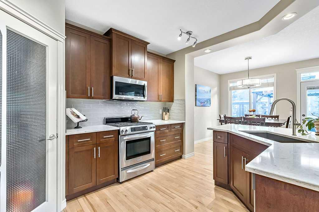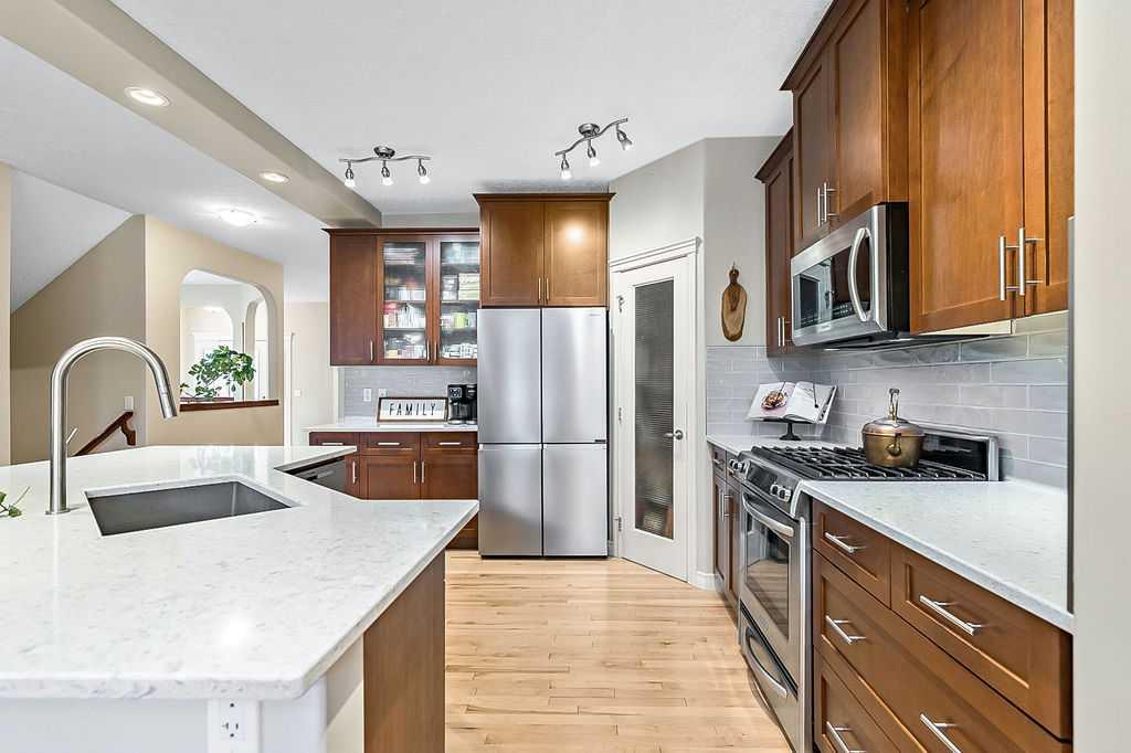 ~LAKE ACCESS ~ STEPS TO GOLF COURSE~ TRIPLE HEATED GARAGE ~ 6 BEDOOMS ~ 4 BATHS ~ ALMOST 4000 SQ FT OF LIVING SPACE~ Check out this absolutely stunning home nestled on one of the quietest roads in Crystal Green. Backing onto the prestigious Air-Ranch homes gives this street that extra feel of luxury and privacy. This home provides the space you need for large families to function together. Step inside the large entranceway and notice the beautifully maintained hardwood floors. The front office/den can be easily converted to a formal dining space or the flex space you need. Step through to the open concept living space with a charming 3 way gas fireplace, a stunning kitchen, huge dining, and cozy living room. This open floorplan is where all the memories will be made. Large windows invite your eye to enjoy the outside greenery. Enjoy cooking meals in this chefs kitchen with recent updates of new quartz counters and backsplash. Plenty of cupboards, workspace, stainless steel appliances, gas stove, corner pantry , and massive sit up island are just a few of the features this kitchen offers. Enjoy watching the kids and pets play in the yard from the kitchen. The upper level has new plush carpets and offer a second living space for your family. The huge bonus room is loaded with natural light and provides a good separation between the primary bedroom and the kids/guest rooms. You will love this massive primary suite!! The walk-in closet is large enough to host all your clothes plus dressers if needed. The ensuite gives a space to relax after a long day at work. 3 more large sized rooms plus another 5 piece bathroom complete this bright and sunny upper level. The fully finished lower level provides a 3rd living space plus 2 more large bedrooms and another full bathroom. If you love outdoor space, this home is for you!! The tranquil oasis of a back yard truly comes to life every summer providing privacy, and pure bliss. Relax on the large deck space and listen to the leaves on the mature trees blowing in the breeze. There are so many spaces on this property to obtain the lifestyle you desire. Enjoy long walks on the extensive path system Okotoks has to offer. Close to parks and playgrounds , in a convenient north end location that is perfect for city commuters. The oversized triple heated garage has epoxy floors, a man door to outside, a workbench area(or extra toy parking) and plenty of space for storage. Air conditioned on all levels of the home! There is truly something for every member of the family to find pleasure in this remarkable home. Upgrades over the last few years include new concrete pathway to back yard, hardwood floors redone, new counter tops and backsplash in kitchen, new carpets, paint, new back door and back windows, epoxy floors in garage... and more. Enjoy 4 season entertainment at Crystal Shores lake, offering beaches, swimming, fishing(summer and winter) and skating. This is a true family home ready for its next family to enjoy.