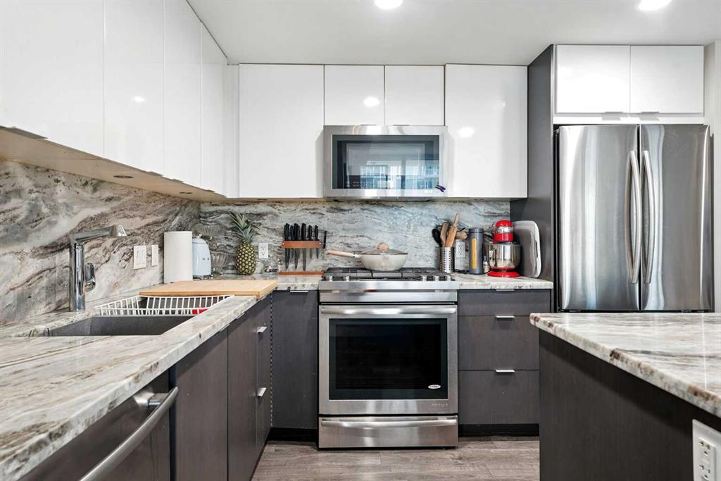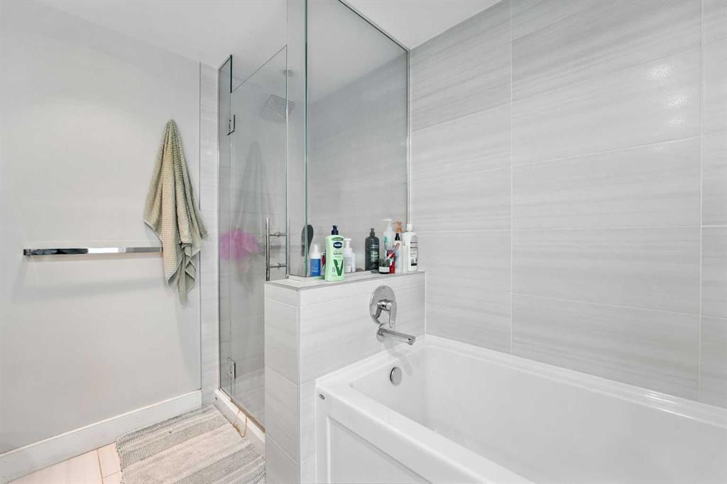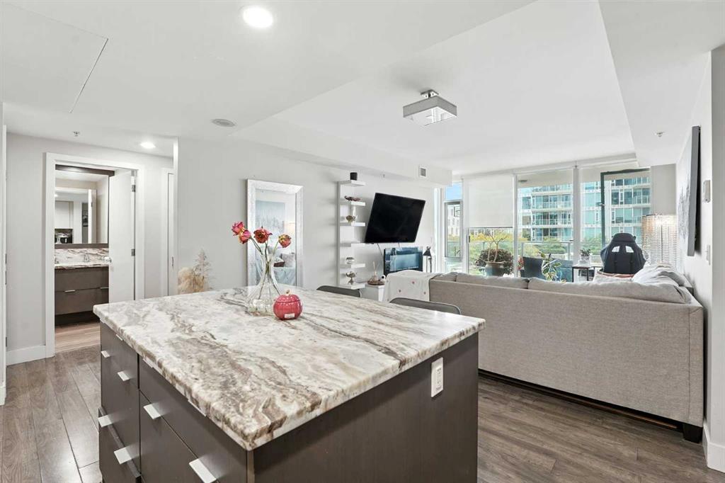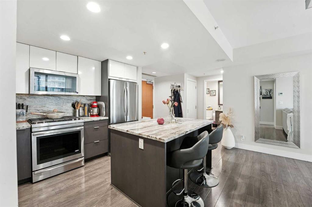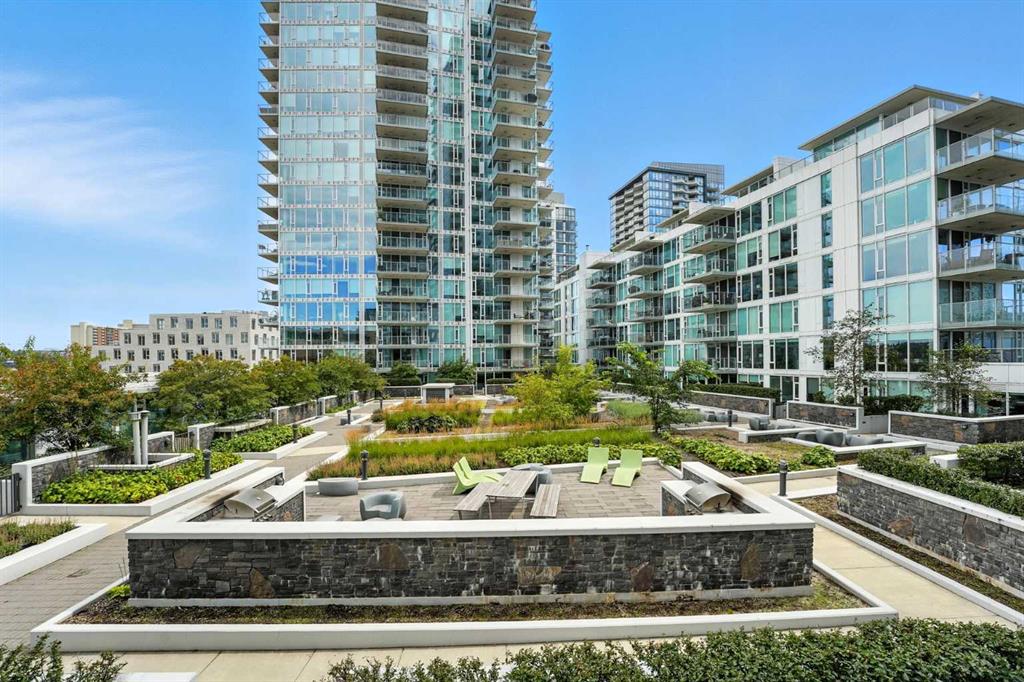 Welcome to your urban sanctuary in the vibrant heart of East Village! This modern 2-bedroom, 2-bathroom suite the Evolution building is a perfect fit for both first-time buyers seeking a dynamic lifestyle and savvy investors eyeing a prime downtown asset. This is a space where style meets function. The bright, open-concept layout is framed by floor-to-ceiling windows that fill the home with natural light. The contemporary kitchen features a gas range, granite countertops, and stainless steel appliances—perfect for a quick meal or a gourmet dinner. Both bathrooms offer the luxury of heated floors, while the primary ensuite boasts dual sinks and a separate tub and shower. Central A/C, in-suite laundry, and secure underground parking and storage add to the low-maintenance appeal. Beyond your door, a world of premium amenities awaits. Residents enjoy a 24/7 concierge, a fitness facility with sauna and steam rooms, a social lounge, and a rooftop patio with BBQs—all designed for a life of convenience and relaxation. With a Walk Score of 94, East Village is your playground. Stroll to the Bow River pathways, the Central Library, Studio Bell, and an array of shops, cafes, and restaurants. The C-Train and Superstore are just a few steps away, making daily errands a breeze. This is more than a condo—it's a smart investment in a thriving, walkable community. Don't miss this opportunity to own a piece of Calgary's most exciting neighbourhood!