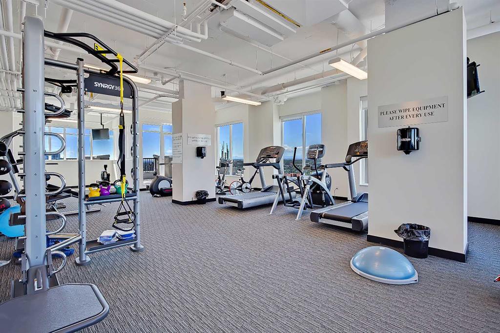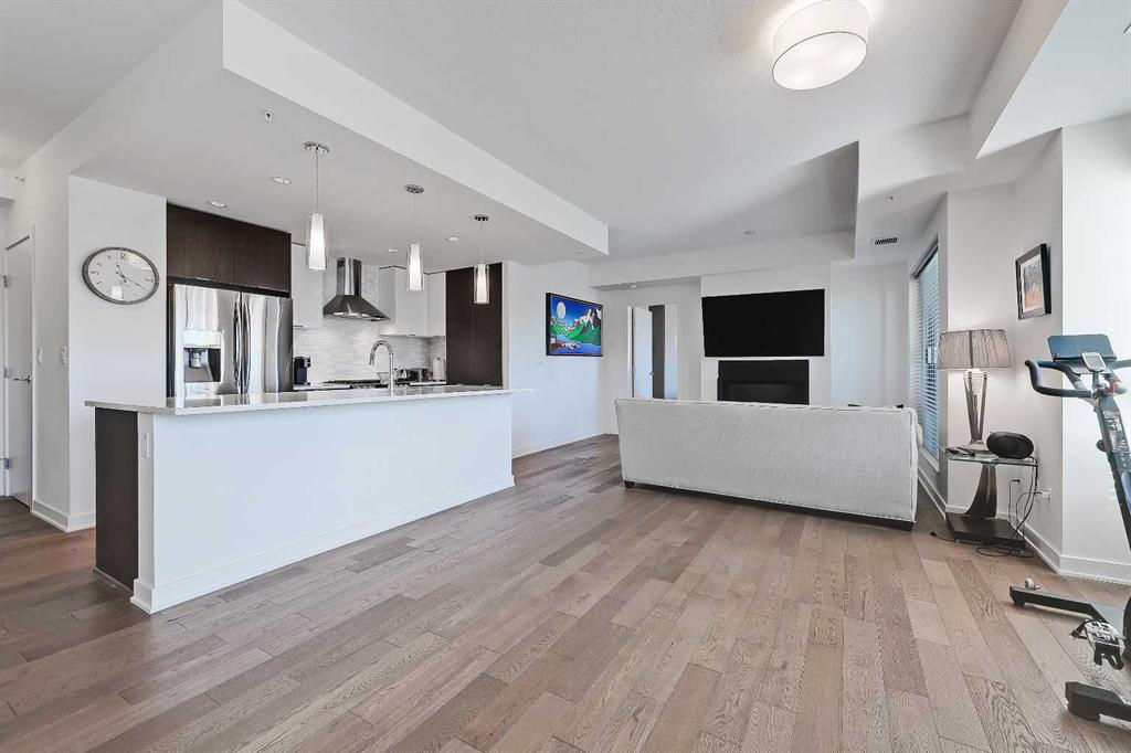 *VISIT MULTIMEDIA LINK FOR FULL DETAILS & FLOORPLANS!* Welcome to SUB-PENTHOUSE LIVING at Vogue! This 2-bed + den, 2-bath condo w/ over 1,200 sq ft on the 34th-floor w/ amazing city skyline band river views boasts two balconies opening off the main living areas. Naturally bright living w/ soaring ceilings, modern light and ceiling details, an open concept floorplan, & engineered hardwood flooring throughout (no carpet!), you are going to love the urban life at Vogue. Gather around the massive island w/ breakfast bar seating & dual undermount sink in the modern, sleek kitchen. Stainless steel appliances include a fridge w/ French doors, a deli drawer, & a freezer drawer, a gas stove & hood fan, a dishwasher, & built-in microwave. White quartz counters & marbled tile backsplash complement the wood & white cabinetry & modern pendant lighting. The open-concept living, dining, and den area has large windows, a gas fireplace, & access to TWO balconies via sliding glass doors. 2 bedrooms flank the main living space for ultimate privacy. The primary bedroom features a walk-in closet w/ custom built-in storage, and a private 5-pc ensuite. Featuring white quartz counters, modern faucets, dual undermount sinks, wood grain cabinetry, a standup shower, & soaker tub w/ full height tile, you’ll find everything you want & more in a primary suite. The secondary bedroom on the opposite side of the unit features a large window, a walk-in closet w/ custom built-in storage, & quick access to the main 4-pc bathroom w/ white a quartz counter, undermount sink, modern faucet, wood grain cabinets & a tub/shower combo w/ full-height tile. Rare for condo living, this unit has a laundry room w/ a washer & dryer, & heated, underground parking w/ a storage locker. VOGUE is a high-end building w/ lots of amenities, including an elegant lobby, full-time concierge, gym, billiards, large party room w/ kitchen & multiple rooftop terraces. Surrounded by parks, transit, the LRT, shopping & more, & within walking distance to the downtown core & all Kensington shops & services – this location truly cannot be beaten.