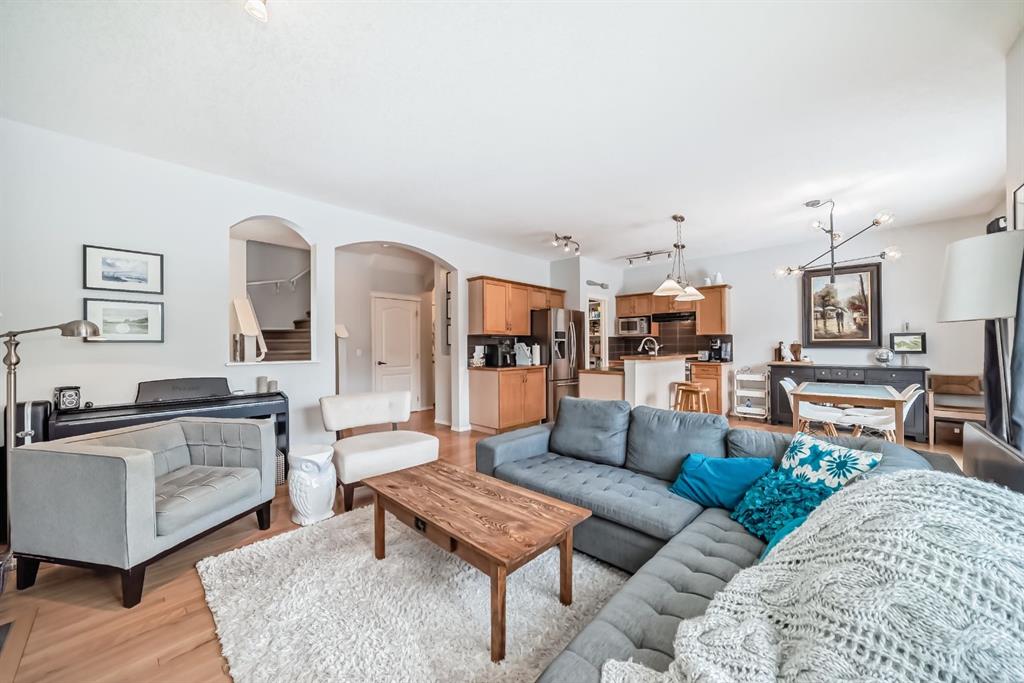 Welcome to this beautifully maintained and thoughtfully updated two storey home offering 1771. sq. ft. of refined above grade living space, ideally located on Copperfield Blvd directly across from St. Isabella School, playgrounds, and expansive green space. From the moment you step inside, the home impresses with its bright open-concept layout, 9’ knockdown ceilings, and rich hardwood flooring that flows throughout the main level. Designed for both everyday living and effortless entertaining, the main floor centers around a warm and inviting living room with gas fireplace and custom mantle, creating the perfect gathering space for family and friends. The well appointed kitchen offers both style and functionality with a central island, walk-in pantry with custom organizational shelving, full appliance package, and generous dining area that opens seamlessly to the backyard creating an ideal setting for indoor outdoor living. Outdoor Living Step outside to your private backyard retreat, featuring a full width two tier deck perfect for summer entertaining, along with a lower patio firepit area, an inviting space to relax and enjoy Calgary evenings. The yard is fully fenced and landscaped, offering privacy and room for family activities. Upper Level Comfort The upper level has been designed with both space and privacy in mind. A large front bonus room provides a comfortable secondary living area with beautiful views of the park and playground across the street. The primary suite is tucked quietly at the rear of the home and features a walk in closet and a well appointed ensuite with deep soaker tub and separate shower, creating a relaxing retreat at the end of the day. Two additional generous bedrooms, a full bathroom, and the convenience of upper-floor laundry complete the level perfect for busy family life. Fully Developed Basement The professionally developed basement expands the home’s living space with a stylish recreation area featuring a modern electric fireplace feature wall, a unique barn door accent, and a beautiful spa-inspired bathroom ideal for guests, movie nights, or a quiet escape. Additional Highlights • Oversized double attached garage with plenty of storage • Elegant lighting and upgraded finishes throughout • Family friendly location close to parks, pathways, schools, and amenities • Move in ready condition with thoughtful upgrades throughout Combining comfort, style, and an unbeatable location, this Copperfield home offers the perfect balance of modern design and everyday functionality.