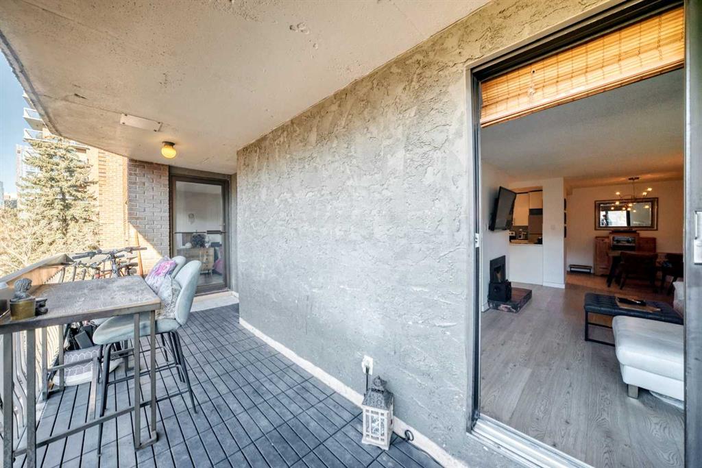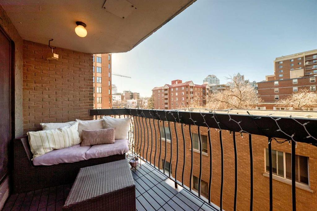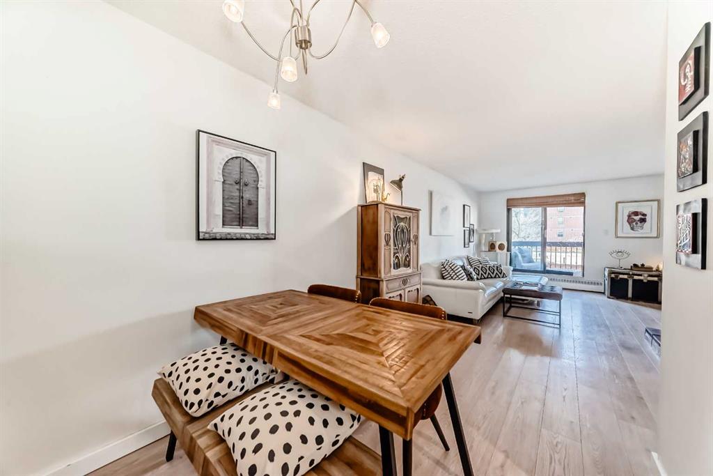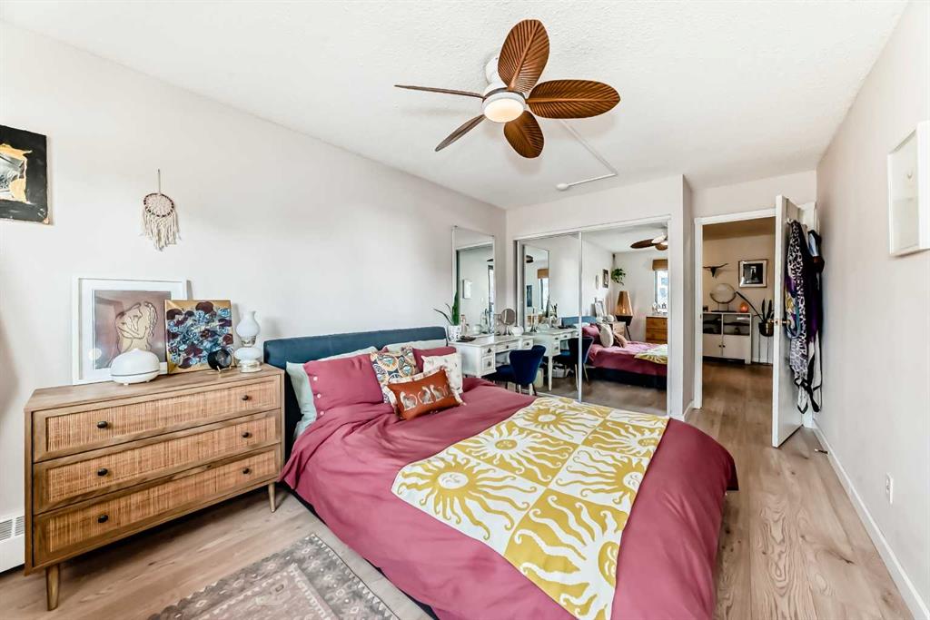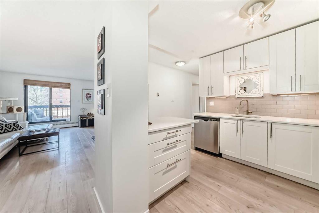 Walk to 17th Avenue, the Stampede Grounds and C-Train, river pathways, cafés, dog parks, and some of Calgary’s best restaurants from this beautifully updated 2-bedroom condo in the heart of the Beltline. Located on a quiet residential street just steps from Lougheed House and its beautiful park, this bright and airy unit offers the perfect blend of urban convenience and comfortable living. Inside, you’ll find newer luxury vinyl plank flooring throughout, a spacious living room with a sleek gas fireplace, and wide sliding doors leading to an oversized balcony that fills the space with natural light and creates the perfect spot to relax or entertain. The updated kitchen features quartz countertops, contemporary cabinetry, newer appliances, and plenty of storage, with room for a full dining table. The generous primary bedroom easily fits a king-size bed and includes private balcony access, while the second bedroom with double French doors works perfectly as a guest room, home office, or flex space. An updated 4-piece bathroom with marble vanity, along with convenient in-suite laundry and storage, completes the home. Residents also enjoy a rooftop patio ideal for summer evenings and an on-site sauna for relaxing after a winter walk. With parks, restaurants, groceries, and Calgary’s best inner-city amenities all within walking distance, this is Beltline living at its best.