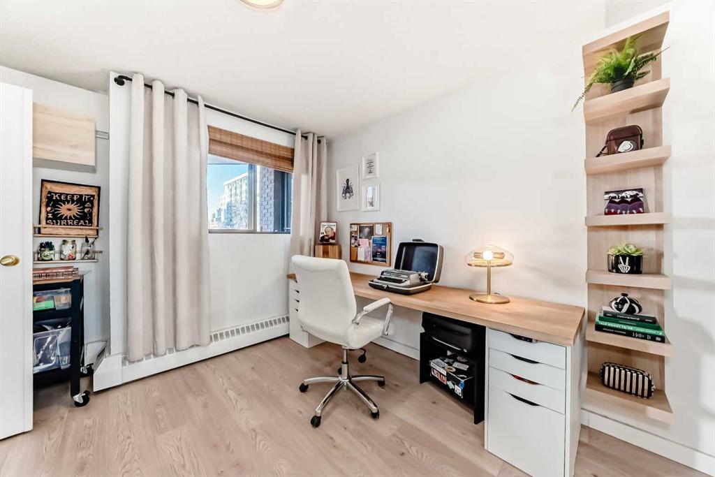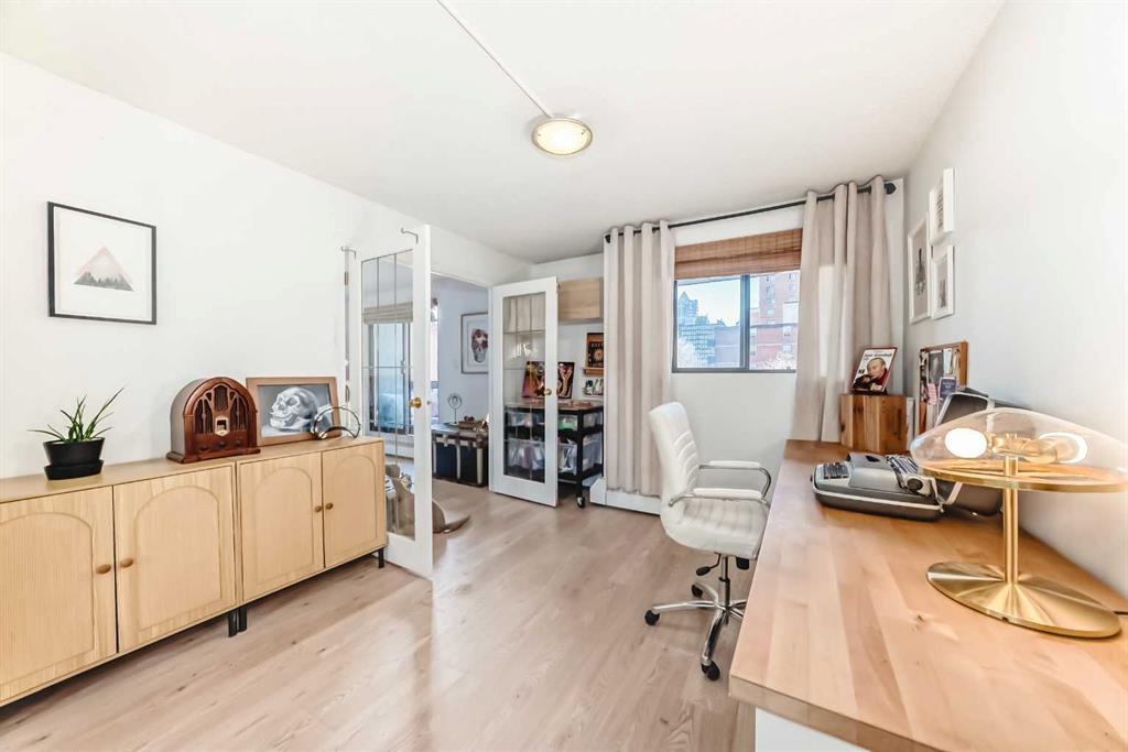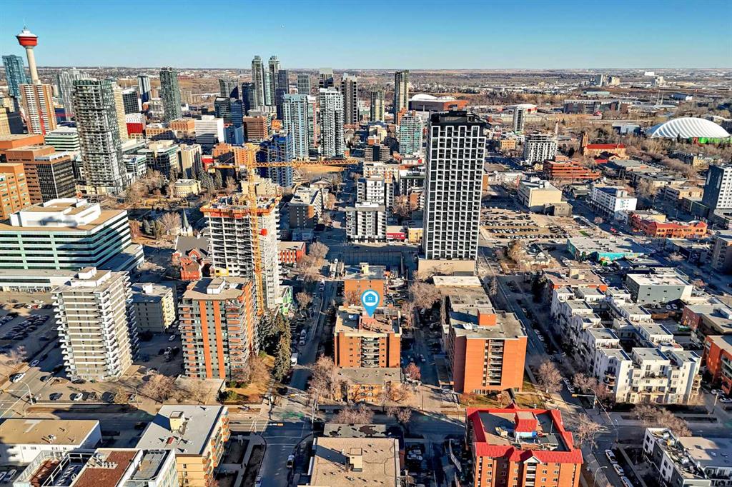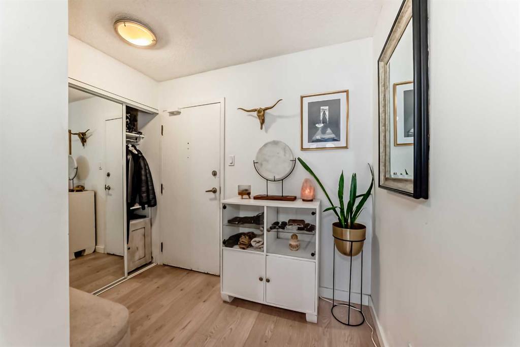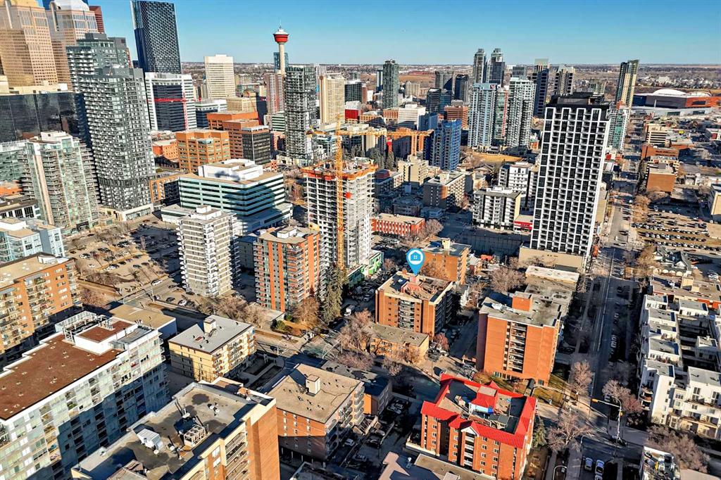 Walk to 17th Avenue, the Stampede Grounds and C-Train, river pathways, cafés, dog parks, and some of Calgary’s best restaurants from this beautifully updated 2-bedroom condo in the heart of the Beltline. Located on a quiet residential street just steps from Lougheed House and its beautiful park, this bright and airy unit offers the perfect blend of urban convenience and comfortable living. Inside, you’ll find newer luxury vinyl plank flooring throughout, a spacious living room with a sleek gas fireplace, and wide sliding doors leading to an oversized balcony that fills the space with natural light and creates the perfect spot to relax or entertain. The updated kitchen features quartz countertops, contemporary cabinetry, newer appliances, and plenty of storage, with room for a full dining table. The generous primary bedroom easily fits a king-size bed and includes private balcony access, while the second bedroom with double French doors works perfectly as a guest room, home office, or flex space. An updated 4-piece bathroom with marble vanity, along with convenient in-suite laundry and storage, completes the home. Residents also enjoy a rooftop patio ideal for summer evenings and an on-site sauna for relaxing after a winter walk. With parks, restaurants, groceries, and Calgary’s best inner-city amenities all within walking distance, this is Beltline living at its best.