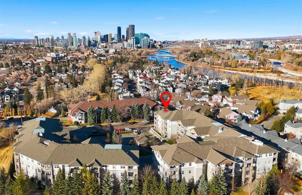 Discover exceptional value and lifestyle in this top-floor corner condo at Pearce Gardens, perfectly situated in the heart of Calgary’s vibrant Inglewood community. This immaculate 2-bedroom, 2-bath home offers almost 900+ sq. ft. of stylish, open-concept living with soaring vaulted ceilings, abundant natural light, and sweeping south and west-facing views of the city skyline, river, green space and surrounding treetops. The inviting living area features a corner gas fireplace and access to a private balcony—ideal for relaxing or entertaining while enjoying the sunset. The modern kitchen offers plenty of counter space, a breakfast bar, and a full appliance package. The spacious primary suite includes a walk-in closet and a private 3-piece ensuite, while the second bedroom and full 4-piece bath are perfect for guests, roommates, or a home office. Additional highlights include in-suite laundry, titled heated underground parking, and a separate storage locker. The well-managed complex offers a fitness center, party room, secure underground visitor parking, and beautifully landscaped grounds. Located just steps from the Bow River pathways, Pearce Estate Park, and Inglewood’s unique shops, cafes, breweries, and restaurants, this home offers the perfect blend of tranquility and urban convenience. Easy access to downtown, major roadways, and transit make it ideal for professionals, downsizers, and investors alike. Move-in ready and meticulously maintained—don’t miss your opportunity to own a piece of one of Calgary’s most sought-after inner-city neighborhood's!