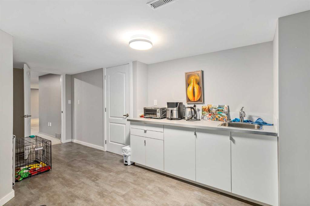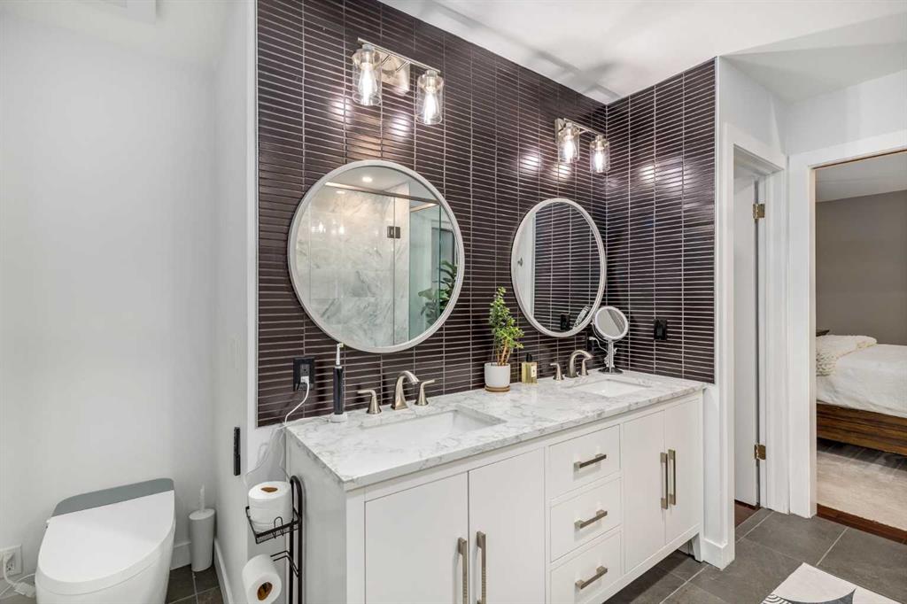Luxury, modern, and timeless fully renovated bungalow on a beautifully landscaped corner lot just one minute from Fish Creek Park! This serene and stylish 4-bedroom, 3-bathroom home offers 3,170 sq. ft. of developed living space and has been completely remodeled and fully finished with trendy finishes and thoughtful upgrades throughout. Poly-B plumbing removed, popcorn ceilings eliminated, vaulted ceilings, and all-new windows provide peace of mind and contemporary comfort. You’re welcomed by mature trees, lush gardens, and a paved walkway beside a brand-new fence leading to the covered front porch. Inside, durable tile flooring, fresh paint, updated floors, and an open, bright layout create an inviting first impression. The foyer flows into a cozy front den or formal living room with rich hardwood flooring, while soaring ceilings elevate the spacious formal dining area—perfect for large gatherings. The show-stopping kitchen features abundant modern cabinetry, quartz countertops and backsplash, stainless steel appliances, water filtration and softener, and a large eat-up island overlooking the family room. Relax by the gas fireplace framed by a contemporary feature wall and custom built-ins. The primary retreat offers direct access to the deck and backyard, along with a spa-inspired 5-piece ensuite showcasing a deep soaker tub, oversized walk-in shower, expansive vanity, private water closet, and generous walk-in closet. A bright second bedroom, modern 4-piece bathroom, and functional laundry/mud room with cabinetry and counter space complete the main level. Downstairs, enjoy a massive recreation room, two additional large bedrooms, a 3-piece bathroom, and a versatile office with sink and built-in cabinetry—ideal for working from home or creative space. Step outside to a stunning two-tier rebuilt deck, fully fenced and landscaped yard, relaxing gazebo, and hot tub—perfect for entertaining or unwinding. The front of the home features an extra-large driveway, RV parking potential, and an insulated double attached garage. Additional highlights include central air conditioning, high-efficiency furnace, new lighting, and upgraded flooring throughout. An exceptional home in an unbeatable location—this is a must-see. Book your private showing today!