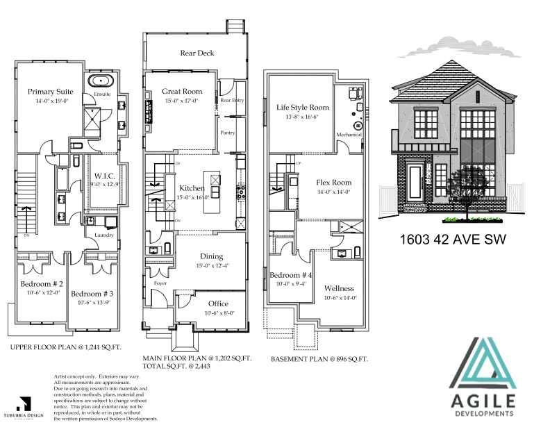 Stunning new build by experienced inner-city builder Agile Developments! Perfectly positioned on a sunny, south backing oversized 30' x 125' corner lot in the heart of Altadore. A timeless, warm brick exterior creates exceptional curb appeal, while the corner orientation allows for additional east-facing windows that flood the home with beautiful natural light throughout the day. Offering over 3,300 sq ft of thoughtfully curated living space, this home showcases outstanding quality, craftsmanship, & a highly functional floor plan. The main level features 10-foot ceilings & wide-plank white oak hardwood floors, creating an airy & inviting atmosphere. A stylish front office is ideal for working from home & is accented by custom wrought-iron detailing that adds a contemporary edge. The dining area, complete with custom millwork & built-ins, flows seamlessly into the chef’s kitchen, outfitted with Miele appliances, including a 6-burner dual-fuel range, Miele refrigerator, Miele Speed Oven, & Bosch dishwasher. A well-designed walk-in pantry with extensive custom cabinetry includes a beverage fridge & ample storage for small appliances. The pantry connects directly to a generous mudroom with built-ins, helping keep busy families organized. The expansive living room is anchored by a striking custom gas fireplace & large sliding doors that open to the sun-filled south backyard & spacious deck, ideal for indoor/outdoor entertaining. The upper level enjoys 9-foot ceilings throughout. The primary retreat overlooks the backyard & features a large walk-in closet with furniture-grade cabinetry & custom built-ins. The luxurious 6pc ensuite includes a steam shower, deep soaker tub, dual vanity, private water closet, heated floors, & premium plumbing fixtures by The Royal Flush. Two additional bedrooms are bright & well-proportioned, while the thoughtfully designed main bathroom is designed to easily facilitate busy mornings. A convenient upper-level laundry room includes a sink, storage, & hanging space. The fully developed lower level offers a versatile media room, games area, fitness room, 4th bedroom, & full bathroom. Notably, there are no bulkheads, as ductwork is routed through open joists enhancing ceiling height & overall openness. In-floor radiant heating & high-performance triple-pane windows enhance energy efficiency, comfort, & sound attenuation ensuring year-round comfort. Ideally located half a block from Altadore Elementary School & Rundle Academy, & just one block from River Park, this home sits on a quiet street while remaining walking distance to the shops, cafes, & restaurants of Marda Loop. A rare opportunity for professionals & young families seeking refined inner-city living in one of Calgary’s most vibrant communities. Expected completion is May 2026. Contact today to discuss available customization options & secure this exceptional home!