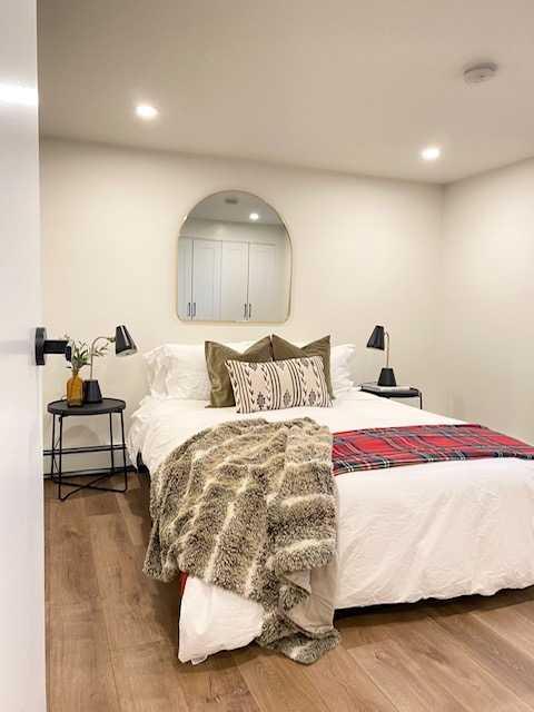 Welcome to this beautifully renovated bungalow tucked away on a quiet private crescent in the heart of Bowness, with a park and green space directly across the street. Thoughtfully redesigned, this 900-square-foot home blends modern sophistication with warmth and functionality, offering a fully legal basement suite with a separate entrance for added flexibility. The main floor is filled with natural light and showcases a stunning designer kitchen that anchors the space. Rich black cabinetry paired with sleek brass hardware creates a bold yet timeless aesthetic. Crisp white quartz countertops and a classic subway tile backsplash add brightness and contrast, while the statement black range hood provides a striking focal point. A large island with an undermount sink and matte black faucet offers both prep space and gathering space, making it perfect for entertaining or everyday living. The brand-new kitchen is complete with a Whirlpool fridge, hood fan, electric stove, dishwasher, and a convenient stacked laundry setup for the upper suite. The Luxury Vinyl Plank flooring runs throughout the main level, which features two spacious bedrooms and a beautifully updated full bathroom. Large windows invite in abundant natural light and frame views of the mature trees outside. Downstairs, the fully legal two-bedroom suite mirrors the same thoughtful renovation and modern finishes. With its own private laundry, radiant baseboard heating, and an HRV system for continuous fresh air circulation, the lower level offers exceptional comfort and independence. ROCKWOOL® fire-rated insulation between floors enhances safety while significantly reducing sound transfer, ensuring privacy between suites. The southwest-facing backyard is a peaceful retreat, filled with mature trees that burst into beautiful blooms each spring and perennial peonies that add charm and colour throughout the season. Enjoy the best of Bowness living with easy access to the Bow River pathways, Bowness Park, local schools, and a quick commute to downtown Calgary or to the mountains. Whether you are seeking a stylish primary residence with mortgage support or a turnkey investment opportunity, this home offers design, comfort, and versatility in one of Calgary’s most established communities.