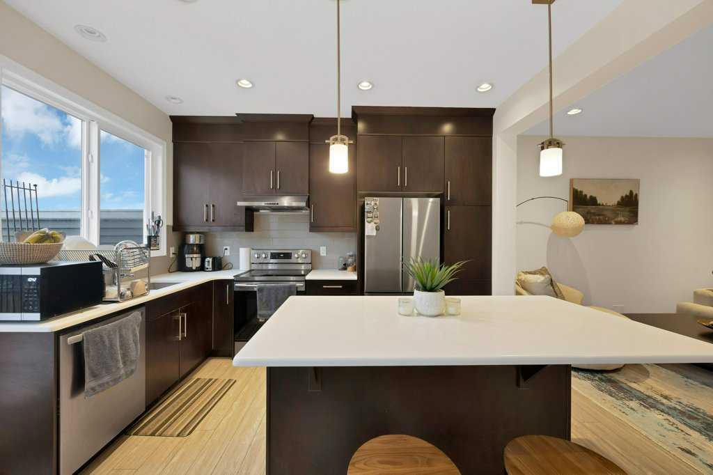 Welcome to this beautifully maintained semi-detached home with an attached single front garage, ideally located in the desirable community of Kings Heights. This thoughtfully designed property offers 3 spacious bedrooms upstairs, including a generous primary suite with a 3-piece ensuite, along with a versatile bonus room perfect for a home office or family lounge. The fully developed basement adds additional living space with a fourth bedroom, ideal for guests or extended family. The main floor features a bright open-concept layout with durable LVP flooring, a modern L-shaped kitchen complete with quartz countertops and stainless steel appliances, and seamless flow into the dining and living areas—perfect for entertaining. Upstairs is finished with cozy carpeting, while outside you’ll enjoy a full-length deck, fully fenced and landscaped yard ready for summer gatherings. Conveniently located close to parks, ponds, schools, and shopping, this home offers the perfect blend of comfort, style, and everyday convenience.