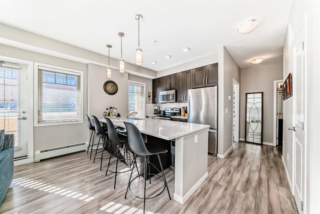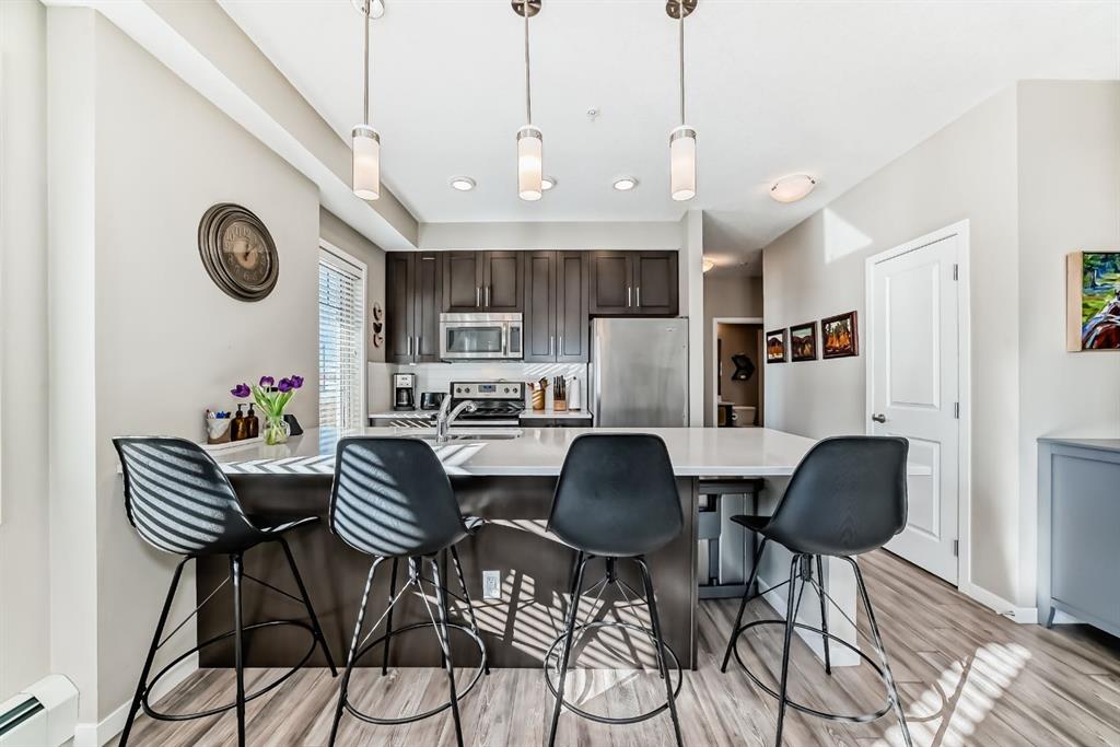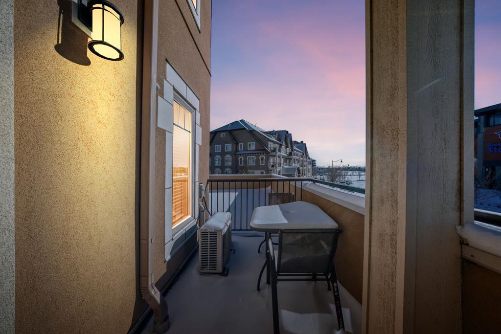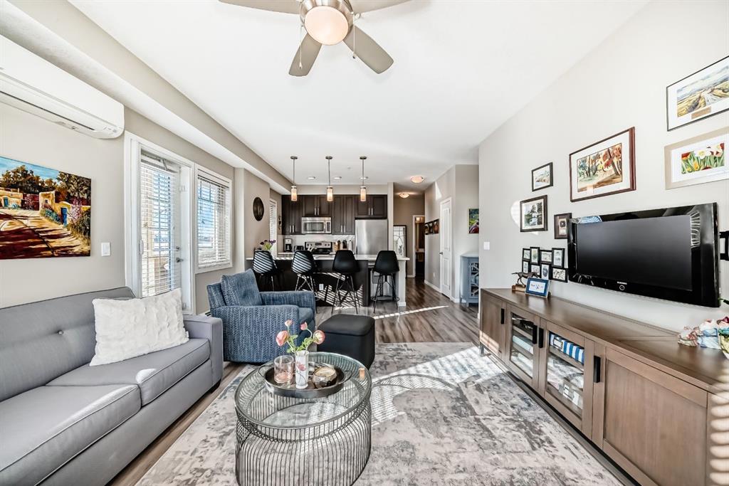 Welcome to this beautifully maintained 2 bedroom, 2 bathroom corner unit in an unbeatable location. With desirable south facing exposure, this home is filled with natural light throughout the day, creating a warm and inviting atmosphere. The thoughtfully designed layout offers a rare hallway entrance that opens into a bright, open concept living space, creating both privacy and flow. A front entry closet and two additional pantry closets provide exceptional storage, while in unit laundry adds everyday convenience. The primary bedroom features built in shelving within the walk in closet and a private 3 piece ensuite bathroom. Stainless steel appliances were updated in 2019, and air conditioning keeps the space comfortable during the summer months, making this home truly move in ready. Step outside onto the impressive 36 foot south facing balcony with mountain views, an ideal extension of your living space to enjoy a quiet morning coffee or relax in the evening sun. Additional highlights include heated underground parking with a storage locker conveniently located directly in front of the stall, stairwell access just outside the unit, and a private gym within the building. Situated in a vibrant, amenity rich community with shops, dining, schools, and everyday essentials within walking distance, this is condo living at its best. Don't forget that you will have lake access all year round for swimming and skating! A wonderful opportunity to own in a highly sought after neighbourhood.