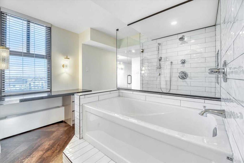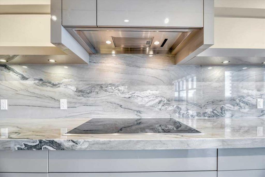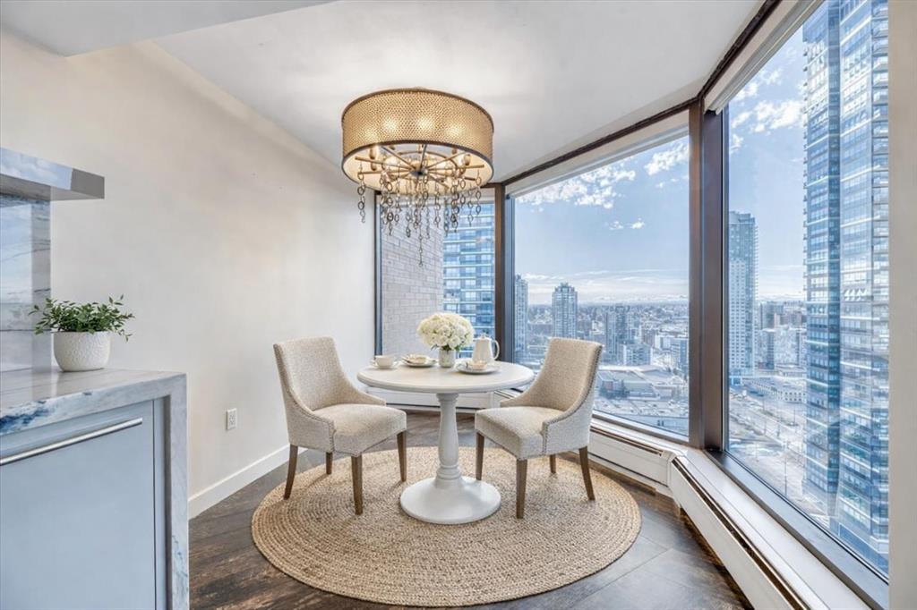 Welcome to a rare inner-city opportunity that simply does not come around often. Perched on the 24th floor of Westmount Place, this just over 2,400 square foot residence delivers a level of space, privacy, and sophistication rarely found in downtown Calgary. Floor-to-ceiling windows showcase unobstructed views of the Bow River, city skyline, and the Rocky Mountains, creating a breathtaking backdrop day and night. From the moment you enter, the quality is unmistakable. A total professional renovation has transformed this home into a refined, open-concept masterpiece. The welcoming foyer with custom built-ins sets the tone, while the living and dining areas are bathed in natural light and designed to entertain with ease while still offering comfort and privacy. The kitchen is nothing short of exceptional. High-end quartzite countertops, undermount sink, abundant cabinetry, premium stainless steel appliances, and a dedicated eating area make it as functional as it is beautiful. Whether hosting or enjoying a quiet morning coffee, this space delivers. The spacious primary suite is a true retreat, easily accommodating full-sized furnishings while offering stunning views. The luxurious five-piece ensuite features dual sinks, a custom glass shower, a deep soaker tub, and a large walk-in closet with built-in organizers. The glass-enclosed den is a standout feature, offering a refined and highly functional space ideal for today’s professional. Framed in glass and finished with privacy drapes, it delivers natural light while maintaining separation from the main living area. Thoughtfully designed with a walk-in closet, a dedicated office nook, and access to a private three-piece bathroom, this versatile room functions beautifully as a home office, guest retreat, or flexible living space—without compromising style or comfort. Luxury vinyl plank flooring flows throughout. In-suite laundry with high-end washer and dryer, a powder room, central air conditioning, and additional storage complete the home. Two side-by-side secured underground parking stalls on the P1 level add everyday convenience. Residents of Westmount Place enjoy a 24-hour concierge, newly renovated lobby, fitness facilities, racquetball and squash courts, dedicated change rooms, Luxer parcel storage, and a proactive board supported by an exceptionally healthy reserve fund. Ideally located on the quiet residential side of downtown, steps from the Bow River pathway system, the free ride LRT zone, grocery stores, restaurants, and cultural destinations. This is downtown luxury without compromise. Homes of this caliber are rarely offered. Now is the time to experience what Westmount Place has to offer. Ready to see it in person? This view is waiting.