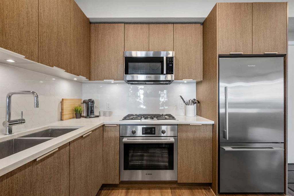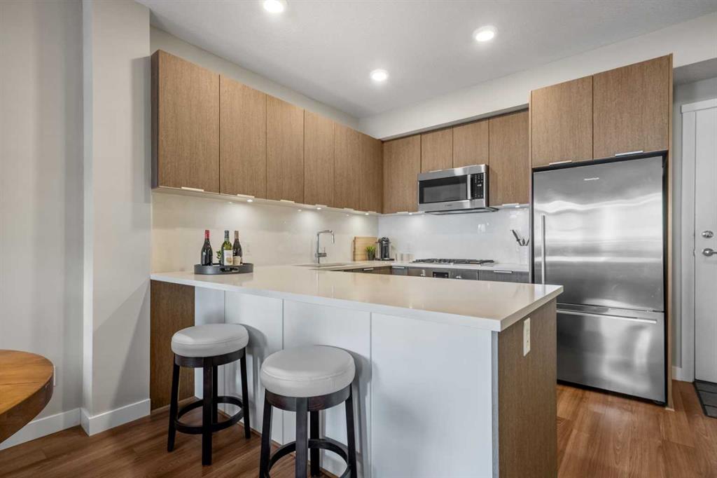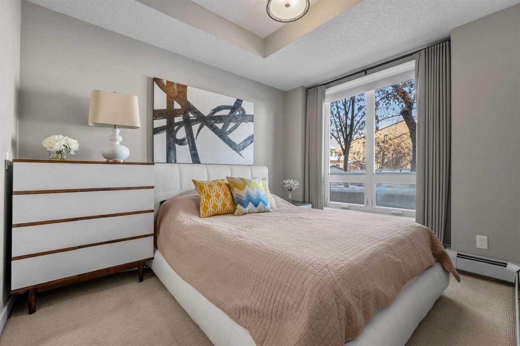 Located in the sought after Ven of Kensington, this ground floor one bedroom apartment offers modern construction, direct outdoor access, and an exceptional west Sunnyside location just steps from Kensington and minutes to downtown. Measuring 580 square feet, the layout is bright and efficient, enhanced by 9 foot ceilings that create an open, comfortable feel. The kitchen features quality stainless steel appliances and flows into the main living area, while in suite laundry adds everyday practicality. The bedroom and full bathroom are well proportioned, making the home equally suitable for personal use or rental income. The standout feature is the spacious private patio. Larger than most upper floor balconies, it provides direct gated access to the street, a rare advantage in apartment living. For dog owners, this location is especially appealing, with the Rosedale Off Leash Area and McHugh Bluff Playground directly across the street, offering immediate access to green space and walking paths. Built in 2015, the Ven offers secure underground parking with one titled stall included, along with an assigned storage unit. The parkade also features a workshop and two bike storage areas, ideal for those who take advantage of the nearby Bow River pathway system and quick downtown cycling routes. Sunnyside continues to attract first time buyers, investors, and adults in transition who value walkability and connection. Kensington’s cafés, restaurants, and daily services are only minutes away, and the Sunnyside CTrain station makes car optional living realistic. A well located, low maintenance home that combines convenience, comfort, and long term appeal in one of Calgary’s most established inner city communities.