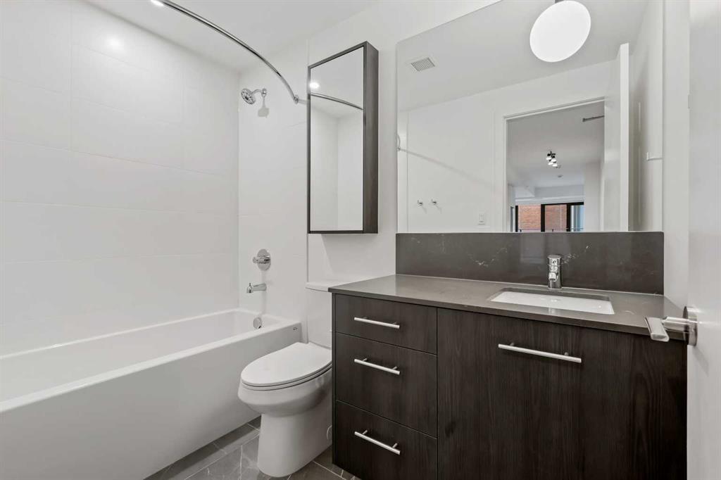 Welcome to Unit 207 at First & Park — a contemporary one-bedroom, one-bathroom condo ideally located in Calgary’s desirable Eau Claire district. This stylish unit offers the best bang for your buck in the building! The kitchen boasts stainless steel appliances, quartz countertops, and plenty of cabinetry, while the living area offers extra space to relax or entertain as it continues out to your private balcony. Additional highlights include in-suite laundry, full bathroom, a titled storage locker, and building amenities - fitness/yoga studio, party lounge, coworking space, concierge 7 days a week, snaile package centre, and two elevators. Enjoy being just steps from the Bow River pathways, Prince’s Island Park, Eau Claire Market, and downtown’s best restaurants, cafés, and shops — all while living in a quiet, boutique building. Whether you’re a first-time buyer, investor, or looking for a downtown pied-à-terre, this property checks all the boxes for stylish inner-city living. Packages available for FURNISHED UNITS! 1 titled storage included with unit!