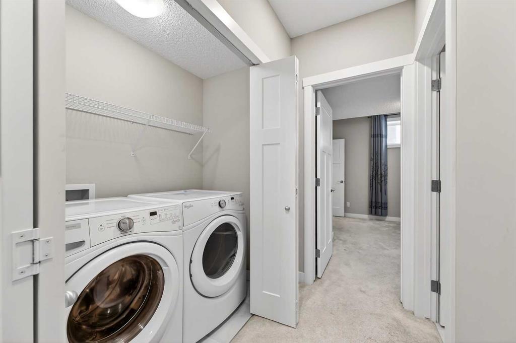 Beautifully designed 4 bedroom home offering over 2,000 sq. ft. of fully developed living space. With three bedrooms upstairs and one in the fully finished lower level, this thoughtfully laid out property combines modern finishes with functional design, perfect for families or those seeking flexible living space. A welcoming foyer opens to a bright, open concept main floor featuring 9 foot ceilings and luxury vinyl plank flooring. The stylish kitchen showcases an extended island, stainless steel appliance package, soft close cabinetry, and ample counter and cupboard space, ideal for everyday living and entertaining. Just off the dining nook, you will find access to the private back deck and fenced backyard, creating seamless indoor outdoor flow. A convenient 2 piece powder room completes the main level, along with access to the extra wide double detached garage. The fully developed lower level also features 9 foot ceilings and includes a spacious media or recreation room, versatile flex space perfect for a home office or gym, a large fourth bedroom with generous closet space, a 4 piece bathroom, and a dedicated laundry area with washer and dryer included. Upstairs, soaring ceilings and abundant natural light enhance the space. The primary suite offers a vaulted ceiling, large windows, a 4 piece ensuite, and an impressive walk in closet. Two additional bedrooms and another 4 piece bathroom complete the upper level. Adding to the home’s charm, a lovely front deck welcomes you as you walk up the front stairs, the perfect place to enjoy your morning coffee. Ideally located close to some of Calgary’s top rated schools, parks, pathways, shopping, dining, and everyday amenities, this home offers the perfect balance of lifestyle and convenience. Thoughtfully finished across all three levels, it delivers space, style, and functionality in an exceptional setting.