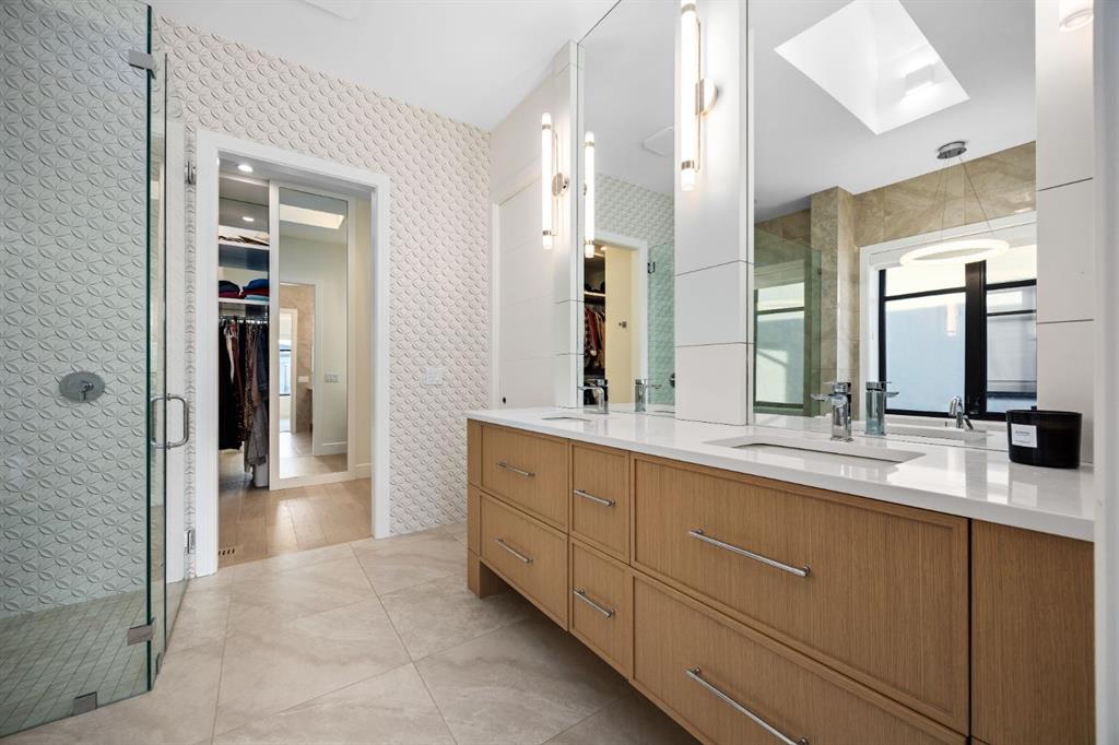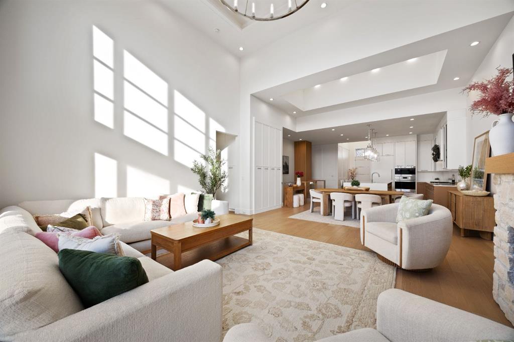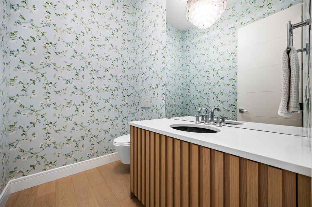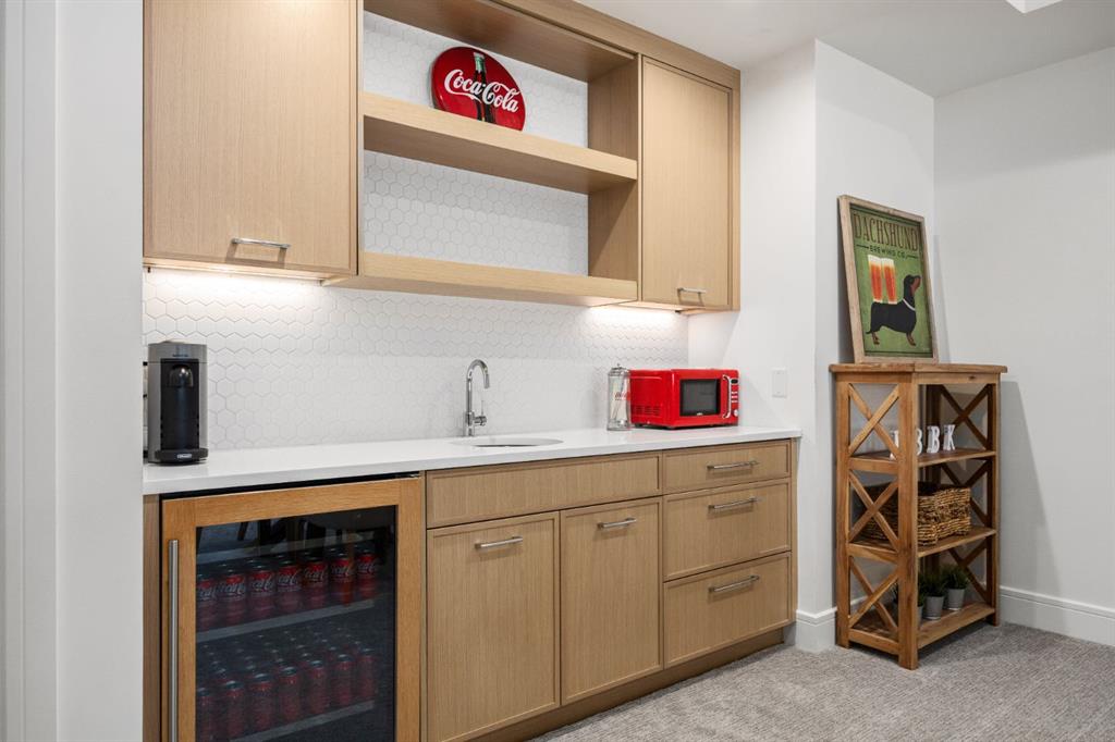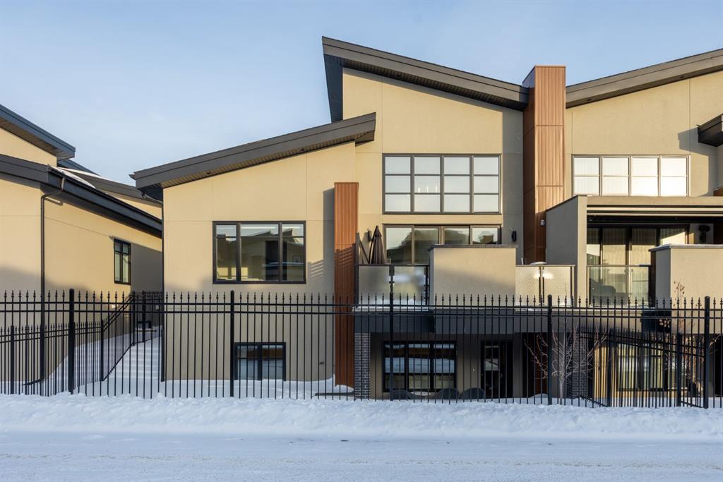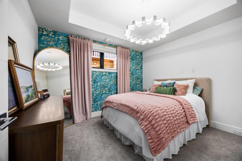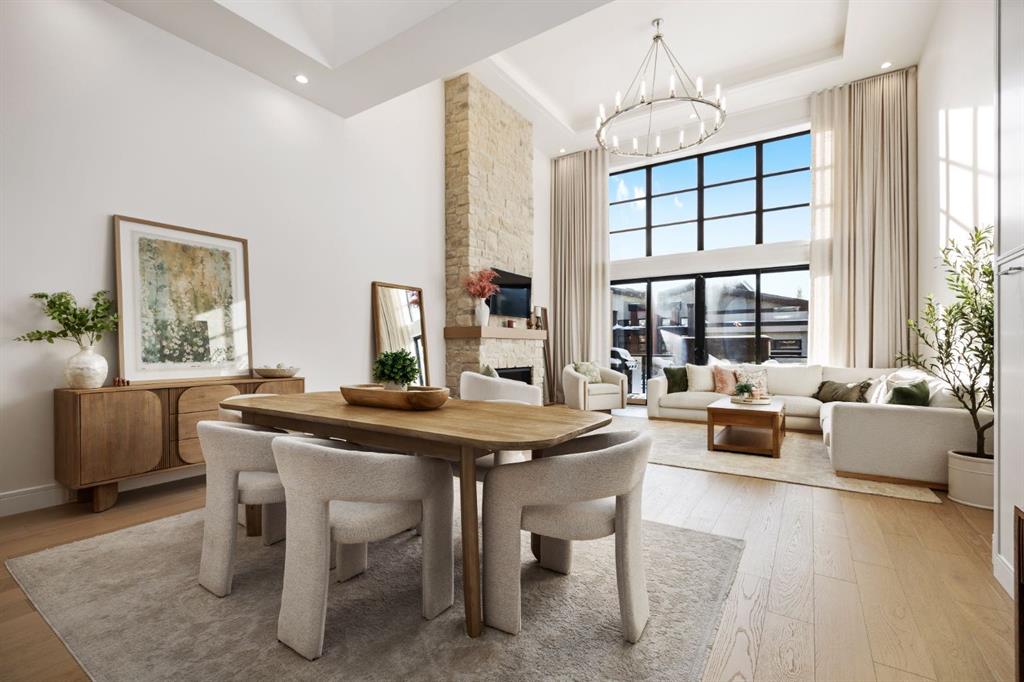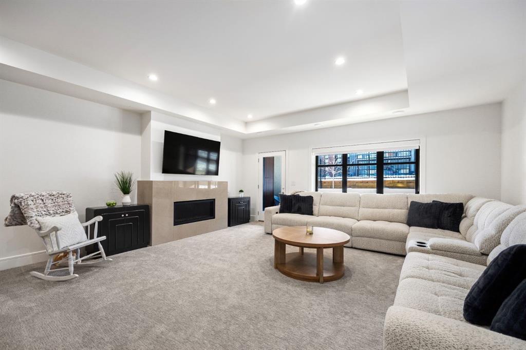 Introducing a rare offering in the sold out luxury bungalow community of Elveden Court on Calgary’s coveted west side, made up of only 26 units. This refined residence represents the pinnacle of lock-and-leave living, designed for discerning homeowners who appreciate exquisite craftsmanship paired with the ease of a low-maintenance, lock and leave lifestyle. This unit is elegantly finished with tile, flooring, millwork, wallpaper and stone upgrades from an already elevated build quality to create a serene, warm and inviting atmosphere. Builder owned, rest assured, every detail has been carefully executed! The open-concept main level is warm and inviting, with light oak hardwood flooring, soaring ceilings, ample skylights and expansive windows that flood the entire living space with natural light. A striking hand built stone fireplace anchors the great room under 16’ ceilings, while large doors open to a west facing patio with a built-in gas fireplace, perfect for indoor-outdoor entertaining. The kitchen is a true showpiece, appointed with a premium Wolf & Sub-Zero appliance package. Custom cabinetry including an enhanced walk up pantry design is complemented by an upgraded quartz backsplash and a waterfall island creating both visual impact and exceptional functionality. The main level primary suite offers a tranquil retreat, featuring a spacious bedroom, walk-in dressing room, and a spa-inspired ensuite with in-floor heat, upgraded tile selections, dual vanities, a freestanding soaker tub, and an oversized 10mm glass shower. Custom, elegantly exciting wallpaper feature walls adorn many of the tranquil spaces throughout the home. A beautifully appointed den with custom millwork, a powder room and a well appointed laundry area complete the main floor. The fully developed walk-up level with 9’ ceilings is designed for entertaining and lifestyle flexibility. A spacious recreation area is highlighted by an upgraded gas fireplace and a wet bar. Two additional bedrooms with custom closets and a full three-piece bath provide ideal accommodation for guests or older children. This lower level also has a thoughtfully upgraded home gym, and additional storage in the mechanical room. The oversized double attached garage features a heated slab, epoxy flooring, transom windows for natural light, and a custom storage mezzanine. Built to an exceptional standard, the home was constructed with full Insulated Concrete Forms (ICF) to the soffit line, including the party wall, delivering superior thermal efficiency, sound attenuation, and long-term durability. Triple-glazed windows and skylights enhance comfort and natural light further exemplifying the quality of construction. Minutes to Aspen Landing, Westside Recreation Centre, Stoney Trail, and the Rocky Mountains, this villa community offers an un offers an unparalleled blend of privacy, quality, and convenience.
