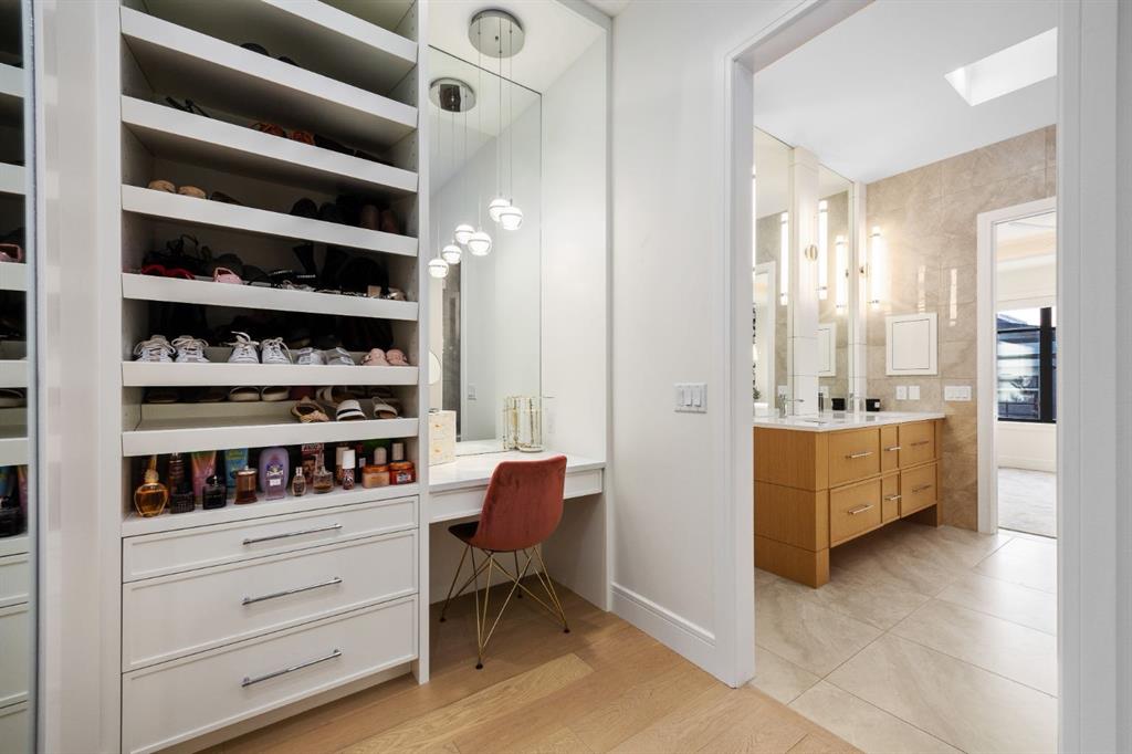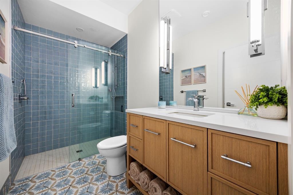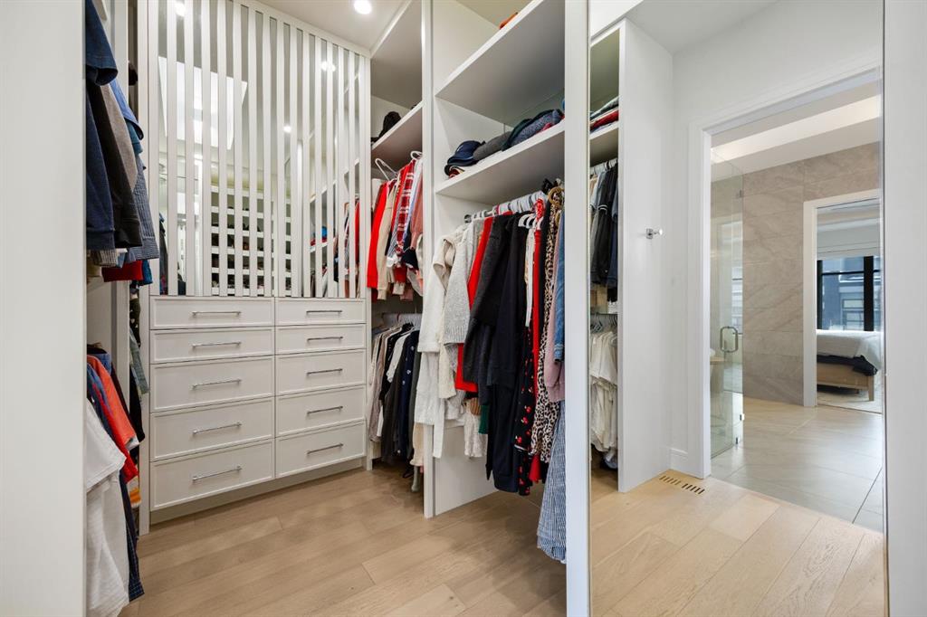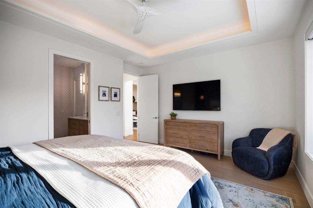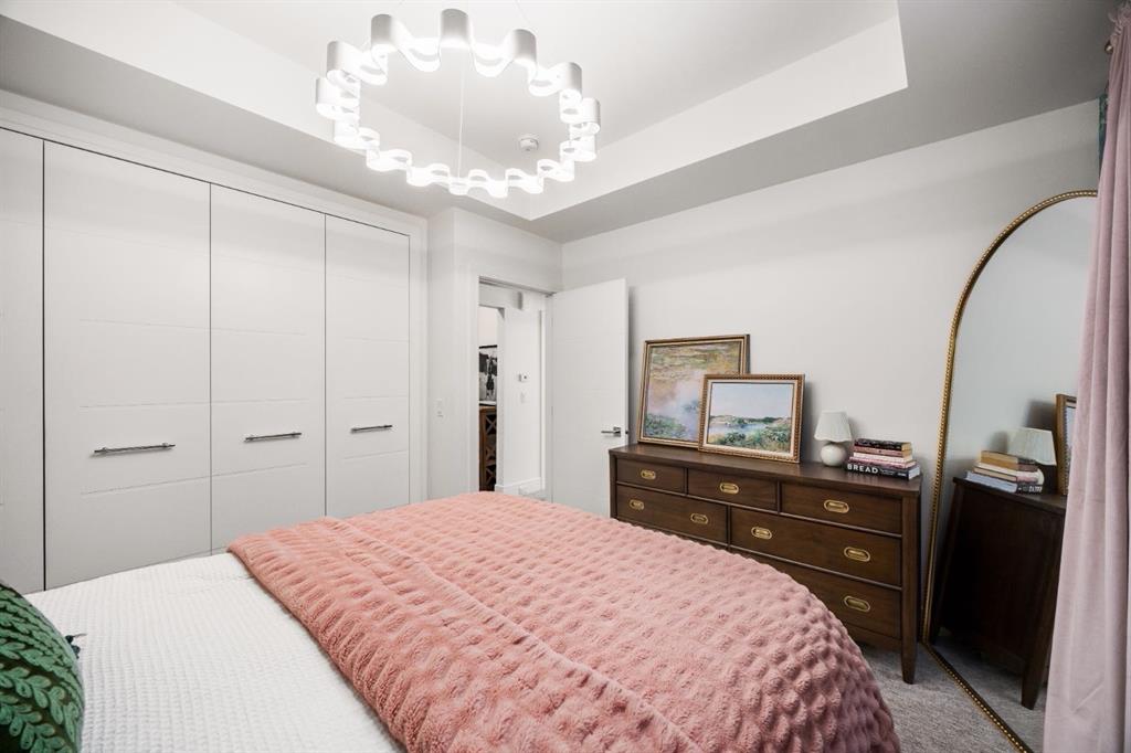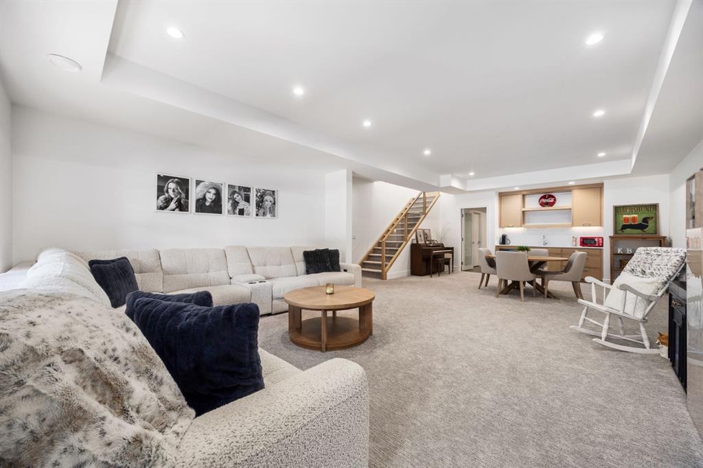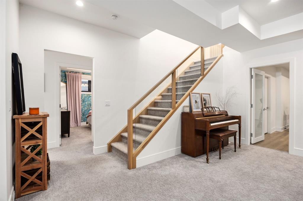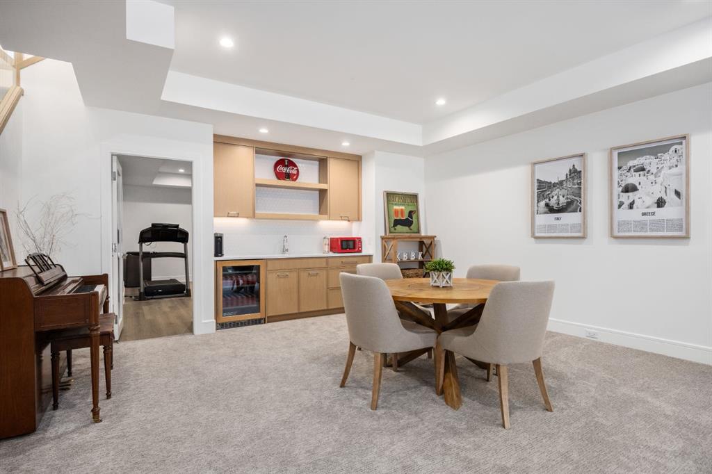 Introducing a rare offering in the sold out luxury bungalow community of Elveden Court on Calgary’s coveted west side, made up of only 26 units. This refined residence represents the pinnacle of lock-and-leave living, designed for discerning homeowners who appreciate exquisite craftsmanship paired with the ease of a low-maintenance, lock and leave lifestyle. This unit is elegantly finished with tile, flooring, millwork, wallpaper and stone upgrades from an already elevated build quality to create a serene, warm and inviting atmosphere. Builder owned, rest assured, every detail has been carefully executed! The open-concept main level is warm and inviting, with light oak hardwood flooring, soaring ceilings, ample skylights and expansive windows that flood the entire living space with natural light. A striking hand built stone fireplace anchors the great room under 16’ ceilings, while large doors open to a west facing patio with a built-in gas fireplace, perfect for indoor-outdoor entertaining. The kitchen is a true showpiece, appointed with a premium Wolf & Sub-Zero appliance package. Custom cabinetry including an enhanced walk up pantry design is complemented by an upgraded quartz backsplash and a waterfall island creating both visual impact and exceptional functionality. The main level primary suite offers a tranquil retreat, featuring a spacious bedroom, walk-in dressing room, and a spa-inspired ensuite with in-floor heat, upgraded tile selections, dual vanities, a freestanding soaker tub, and an oversized 10mm glass shower. Custom, elegantly exciting wallpaper feature walls adorn many of the tranquil spaces throughout the home. A beautifully appointed den with custom millwork, a powder room and a well appointed laundry area complete the main floor. The fully developed walk-up level with 9’ ceilings is designed for entertaining and lifestyle flexibility. A spacious recreation area is highlighted by an upgraded gas fireplace and a wet bar. Two additional bedrooms with custom closets and a full three-piece bath provide ideal accommodation for guests or older children. This lower level also has a thoughtfully upgraded home gym, and additional storage in the mechanical room. The oversized double attached garage features a heated slab, epoxy flooring, transom windows for natural light, and a custom storage mezzanine. Built to an exceptional standard, the home was constructed with full Insulated Concrete Forms (ICF) to the soffit line, including the party wall, delivering superior thermal efficiency, sound attenuation, and long-term durability. Triple-glazed windows and skylights enhance comfort and natural light further exemplifying the quality of construction. Minutes to Aspen Landing, Westside Recreation Centre, Stoney Trail, and the Rocky Mountains, this villa community offers an un offers an unparalleled blend of privacy, quality, and convenience.