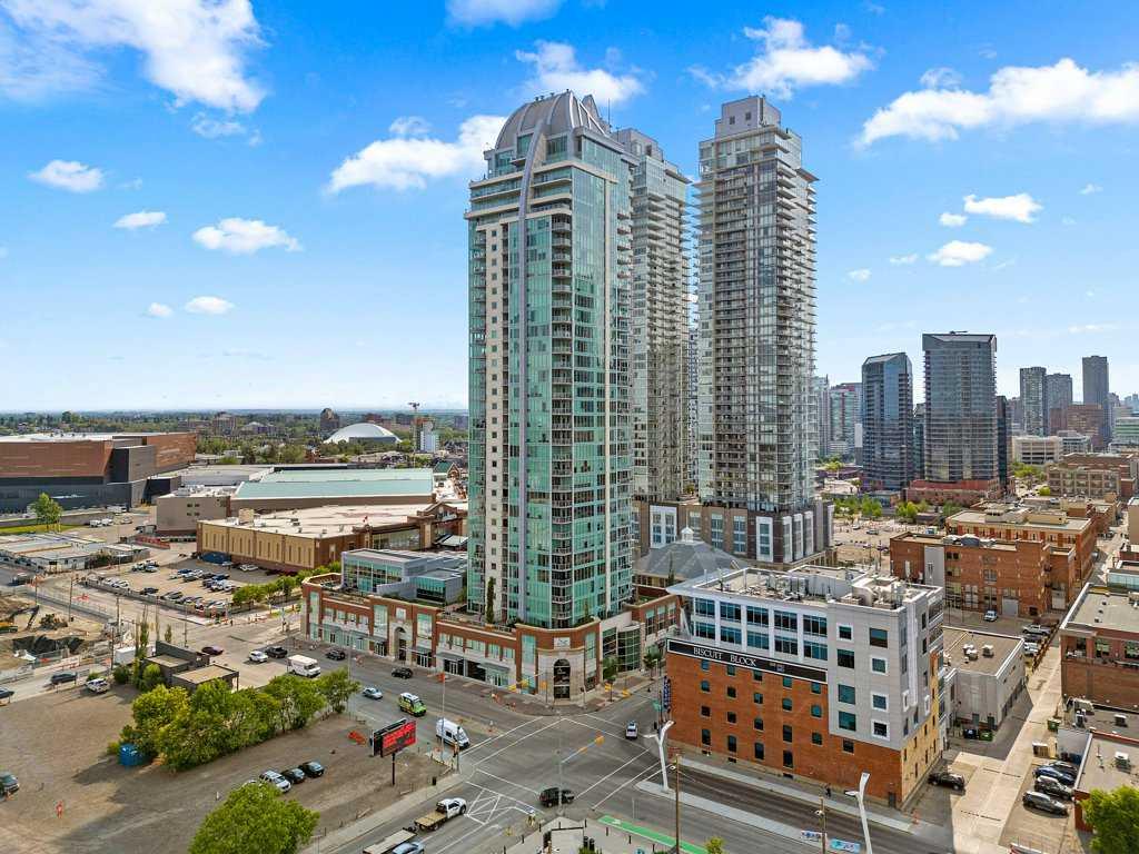 Discover contemporary elegance and city convenience in this immaculate 1,234 sq ft corner unit in the highly sought-after Arriva. Perfectly positioned in the heart of Calgary, this residence offers a rare combination of modern sophistication, spacious comfort, and unparalleled access to some of the city’s most iconic attractions. Just steps from the Saddledome, Stampede Park, Cowboys Casino, acclaimed restaurants, boutique cafés, fitness studios, and live entertainment, you'll enjoy a lifestyle that’s vibrant and connected. Whether it’s catching a concert, soaking in the energy of Stampede, or exploring downtown’s culinary and cultural scene, everything is at your doorstep. Inside, floor-to-ceiling windows on two sides flood the space with natural light and frame stunning city views. The expansive open-concept layout is designed for effortless living and entertaining, featuring a chef-inspired kitchen with a large central island, gas cooktop, stainless steel appliances, and sleek full-height cabinetry. A generous dining area sits in front of a picture window for added ambiance, while the spacious living room opens to a glass-railed balcony—ideal for BBQs, warm evenings, or watching the Stampede fireworks. Hardwood flooring runs throughout, and central air conditioning ensures year-round comfort. The bright south-facing primary suite offers sweeping views, a walk-in closet, and a stylish 4-piece ensuite. A second bedroom with its own walk-in closet and oversized windows is thoughtfully located on the opposite side of the unit next to the second full bathroom—perfect for guests, roommates, or a home office setup. Additional features include in-suite laundry, custom blackout blinds, titled underground parking (P-4 #34), and an assigned storage locker (P4-OO). Arriva residents enjoy exclusive amenities including a contemporary lobby, 24-hour concierge and security, two rentable guest suites, and a spectacular event lounge with a full kitchen, floor-to-ceiling windows, and private rooftop patio access. This is a rare opportunity to own or invest in one of Calgary’s most walkable, dynamic, and well-connected downtown communities.