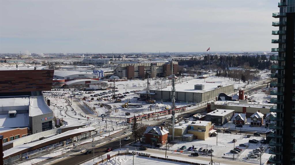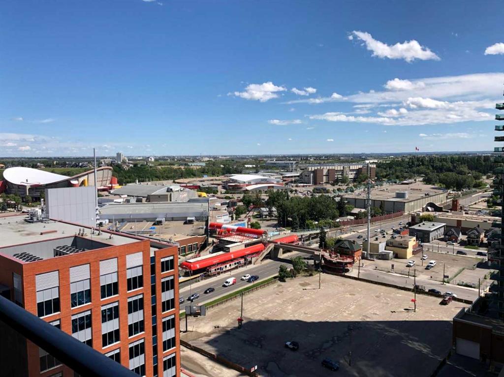High-floor investment opportunity in Nuera, a sought-after 18+ concrete high-rise in Calgary’s Beltline. Positioned on the 17th floor, this 1-bedroom, 1-bath residence offers desirable south and east exposure, filling the space with natural light throughout the day, plus sunrise-to-sunset city views and west-facing mountain view. Enjoy spectacular views of Stampede Park and the downtown skyline from your private balcony. Inside, 9-foot ceilings and expansive floor-to-ceiling windows create an airy, open atmosphere. The thoughtfully designed open-concept layout features modern finishes, generous cabinetry, deep pot drawers, black appliances, and a functional flow ideal for both entertaining and everyday living. The spacious bedroom offers large windows and ample closet space, complemented by a well-appointed 4-piece bath and in-suite stacked laundry. This residence includes secured underground titled parking and a dedicated storage locker. Nuera offers concierge service, a fully equipped fitness centre, and bike storage — all within a professionally managed building. Ideally located just one block from Victoria Park LRT, Stampede Park, and Sunterra Market, and steps to 17th Avenue’s shopping, dining and entertainment, this address delivers elevated urban convenience with lasting value. High-floor residences with this exposure and view profile are rarely available. IMPROVED PRICE! Book your showing today.