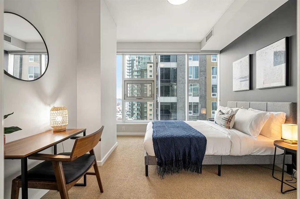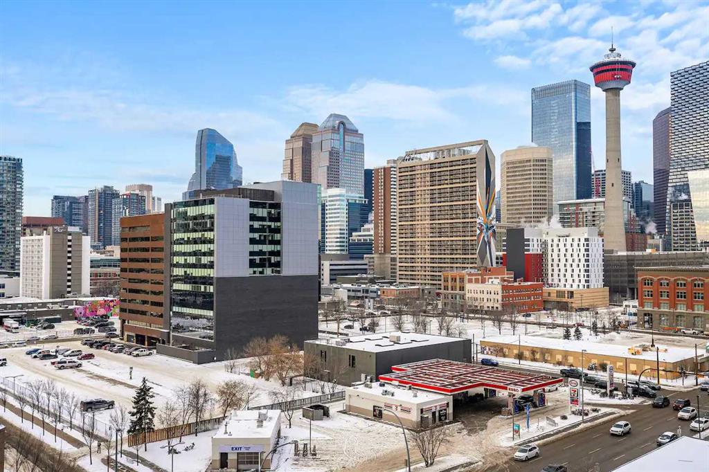 Experience Elevated Urban Living at Nuera! Step into sophisticated city living in one of Victoria Park’s most coveted buildings—Nuera. This stunning corner unit offers uninterrupted views of downtown Calgary, including the iconic Calgary Tower, through dramatic floor-to-ceiling windows and soaring 9-foot ceilings that flood the space with natural light from the west facing windows. Designed with both style and function in mind, this expansive 2-bedroom, 2-bathroom residence is the perfect blend of modern luxury and everyday comfort. The chef-inspired kitchen is the heart of the home, featuring sleek granite countertops, stainless-steel appliances, rich cabinetry, and a breakfast bar—ideal for entertaining or casual dining. The open-concept layout flows effortlessly from the kitchen to the designated dining area and bright, inviting living room, which opens onto a spacious private balcony with panoramic city views. The primary suite is a true retreat, complete with a generous walk-through closet with dual sides and a well-appointed 4pc ensuite. The second bedroom is thoughtfully positioned on the opposite end of the unit for optimal privacy—perfect for guests or a home office—and is paired with a stylish 3-piece bathroom just steps away. Additional features include in-suite laundry, a titled underground parking stall, secure storage, bike storage, and access to a state-of-the-art fitness centre. The building also offers the peace of mind of full-time security, concierge service, and underground visitor parking. All this in a prime location—just steps to the downtown core, C-Train, Sunterra Market, and the vibrant energy of 17th Avenue’s dining and boutique scene. Luxury. Convenience. Location. This is city living at its finest. Book your private showing today!