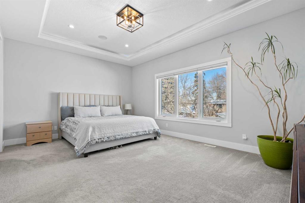 Welcome to 420 14 Avenue NE, an impeccably designed detached infill located on a quiet, tree-lined street in the heart of Renfrew, one of Calgary’s most sought-after inner-city communities. Boasting 3,100 sqft of luxuriously finished living space, this beautifully appointed 4 bedroom, 3.5 bathroom home combines elegant finishes with functional family-friendly design. The main floor features soaring 10’ ceilings, engineered hardwood flooring, custom lighting, and an open-concept layout ideal for entertaining. The chef-inspired kitchen is the centerpiece, complete with quartz countertops, a large island with eating bar, stainless steel appliances, walk-in pantry, and built-in buffet. A spacious living room showcases a floor-to-ceiling tile fireplace flanked by custom built-ins, and a formal dining area and tech center make daily life seamless. As you head upstairs you’ll immediately notice the high vaulted ceilings, 8ft doors, and abundance of natural light. The primary bedroom feels less like a bedroom and more like a retreat. It is a true sanctuary, easily accommodating a king-sized bed and nightstands, plus a separate sitting area, recessed lighted ceiling, large walk-in closet with built-ins, and a spa-style 5-piece ensuite with dual sinks, jetted tub, and oversized 10mm glass shower (roughed-in for steam). Two additional bedrooms, an upper laundry room, plus an additional full bath round out the upper level with thoughtful efficiency. The fully developed basement offers 9’ ceilings, a sprawling media/rec room with custom home theatre set up, wet bar, fourth bedroom, and a stylish 3-piece bathroom. The separate side entrance and wet bar layout create a fantastic opportunity for a future legal suite (subject to City approvals). Additional features include central air conditioning, glass-paneled staircase with wood accents, designer fixtures, built-in storage, and a double detached garage. Outside, the private backyard with deck offers a perfect spot to unwind. Situated just minutes to downtown Calgary and walking distance to Munro Park, Renfrew Athletic Park, top schools and beloved local gems like Boogie’s Burgers and Peter’s Drive-In. This is the perfect blend of upscale inner-city living and family comfort.
