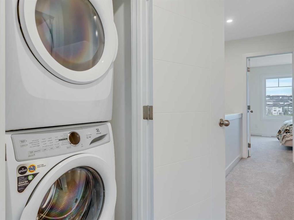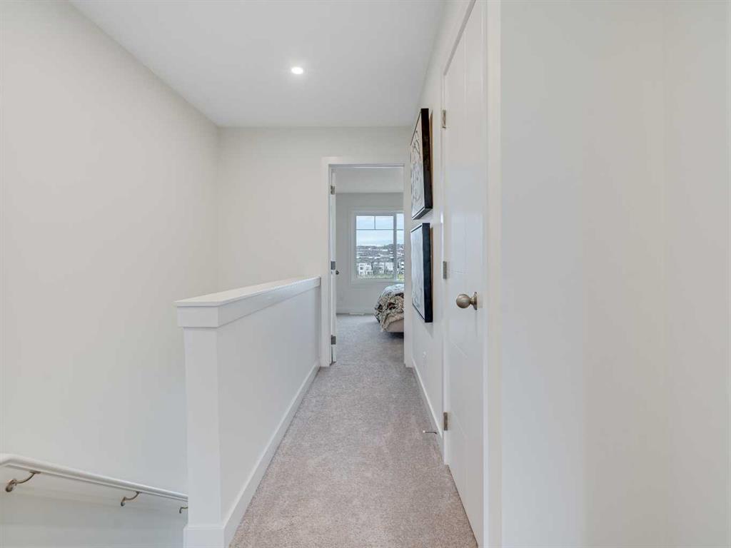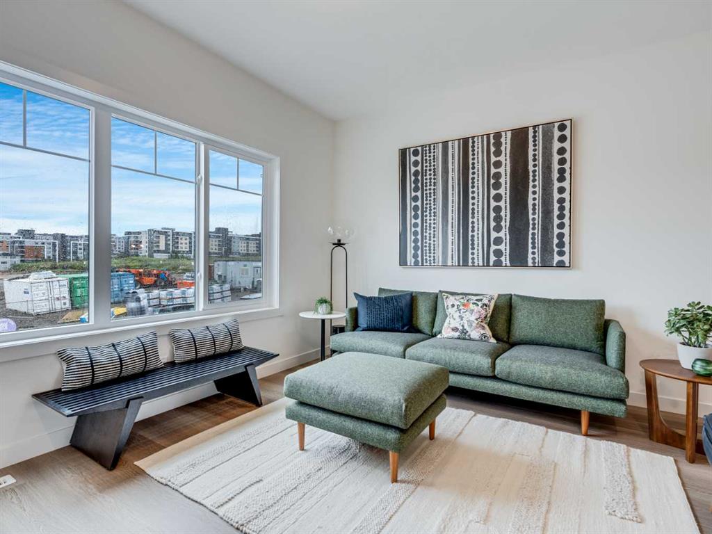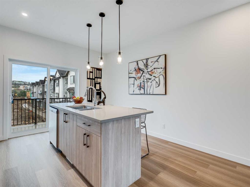 IMMEDIATE OCCUPANCY AVAILABLE – GST INCLUDED. Welcome to the Juniper Townhomes in prestigious Springbank Hill/Aspen. This 2-bedroom townhome offers a sophisticated design with an emphasis on natural light and functional space. The ground level features a private yet bright den/home office with a large window and closet, a convenient 2-piece powder room, and direct access to the oversized single attached garage (plus additional driveway parking). The main floor boasts an expansive open-concept layout with 9' ceilings and large windows. A modern chef-inspired kitchen is finished with quartz countertops, a breakfast bar, and professional-grade appliances. Luxury Vinyl Plank throughout! Adjacent to the dining area, large sliding glass doors lead to a full-sized balcony. Upstairs, the primary suite includes a double-access closet and a private ensuite with a glass-enclosed stand-up shower. An additional large bedroom and a second full 4-piece bathroom, as well as upper-floor laundry complete the top level. Perfectly positioned for a quick commute with direct access to Stoney Trail and 17th Ave, with LRT just a short walk away and just across the road from the premium shopping and dining at Aspen Landing. Move-in ready and built for modern living.
