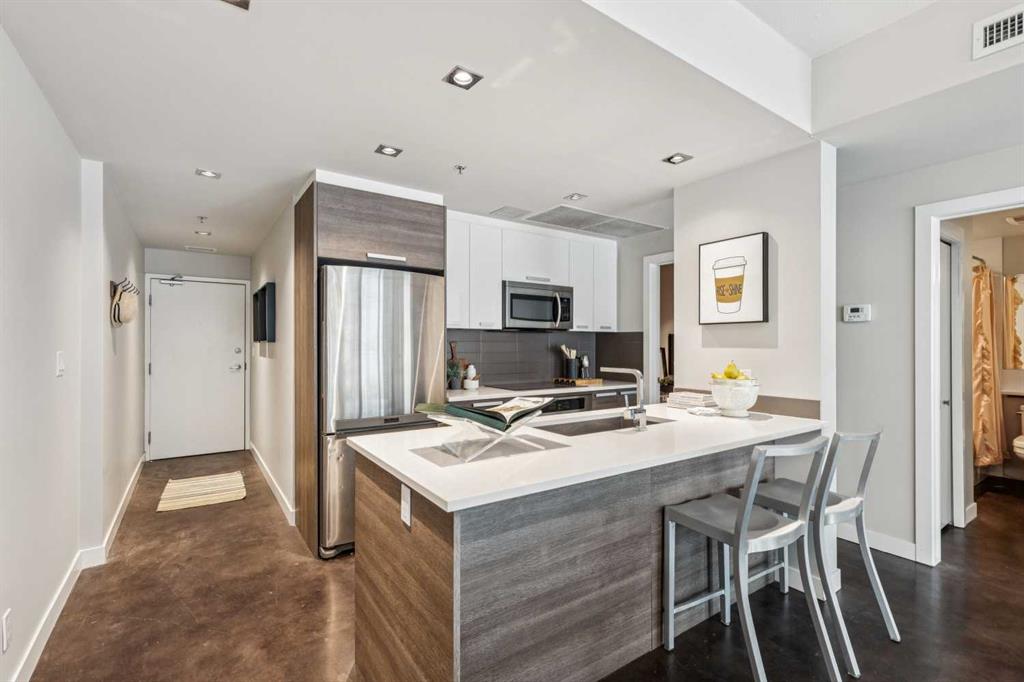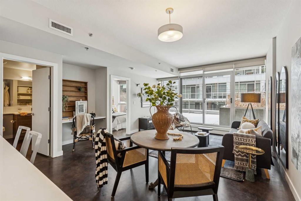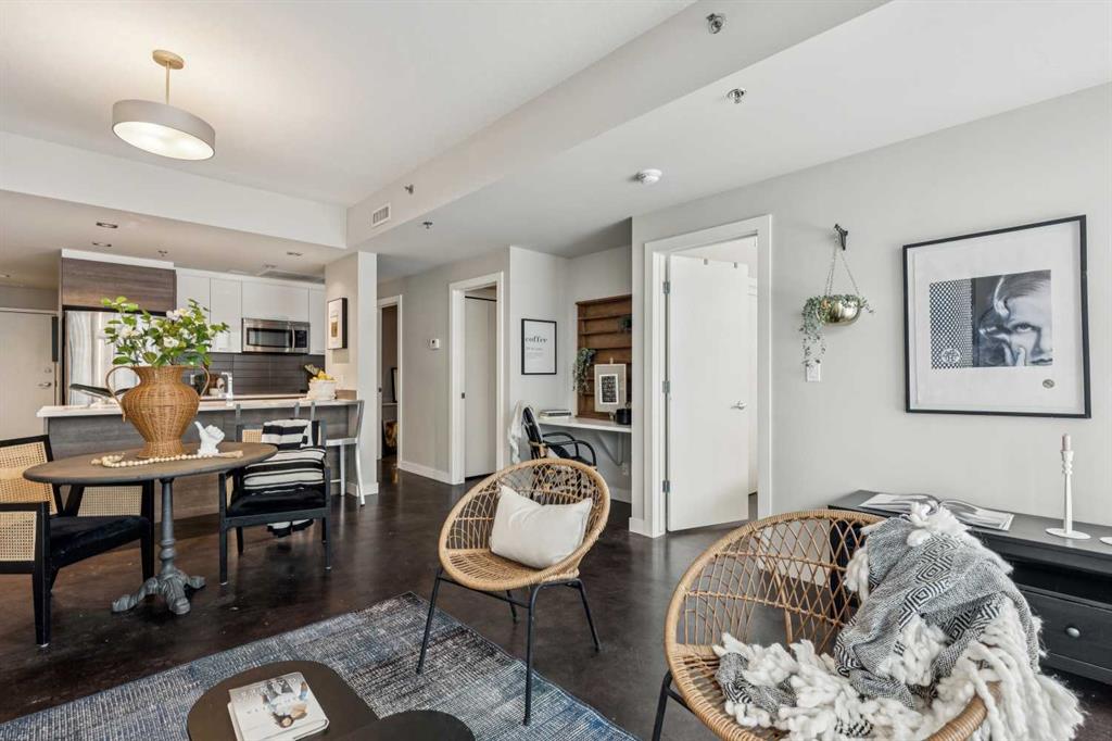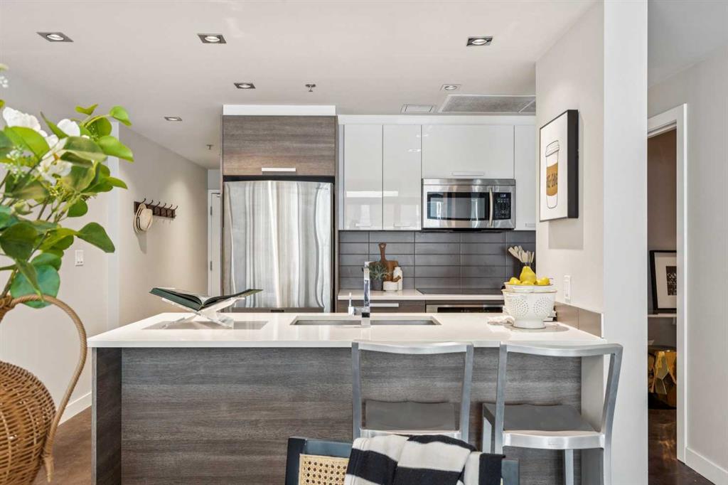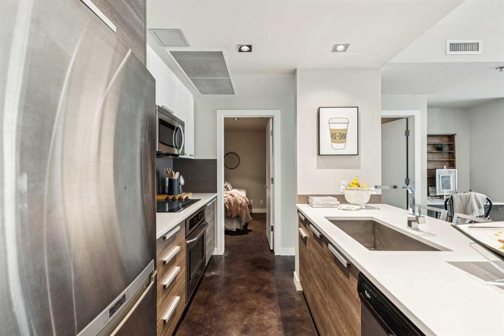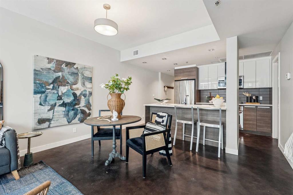 This one-bedroom plus den condo is built for those who want space, style, and convenience in one of Calgary’s most vibrant neighbourhoods. The standout feature? A massive 300-square-foot terrace—perfect for grilling, entertaining, or just unwinding with a drink in hand. Inside, the wide, open-concept living area (almost 14 feet wide!) gives this home the feel of a bungalow in the sky. 9-foot ceilings and polished concrete floors add an industrial-chic edge, while floor-to-ceiling windows flood the space with natural light. The kitchen is built for function and style, featuring wood-grain cabinets, a built-in oven, electric cooktop, and quartz countertops. Whether you’re cooking for one or hosting a dinner party, the large dining area and breakfast bar offer plenty of seating. The primary bedroom features custom closet solutions, while the main bath is both sleek and practical with a deep soaker tub, linen storage, and the convenience of an in-suite washer/dryer. The den is a versatile flex space, big enough for both a desk and a twin bed for guests. Living in Kensington means everything is at your doorstep—Orange Theory Fitness, great coffee shops, restaurants, a grocery store, and the C-Train, all just steps away. Plus, Pixel offers a rooftop patio with stunning city views, plenty of underground visitor parking, and this home includes a secure underground stall and storage unit. If you're looking for a bold, modern space with an unbeatable location, this is it.
