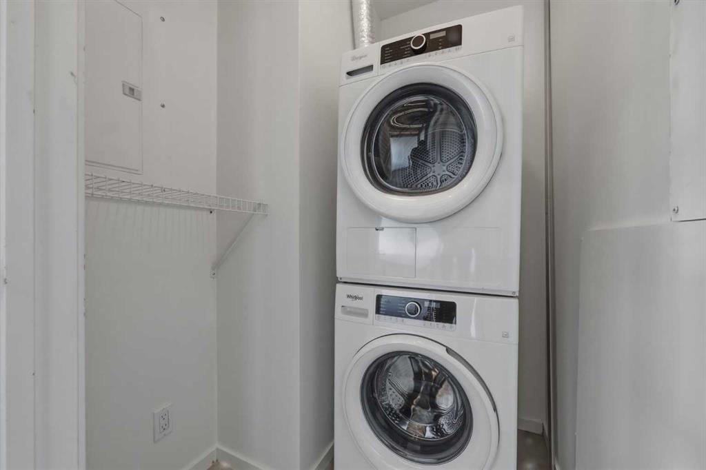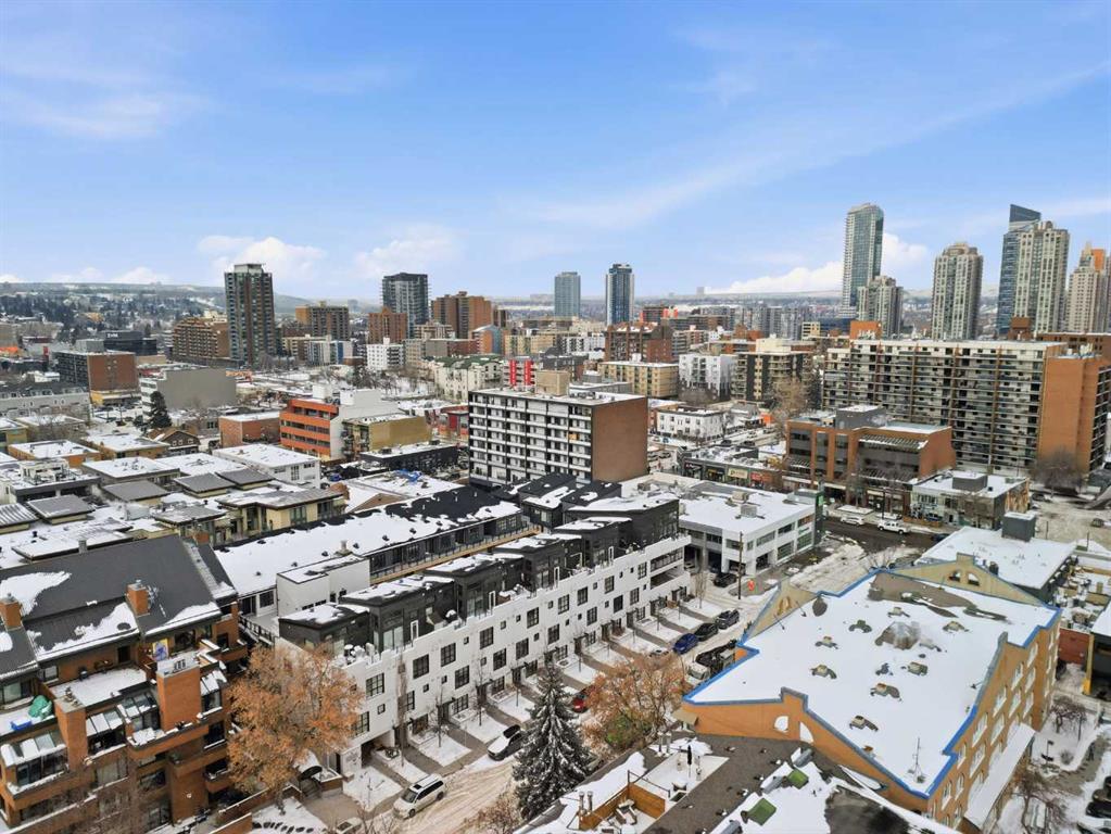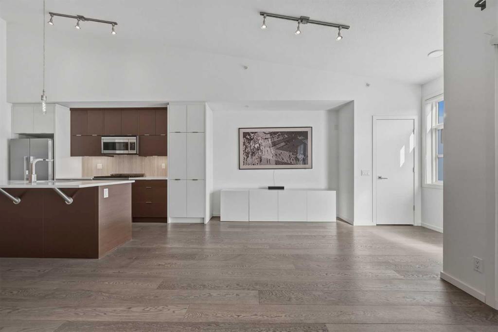 Lower Mount Royal – #433, 1719 9A Street SW: - New Price !! - Welcome to The Block built by Avi Urban. This modern, TOP FLOOR unit offers 612 sq ft of living space plus a 99 sq ft loft (not included in measurements due to ceiling height), 1 bedroom, 1 bathroom, and titled underground parking. The bright entry opens to a vaulted living area with room for both living and dining, along with sliding doors leading to the patio overlooking the courtyard. The kitchen features quartz countertops, tile backsplash, a pantry, and stainless steel appliances, including a gas range, fridge, dishwasher, and microwave. The impressive 13-foot ceiling height in the primary bedroom has been transformed into a unique lofted feature designed by Calgary’s Studio North, creating a space that is both practical and distinctive. Thoughtfully redesigned, the bedroom offers a flexible layout with a walk-in closet, home office/fitness space on the main level, complemented by the private lofted sleeping area. Additional highlights include hardwood flooring throughout, in-suite laundry, air conditioning, and separate storage in the underground parkade. Ideally located in the vibrant community of Lower Mount Royal, just half a block from the energy of 17th Avenue, this home offers an exceptional walkable lifestyle with shops, restaurants, cafes, amenities, and public transit all just steps from your door. This cool, unique space is a must-see. Turn key with quick possession available.