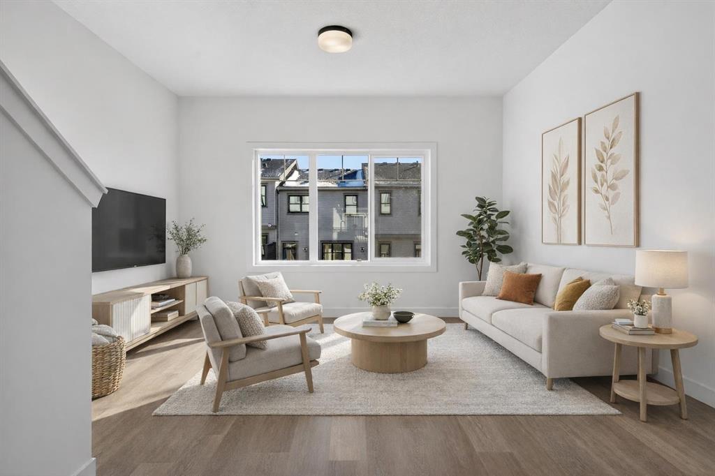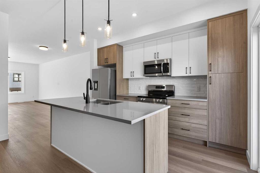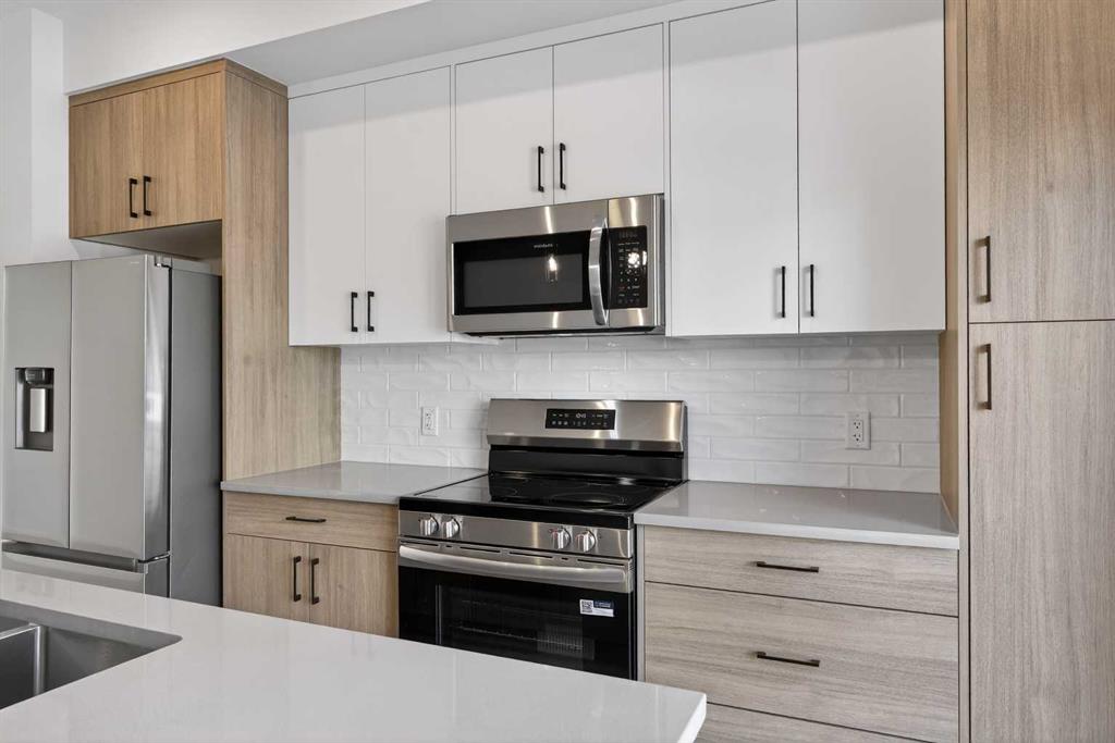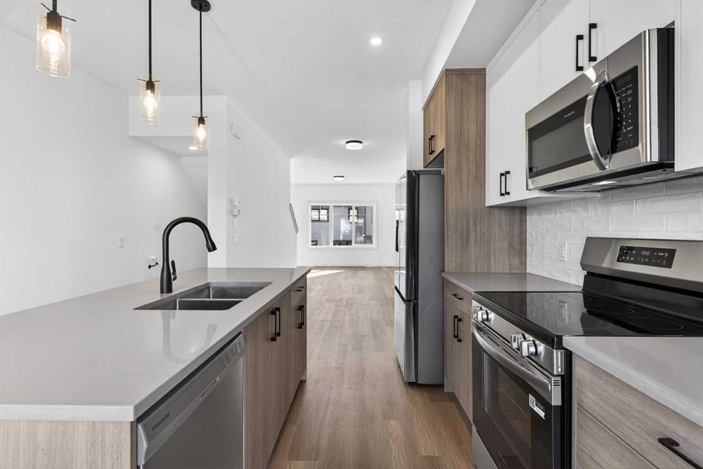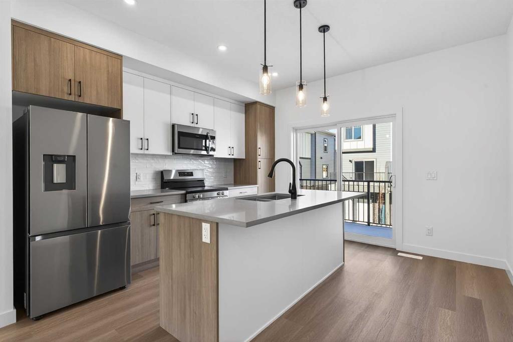 **Open House on Saturday : 1 pm-4 pm** Explore a series of stylish heritage-inspired row houses located near the center of our scenic Environment Reserve Park! This Heritage model A combines comfort and functionality, making it perfect for families and professionals. With 2 bedrooms, 2.5 bathrooms, and a flexible main-floor den, this expansive home is tailored for contemporary living. Upon entering, you will discover a bright ground-floor den or home office that includes a large window, a closet, and a handy powder room. Enjoy a beautifully landscaped front yard, a single attached garage, and additional parking in the driveway. The open-concept main floor features 9' ceilings and is bathed in natural light, creating a cozy and welcoming atmosphere for daily living or entertaining guests. The modern kitchen is equipped with quartz countertops, a breakfast bar, high-end stainless steel appliances, and a chimney-style range hood. Sliding doors lead to a full-sized balcony — perfect for unwinding or dining outside. On the upper level, there are two roomy bedrooms, including a primary suite that has a double access closet and a private ensuite with a stand-up shower and a sliding glass door. A second full 3-piece bathroom is available for the additional bedroom, which can also serve as a home office. The upper floor further includes a washer and dryer conveniently situated, a linen closet, and ample storage options throughout. This home is located in vibrant Springbank Hill and offers easy access to Aspen Landing, Rundle College, Griffith Woods, Ambrose University, restaurants, and senior care facilities. **The price includes GST. **All pictures are from show home #2225 81St SW.