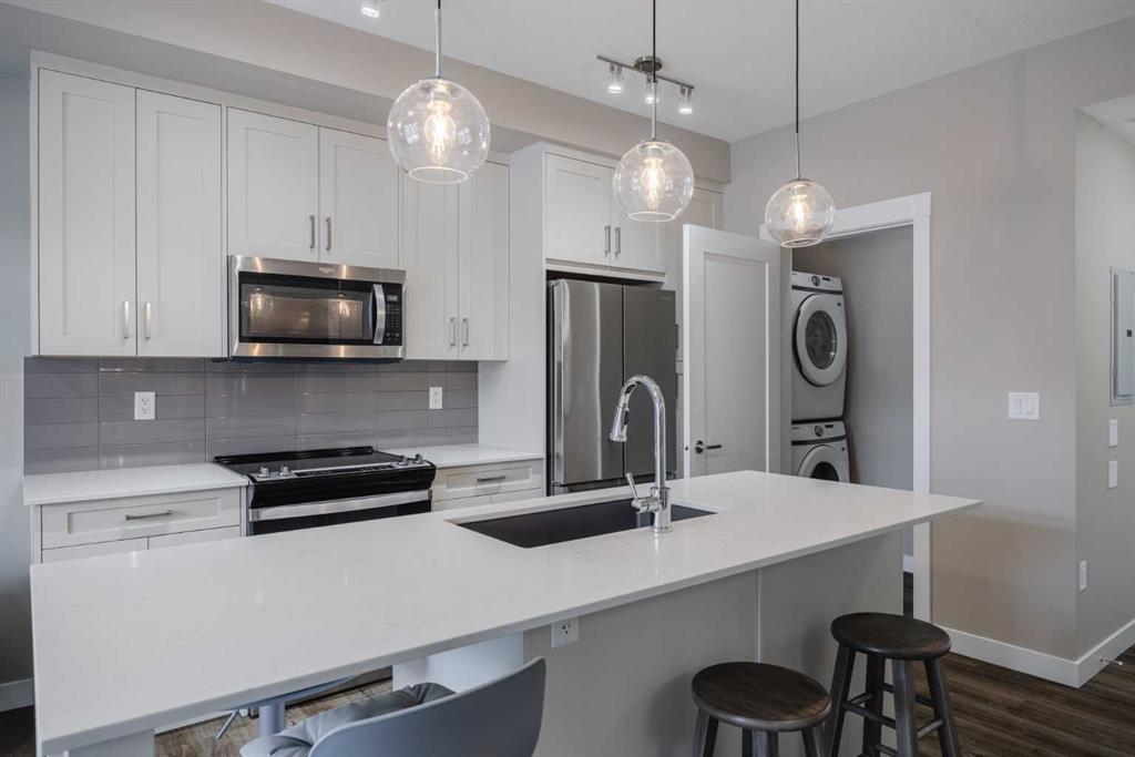 Freshly painted and in immaculate condition, this furnished 2 bedroom, 2 bathroom condo offers 757 builder square feet in a quiet location. Sold furnished, it may appeal to buyers looking for a move-in ready property or a turnkey rental opportunity. The unit features vinyl flooring throughout with no carpet, 9 foot ceilings, quartz countertops throughout, upgraded kitchen appliances, window coverings, and an HRV system for in-suite ventilation. The laundry room comes with extra storage space, and the primary bedroom offers two closets for additional storage. Quick possession is available if needed. The property includes titled underground parking with extra side clearance for easier access, along with a separate storage locker. Low condo fees add to the overall value. Located within about a 5 minute walk to Township Shopping Centre, with access to groceries, coffee shops, cafes, banks, a pharmacy, public transit, and nearby green spaces.