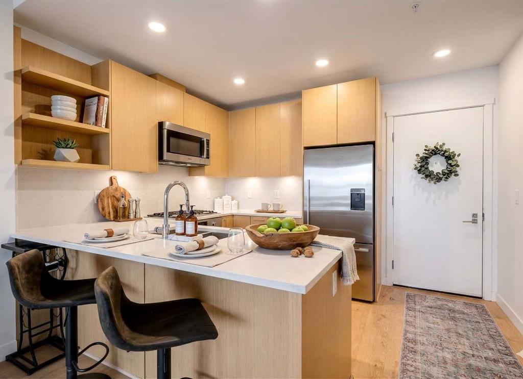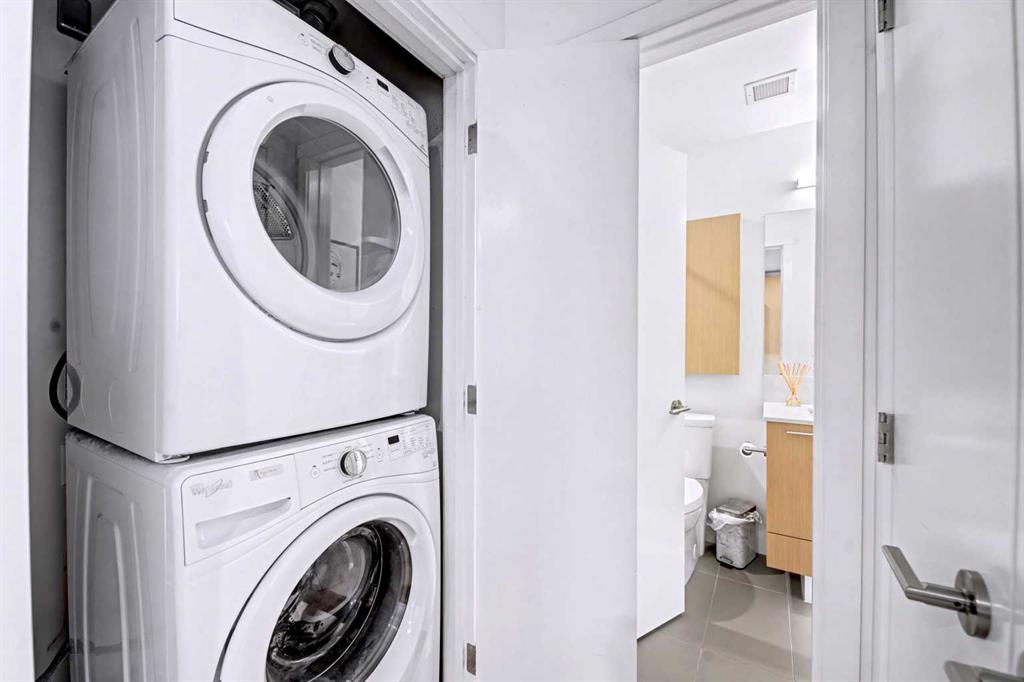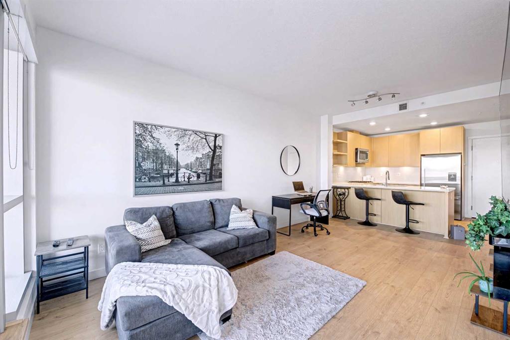 ***Open House Sunday, March 22nd 11:00 am to 12:30 pm.***Bridgeland is defined by its rhythm, a unique pocket of Calgary where historic character sits comfortably alongside a modern, high energy main street. Life here means having Murdoch Park across the street and the Bow River pathways just a short walk away. This 2019 built residence offers a front row seat to the best of the community, with immediate proximity to local staples like Una Pizza, Village Ice Cream, and the upcoming Native Tongues Taqueria. For those looking to see the space in detail, a virtual tour is available to view online. The interior is shaped by light, efficient geometry and has central AC. Concrete construction ensures a quiet environment, while floor to ceiling windows and high ceilings create a sense of volume that belies the square footage. The kitchen is anchored by a Bosch GAS RANGE and a Fisher & Paykel refrigerator, finished with beautiful quartz countertops. The layout transitions seamlessly into the living area, where a built-in Murphy bed offers clever flexibility for guests or a home office setup. The primary suite is a private retreat, highlighted by a modern, spa inspired ensuite featuring a double vanity with quartz countertops, sleek wood cabinetry, and a glass enclosed shower with marble style tile. Beyond the unit, the building prioritizes convenience; storage is located just down the hall on the same floor, and the LEED Platinum certification reflects a high standard for air quality and energy efficiency. Residents of Radius Bridgeland by Bucci enjoy a wide range of thoughtfully designed amenities throughout the building. The 7th floor features a rooftop patio with impressive views, while the 5th floor includes storage units, and the Spin Bike Room. The 4th floor offers a dedicated yoga room, and the 2nd floor includes the convenient Spud Room for parcel deliveries. On the main floor, residents have access to a fully equipped fitness centre and a concierge. The amenities within the building act as an extension of the home, providing professional grade fitness spaces, spin and yoga studios, and a concierge service. The rooftop patio serves as a central gathering point with clear views of the downtown skyline. When it is time to commute, the Bridgeland/Memorial CTrain station is nearby, connecting you to the downtown core in minutes without the need for a car. There’s no wasted space in this wonderful open concept layout. Featuring two bedrooms and two bathrooms across approximately 693 square feet of well maintained living space, the home is filled with natural light thanks to large windows and also offers a spacious balcony. The underground parking stall is conveniently located close to the elevator lobby, and residents can enjoy added amenities including a dog wash and car wash station. This is a great opportunity to own in one of the best buildings in Bridgeland. The property is vacant and move-in ready. Book your showing today!