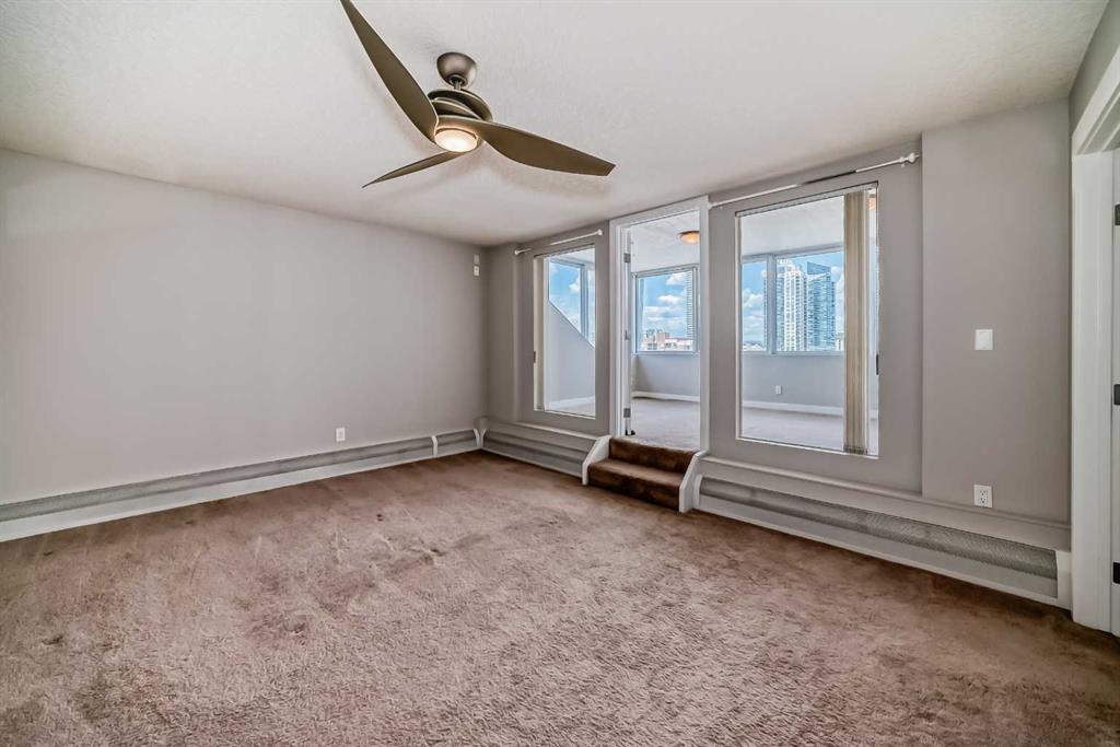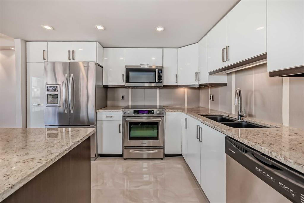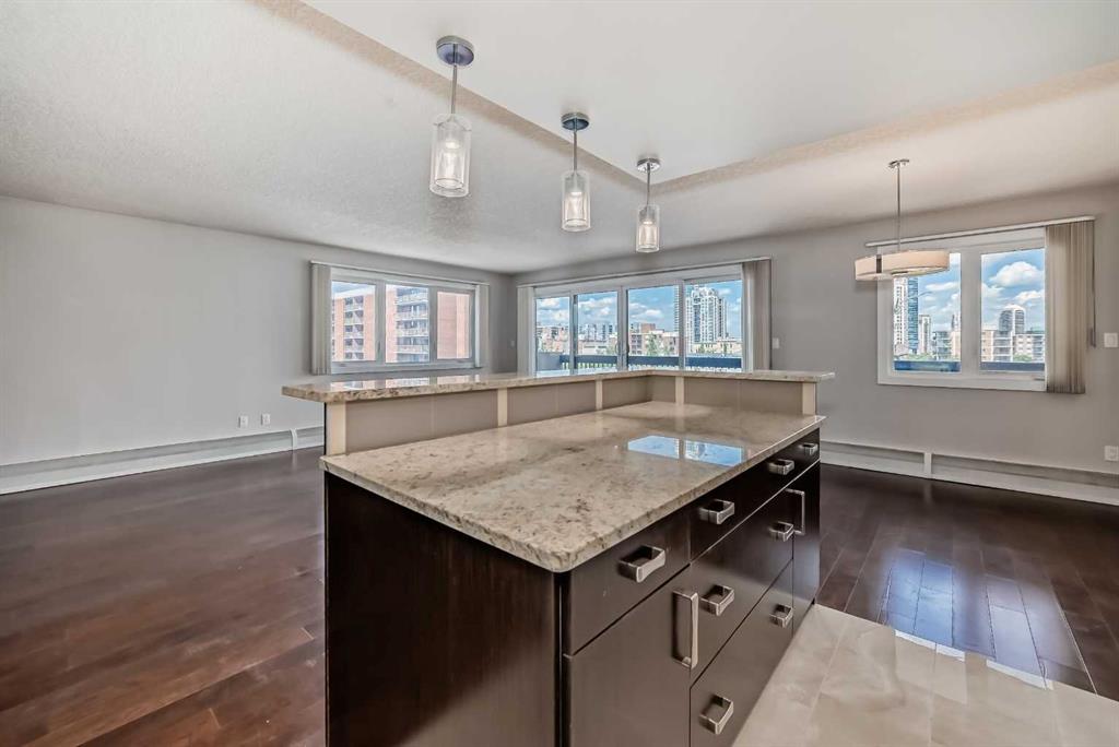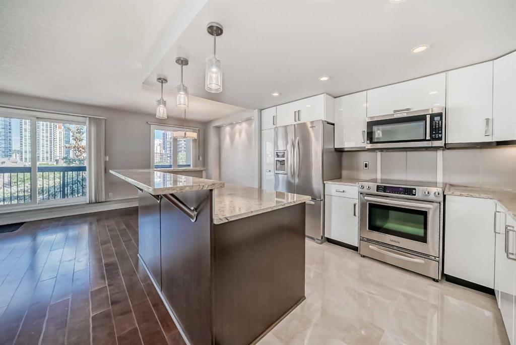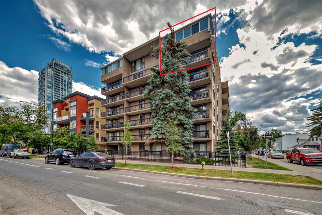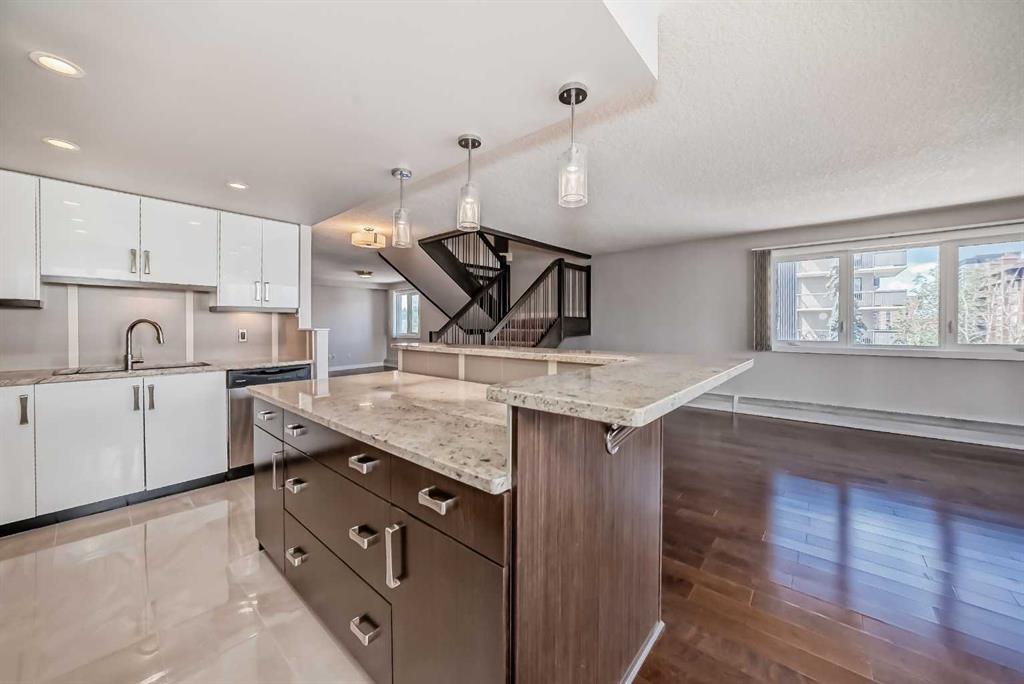 Check out this stunning 2 level top-floor penthouse condominium, offering luxurious living in the heart of the Beltline. A unique unit boasting over 2100 Square feet of renovated space. This exquisite 2-bedroom, 2.5-bathroom, two-story home boasts breathtaking city views and features a spacious and modern layout. The main floor is adorned with engineered wood floors and includes a large front closet and stylish powder room. The layout incorporates a vast great room that seamlessly combines 2 family rooms, kitchen, and dining area. The kitchen is a highlight with its gleaming white rear cabinets, a large dark island with breakfast bar, granite countertops, glissining tile and stainless steel appliances. Conveniently, there is a large laundry room with front-load machines and a sink, along with two in-suite storage rooms. The central dark maple staircase leads to the upper level, where you will find the grand master suite, which includes a private solarium or retreat, a spacious walk-in closet, and a spa-inspired en-suite bath featuring double sinks, a large Caesar stone vanity with ample cabinet space, and a glass shower with rain head. The second bedroom is generously sized with a sizable walk-in closet. The main bath offers a luxurious oversized air tub, a separate shower, and a stylish vanity. A second entry door is located on this floor to access the building hallway. Additional amenities include two underground parking stalls, two large storage units. This pet-friendly condo (for small dogs with prior approval) provides exceptional value and a unique, stylish living experience. Walking distance to 17th avenue, coffee shops, restaurants and plenty of parks. Easy access to transit. Book your showing today!