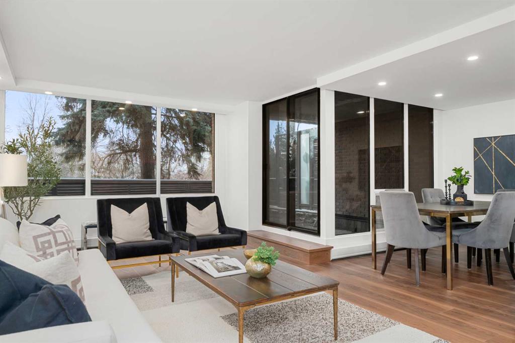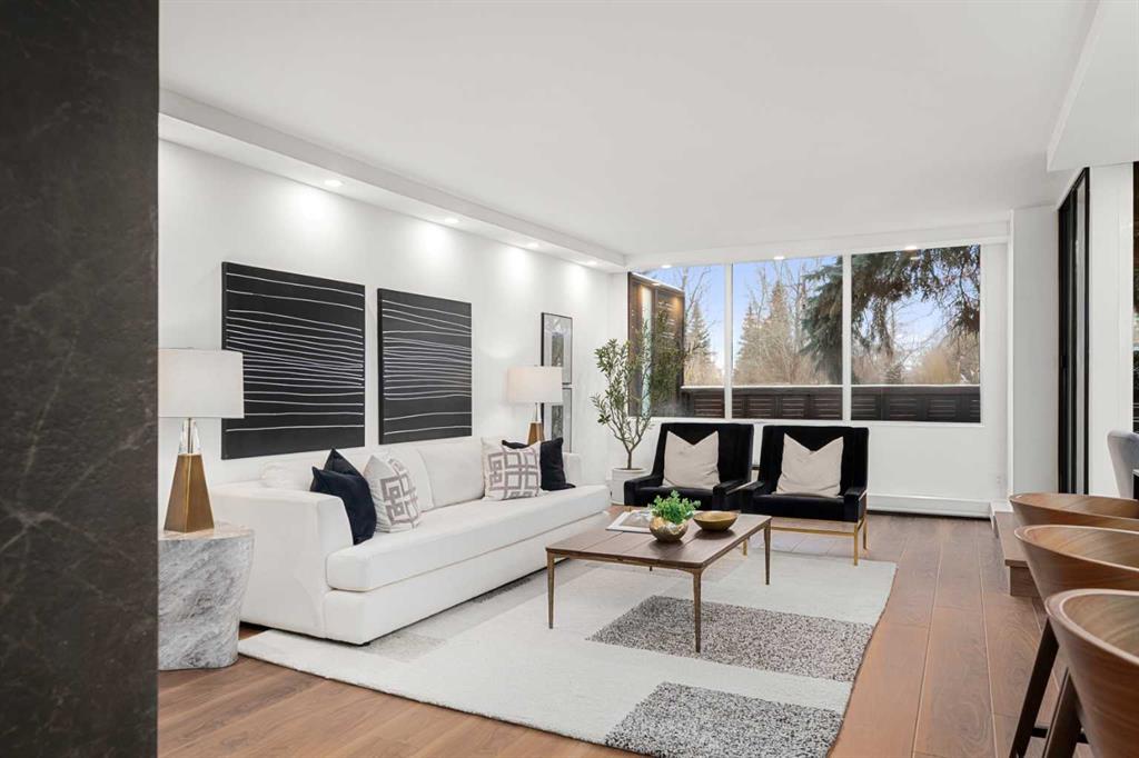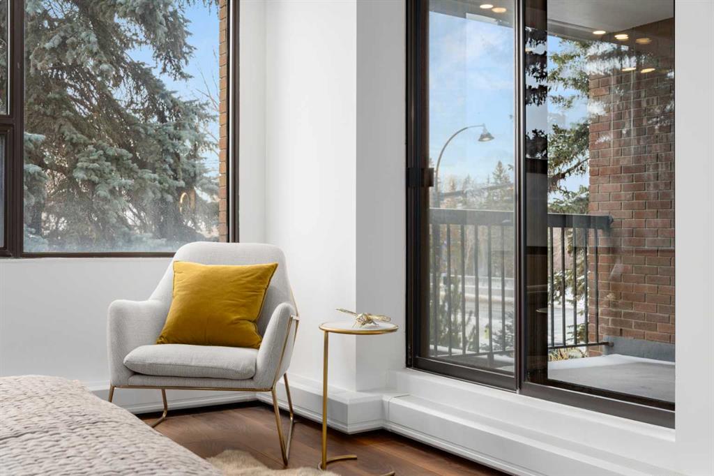 Rarely does a residence of this calibre become available—particularly one of the highly sought-after main-floor, south-facing townhomes with private yard access and river views. Recently redesigned with attention to detail, this two-level home offers the comfort and flow of a modern single-family residence, paired with the prestige and convenience of executive condo living in Roxboro House. The main floor unfolds in a bright, airy expanse framed by oversized south-facing windows that flood the space with natural light. A dramatic 74” Dimplex fireplace, wrapped in porcelain slab, anchors the living area and sets a sophisticated tone. The open-concept kitchen is a true showpiece, showcasing custom Metro cabinetry, porcelain countertops and backsplash, brand-new Samsung smart appliances, a Zephyr wine cooler, and designer Delta fixtures. Premium Coretec/HQ luxury vinyl flooring runs seamlessly throughout, while Cartwright lighting and an integrated bulkhead design elevate the architectural finish. From the living area, step directly into your private fenced yard and patio—an exceptionally rare offering in this buiilding hat delivers the ease of outdoor living within a luxury building. A beautifully appointed main-floor powder room adds both style and practicality for guests.m Upstairs, sleek glass railings lead to a striking imported wallpaper feature wall—an artful statement that reflects the thoughtful design carried throughout. At the top of the stairs, a dedicated library or home office provides a quiet, inspiring retreat, perfectly removed from the activity below. The upper level is designed with comfort and privacy in mind. The principal suite is a refined sanctuary, complete with a custom feature wall, built-in side tables, a spacious walk-in closet, and an elegantly finished ensuite with tile and glass shower. A private balcony extends from the bedroom, offering tranquil views of the Elbow River and the tree-lined streets of Rideau Park—the perfect setting for morning coffee or an evening unwind. The second bedroom also enjoys river views and features integrated custom cabinetry to maximize storage and functionality. A full bathroom is conveniently located across the hall, and the upper-level laundry area adds everyday ease and efficiency. Life here extends well beyond your front door. Residents of Roxboro House enjoy a full suite of amenities, including professional concierge service, an indoor pool and hot tub, a well-equipped fitness centre, a party room for entertaining and secure underground parking. Outside, the location is unmatched—river pathways are directly across the street; boutique shops, high-end retailers, and specialty services are all within walking distance; and groceries sit just steps from your door.