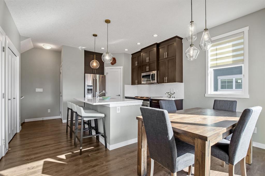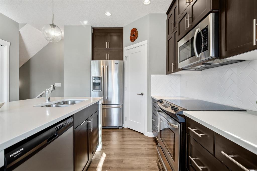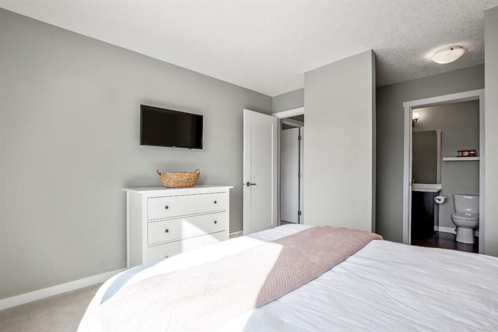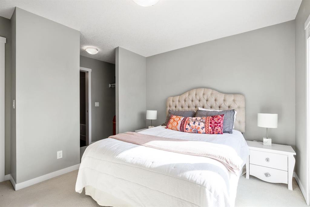 Welcome to this bright and stylish 3 storey corner unit townhome in the sought-after community of Nolan Hill, offering over 1,325 sq. ft. of living space in a very well-managed complex close to parks, ponds, pathways, shops, and restaurants. The main living level features 9’ ceilings and an open-concept layout with a spacious living room, dining area, and a modern kitchen complete with quartz countertops, stainless steel appliances, updated lighting and hardware, and a large central island. Sliding doors off the dining area lead to a sunny south-facing deck. Upstairs you’ll find two spacious bedrooms, each with its own 4-piece ensuite, making this an ideal layout for roommates, guests, or a home office setup. The primary bedroom also features a walk-in closet. A main level powder room & laundry room add extra convenience. The entry level offers a welcoming foyer and access to the attached single garage with additional storage/mechanical space. Located just minutes from major shopping including Costco, Walmart, Home Depot and Canadian Tire, along with restaurants, schools, playgrounds, and extensive walking paths throughout the community. A great opportunity for first-time buyers, professionals, or investors looking for low-maintenance living in a fantastic NW community.