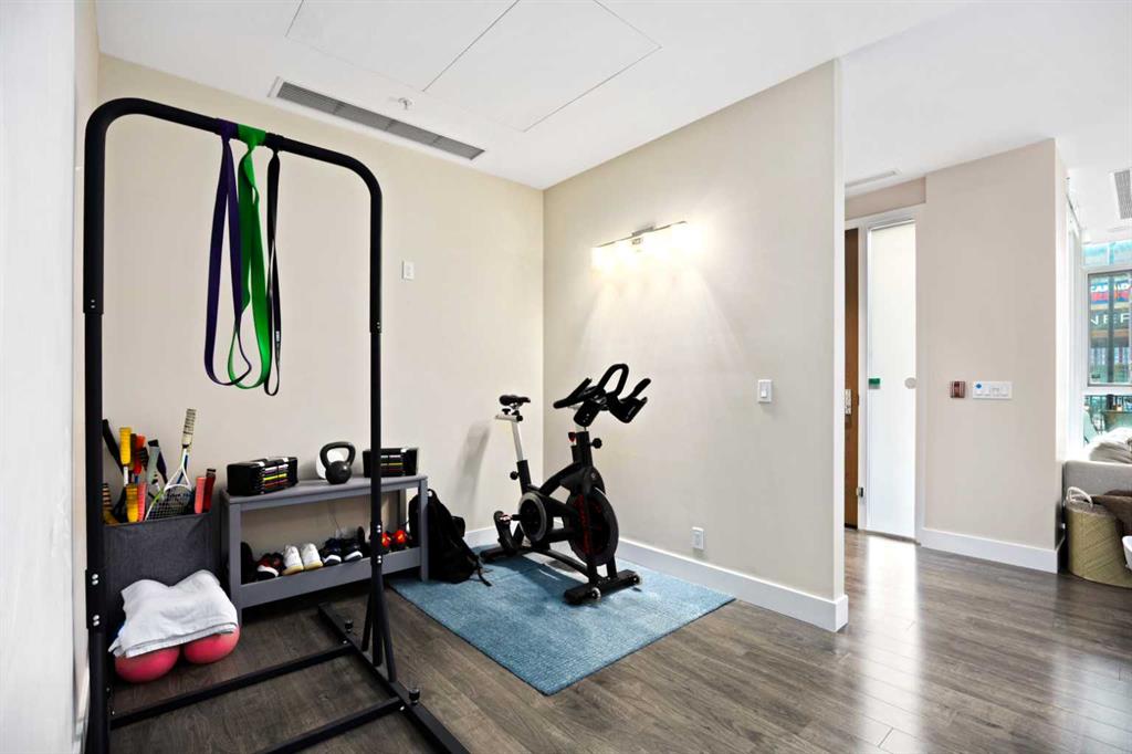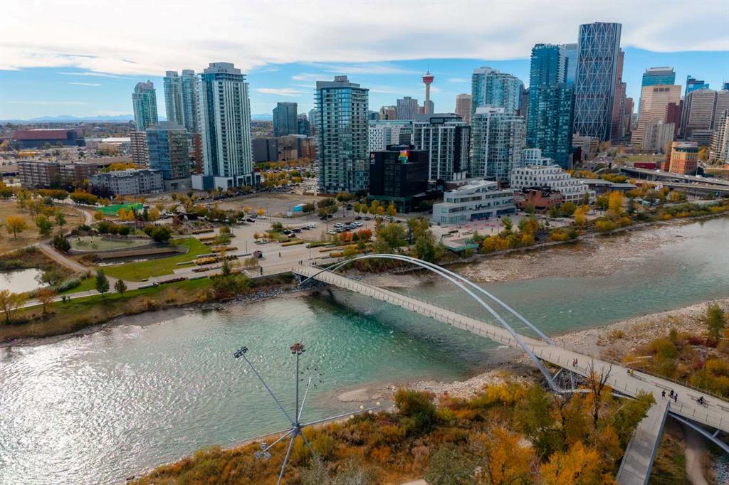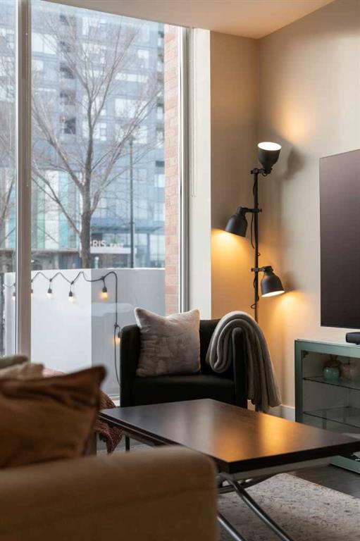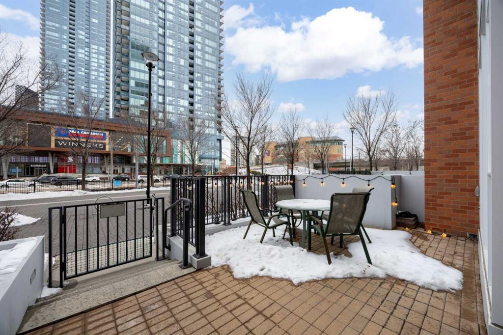 Welcome to Evolution, where modern design meets effortless urban living in the heart of Calgary’s vibrant East Village. This rare two-storey ground-floor townhouse-style residence offers nearly 1,300 sqft. of thoughtfully designed living space, combining the privacy of a townhome with the convenience and amenities of a full-service condominium building. With two private entrances including direct street access and a spacious patio, this home offers a unique and flexible lifestyle ideal for professionals, downsizers, or investors seeking low-maintenance living in a dynamic inner-city location. The main level features a bright open-concept layout anchored by floor-to-ceiling windows that fill the space with natural light. The modern kitchen showcases two-tone cabinetry, light granite countertops, stainless steel appliances, a 5-burner gas range, and new microwave (2022) complemented by a generous eat-up island perfect for casual dining or entertaining. A versatile flex area offers space for a dining room, home office, or fitness area, while a convenient powder room and pantry complete the main level. Durable laminate flooring provides both style and practicality throughout this space. Upstairs, the spacious primary retreat features two separate closets, floor-to-ceiling windows, and a spa-inspired ensuite complete with dual vanities, a soaker tub, glass-enclosed shower, in-floor heating, and abundant storage. The second bedroom offers its own private ensuite, ideal for guests, kidsroom or roommates. The upper level is further enhanced by a new stackable LG washer and dryer (2025) and additional linen storage. Additional highlights include secure underground tandem parking with drive-through access, a convenient ground-floor storage locker, and the flexibility of entering the home directly from the street or through the building’s interior. Residents of Evolution enjoy an exceptional array of luxury amenities, including a fitness centre, sauna and steam rooms, owners’ lounge, concierge service, and a beautifully designed rooftop garden with BBQ areas for summer entertaining. Located just steps from Calgary’s river pathways, the C-Train, grocery stores, and some of the city’s most sought-after restaurants and cultural destinations, including Nupo, Charbar, the Simmons Building, Phil & Sebastian Coffee, Parlour Ice Cream, Studio Bell, the King Eddy, Calgary Central Library and the emerging Flames Entertainment District. Offering a vibrant, walkable lifestyle with the ease of lock-and-leave living, this exceptional residence presents a rare opportunity to enjoy the best of inner-city Calgary. Perfect for professionals, investors, or those looking to downsize without compromise. The unit has been consistently rented for the past six years, demonstrating strong rental appeal.