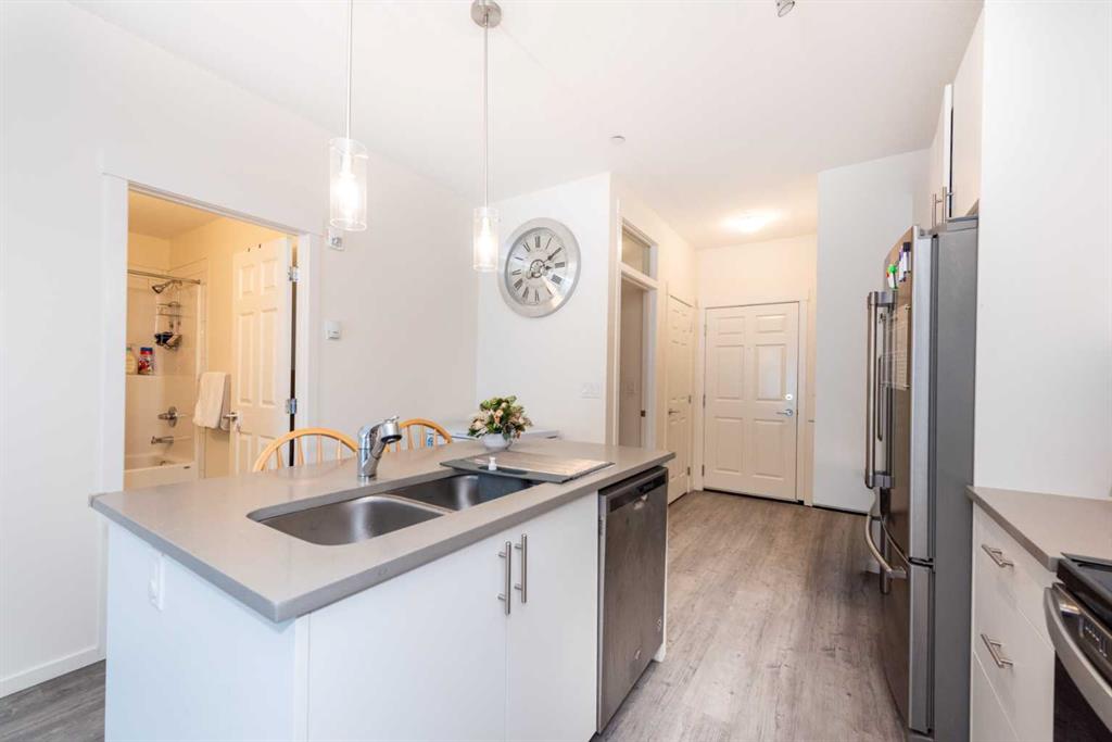 MODERN 2 BEDROOM | SOUTH-FACING BALCONY | TITLED UNDERGROUND PARKING | PET FRIENDLY Welcome to this beautifully maintained and modern condominium located in the highly desirable community of Legacy, where vibrant urban convenience meets scenic natural surroundings. This stylish 2-bedroom, 2-bathroom home, built less than five years ago, offers a thoughtfully designed layout ideal for first-time buyers, investors, or those seeking low-maintenance living in one of Southeast Calgary’s most popular communities. Step inside to discover a bright and inviting open-concept living space featuring high ceilings, large windows, and contemporary finishes throughout. The modern kitchen is both elegant and functional, showcasing stone countertops, stainless steel appliances, abundant cabinetry, and a spacious breakfast bar island—perfect for casual dining, entertaining guests, or everyday living. The comfortable living area leads to a sun-filled south-facing balcony, the perfect place to enjoy your morning coffee or unwind in the evening. With a natural gas BBQ hookup, outdoor cooking and summer entertaining become effortless. The primary bedroom retreat features a walk-through closet leading to a private 3-piece ensuite bathroom, while the second bedroom offers flexibility for guests, a home office, or additional living space. A second full 4-piece bathroom and in-suite laundry add everyday convenience. This home also includes a titled underground parking stall and a dedicated storage cage, both conveniently located close to the elevator for easy access. Pet lovers will appreciate the pet-friendly building (with board approval) and the incredible lifestyle Legacy offers. Enjoy nearby parks, scenic walking paths, ponds, playgrounds, and green spaces, along with easy access to shopping, restaurants, schools, and major routes including Macleod Trail and Stoney Trail. Whether you're looking for a comfortable place to call home or a smart investment opportunity, this modern Legacy condo delivers the perfect combination of style, location, and lifestyle. Book your private showing today and experience everything Legacy living has to offer.