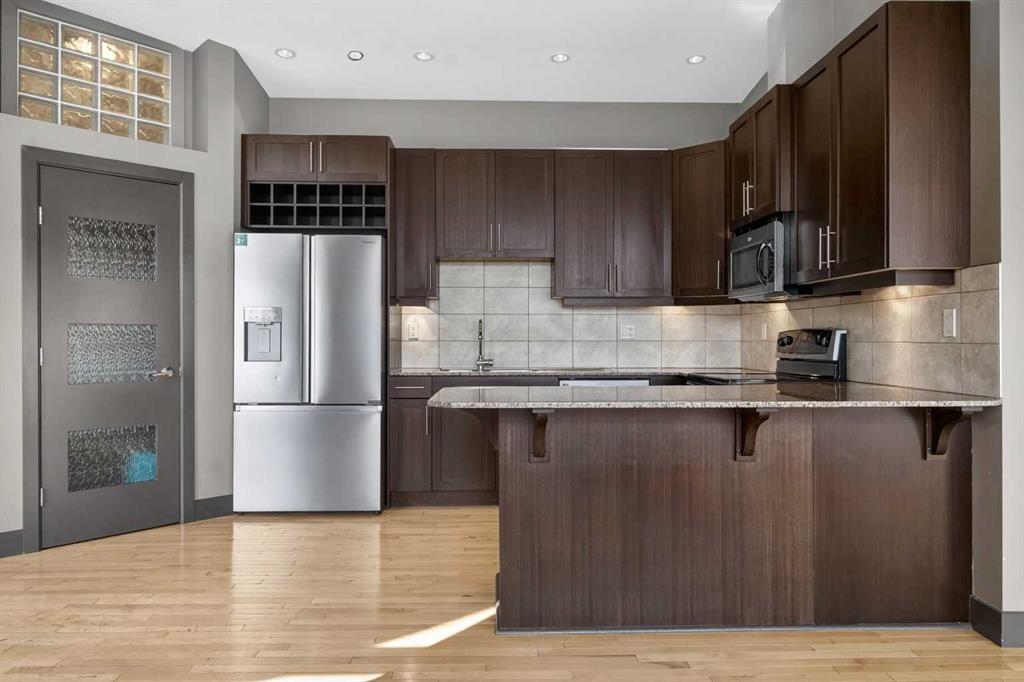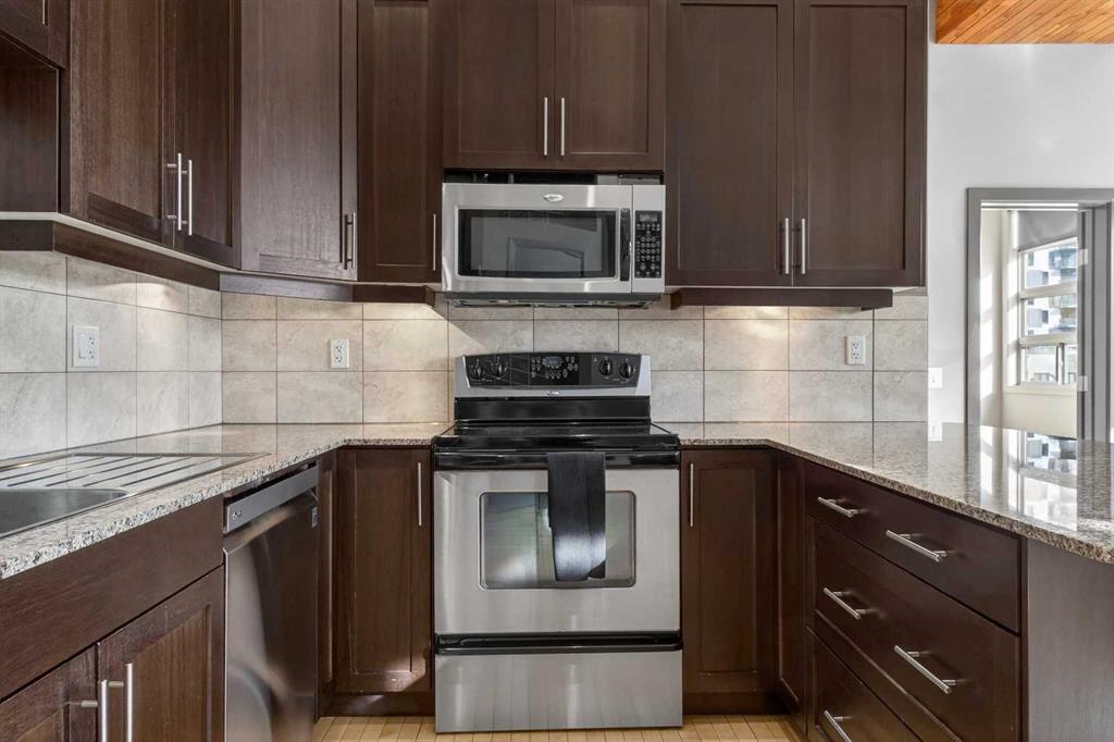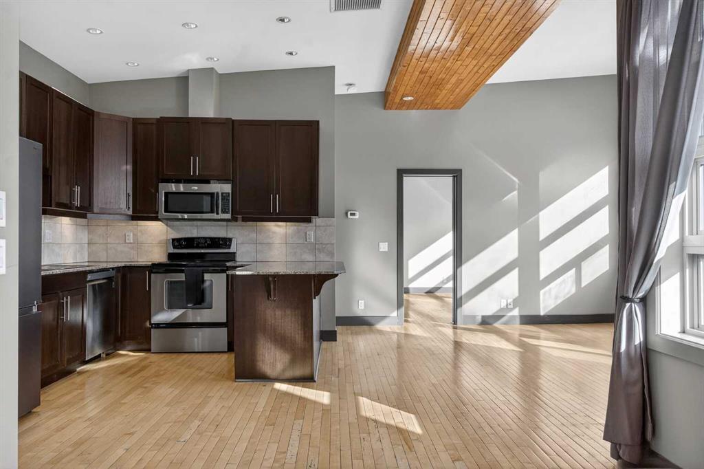 Experience luxury living at its finest in this stunning Crescent Heights penthouse, perfectly situated just moments from downtown. Boasting 2 bedrooms and 2 full bathrooms, this residence combines sophisticated design with unparalleled convenience. Step into the open-concept layout, enhanced by vaulted ceilings with striking accent beams and gleaming light-colored hardwood floors. South-facing windows flood the space with natural light while framing stunning city skyline views. Relax by the cozy gas fireplace or enjoy year-round comfort with central A/C. The gourmet kitchen is a chef’s dream, featuring stainless steel appliances, granite countertops, and a walk-in pantry, complemented by numerous thoughtful upgrades throughout. The spacious bedrooms offer both comfort and style, while the spa-inspired master suite includes a walk-in steam shower and double large closets. Step out from the living room onto the big balcony, perfect for BBQs and entertaining while enjoying spectacular views. Additional perks include 2 assigned covered parking stalls and its own assigned storage unit. Nestled in a prime inner-city location, you’re within walking distance to the trendy Bridgeland strip, Bow River, East Village, Kensington, Downtown, and the Bow River Pathway system. Explore nearby premier restaurants and lush city parks—everything you need for vibrant city living. This penthouse isn’t just a home; it’s a statement of style, comfort, and convenience. Don’t miss the chance to own this exceptional residence!